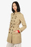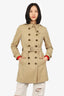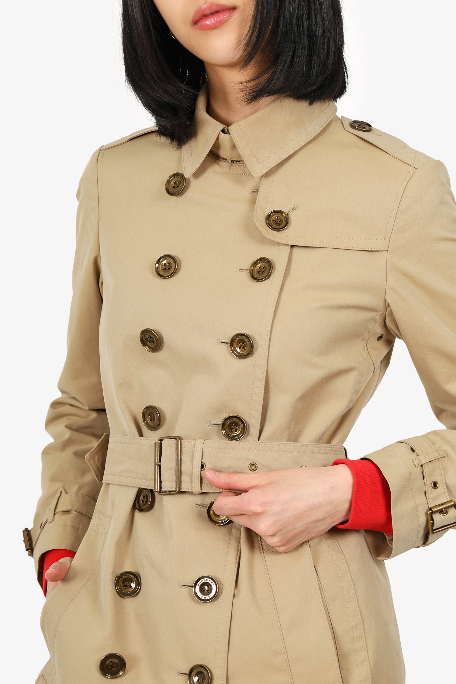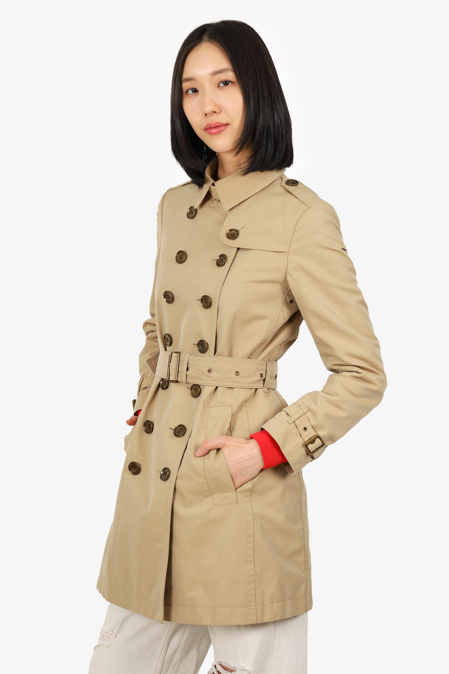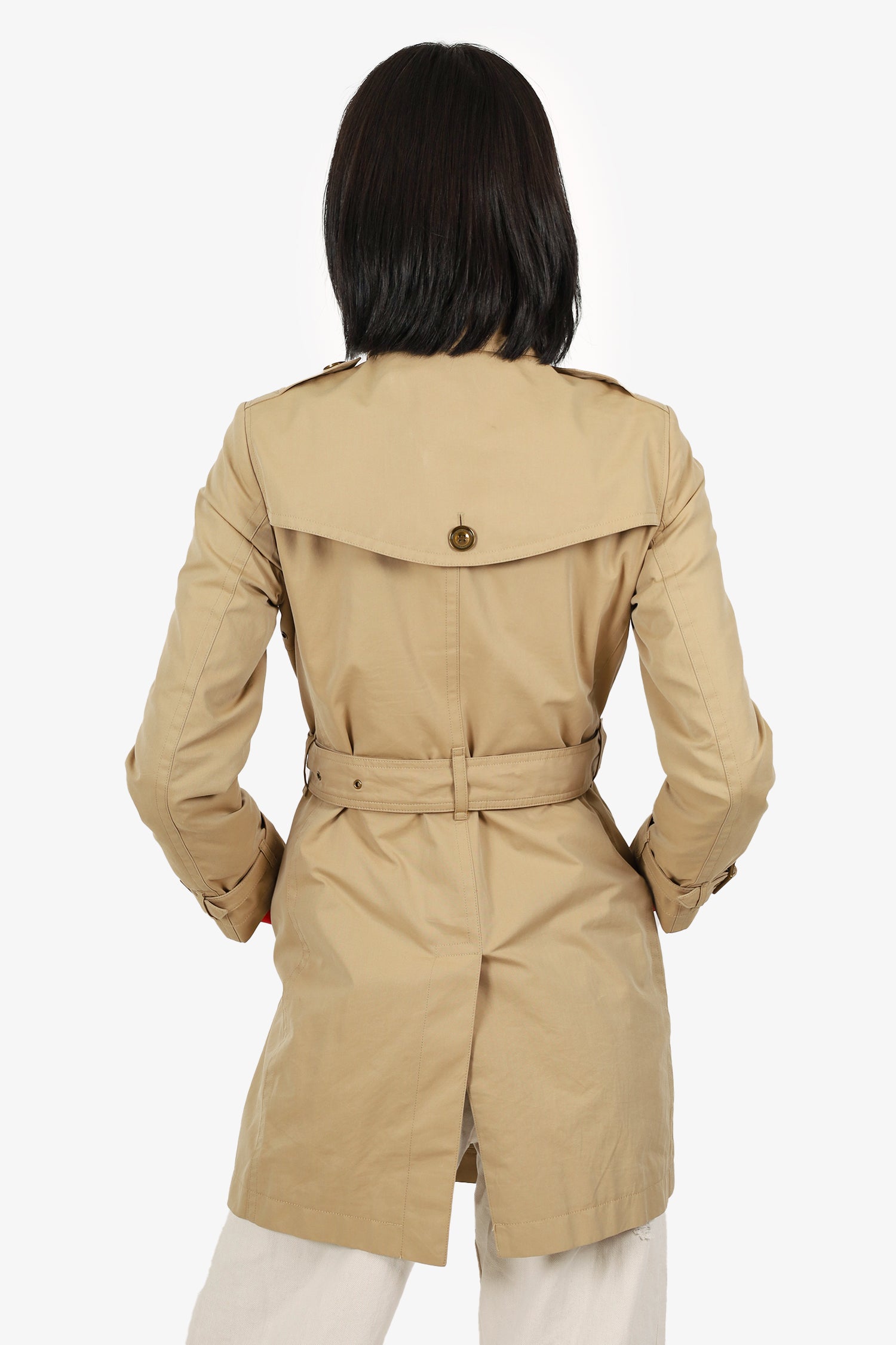 Refresh availabilityBurberry Beige Short Trench Coat. Front button-up with hook closure. 2 front slip pockets. Adjustable pull-through belt at waist. Adjustable pull-through closure at sleeve cuffs. Gold-tone hardware. Tonal stitching.