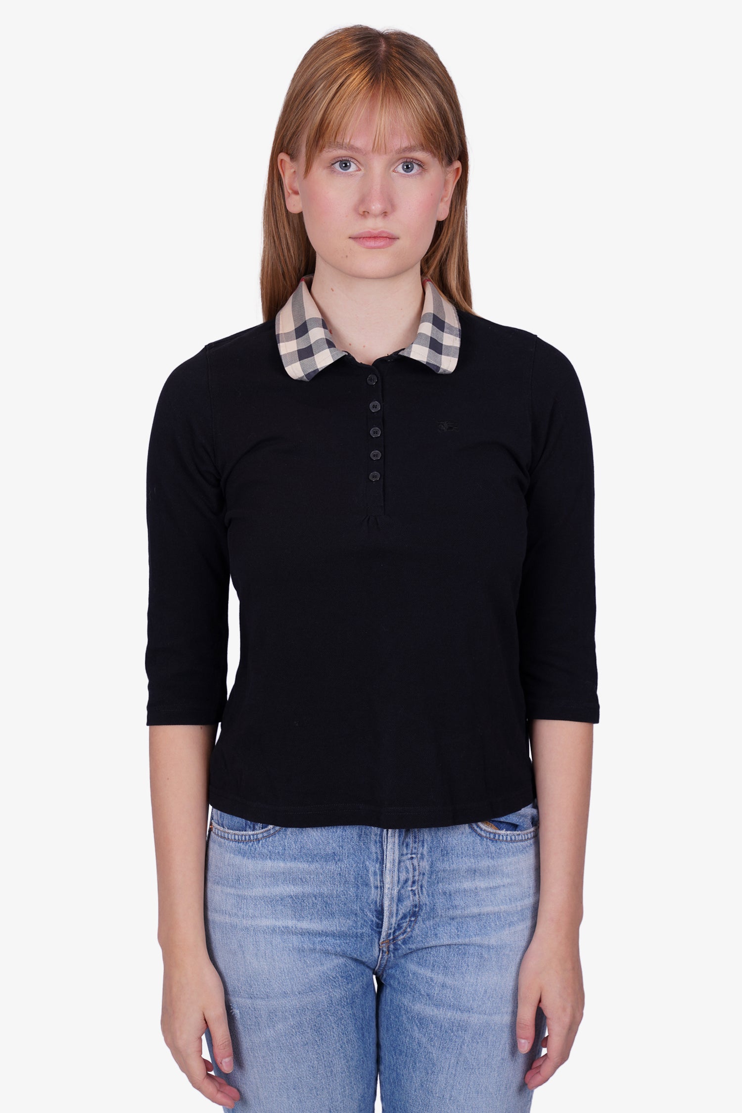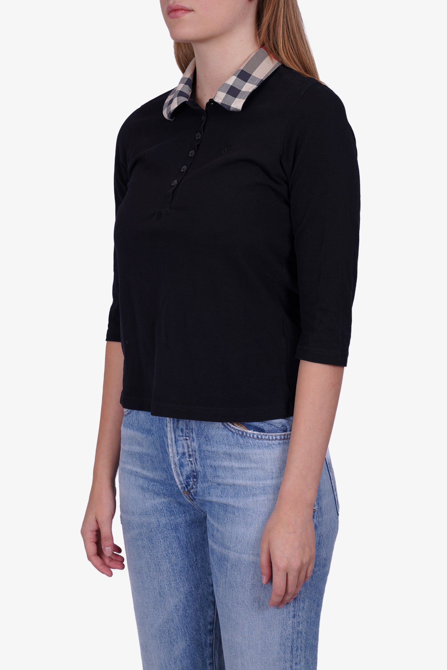 Refresh availabilityBurberry Black 3/4 Sleeve Cotton Collared Shirt. Collared neckline with front button closure. Tonal stitching.