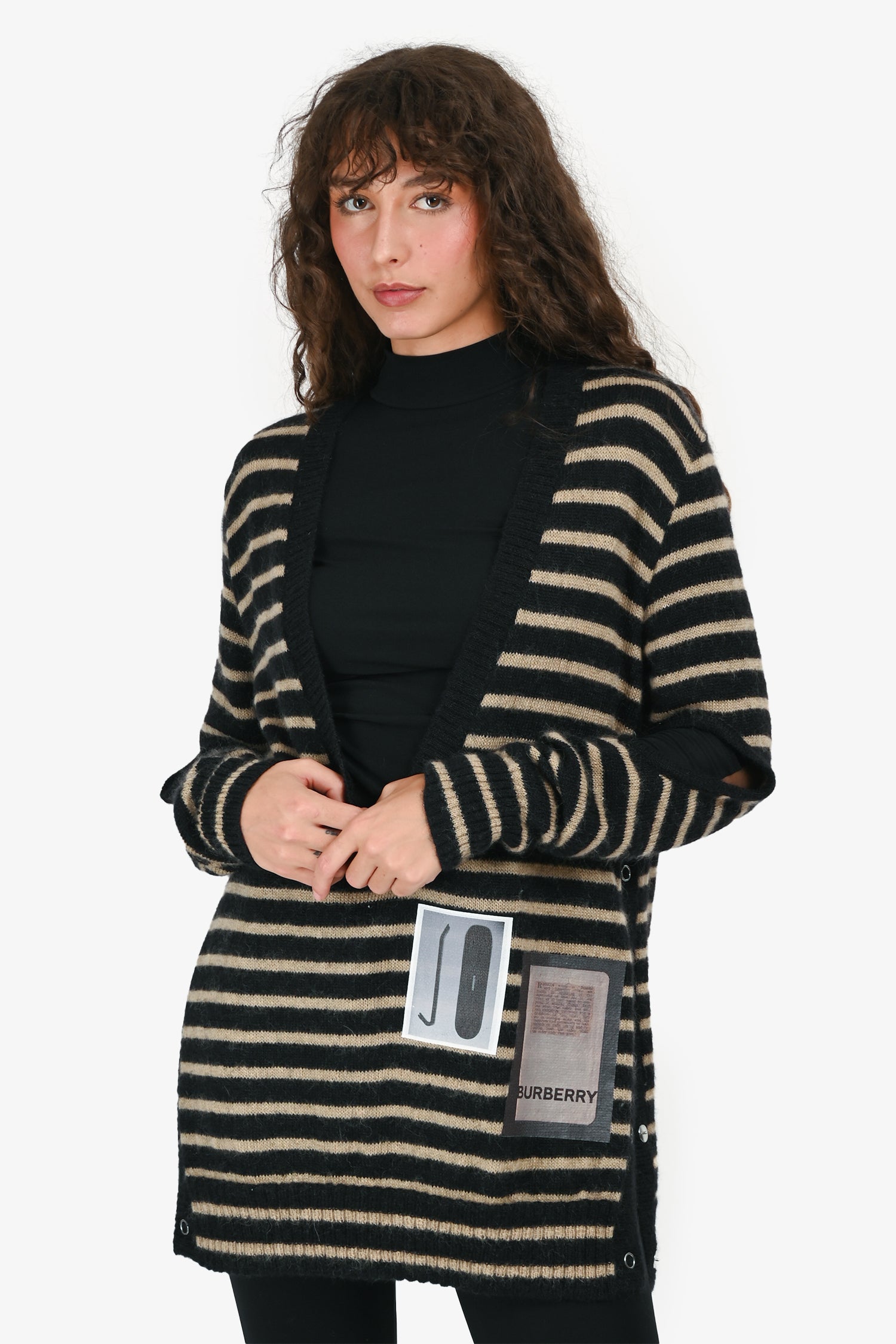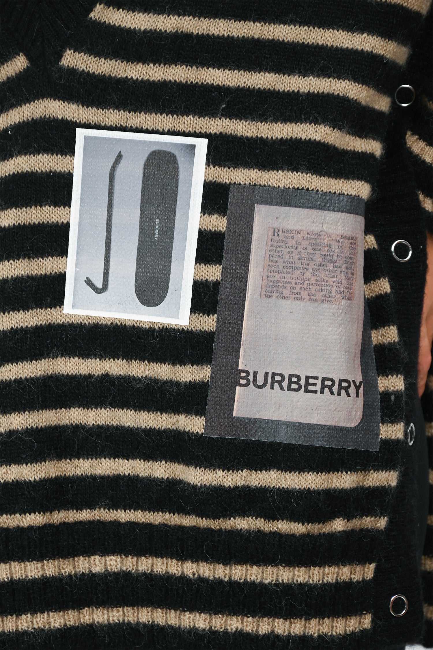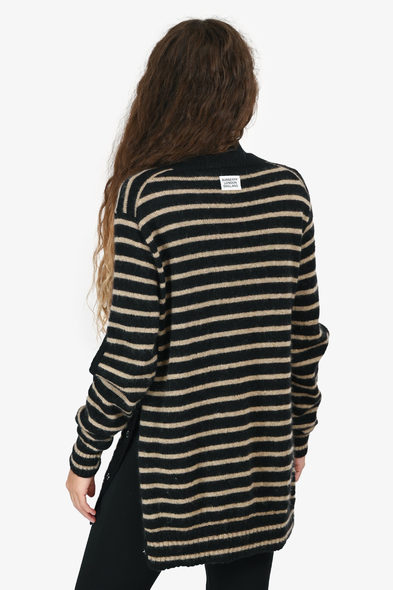 Refresh availabilityBurberry Black/Beige Knit Striped V-Neck Sweater. Pull-on. Front patch detail. Cut-out detail on the sleeves. Side snap-button closures. Silver-tone hardware. Tonal stitching.