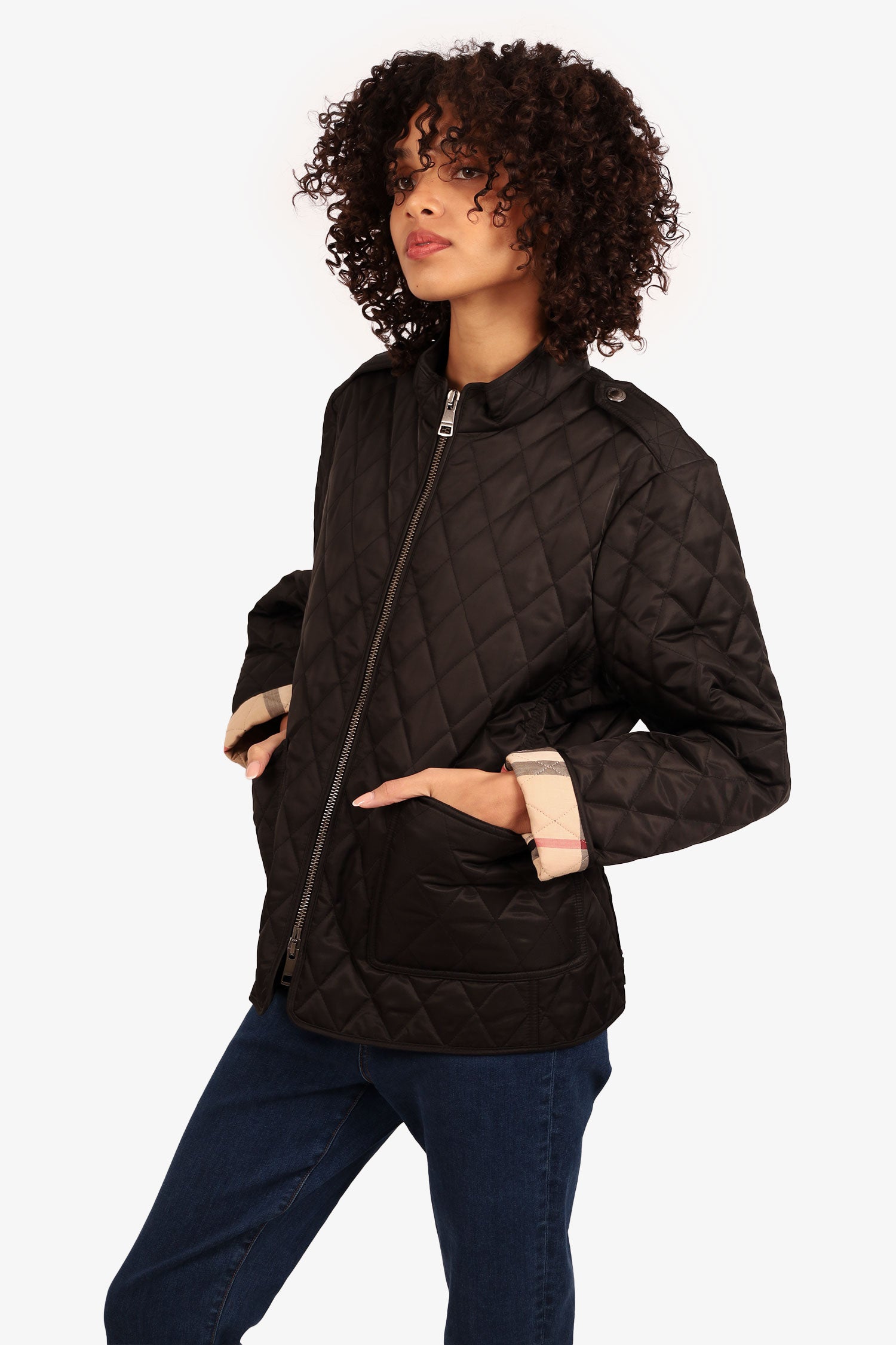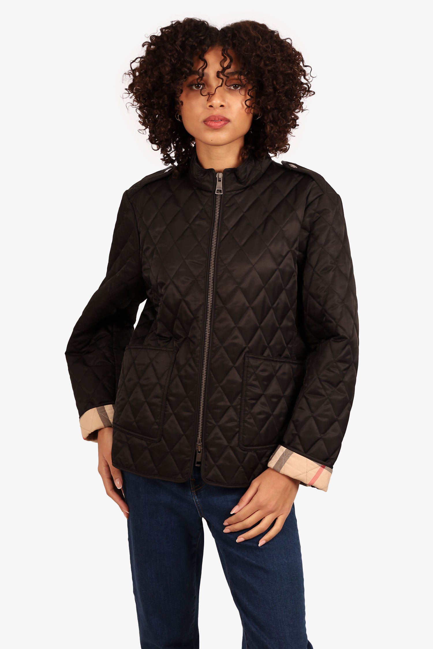 Refresh availabilityBurberry Black Diamond Quilted Zip-up Jacket. Front zip closure. 2 front slip pockets. Burberry print lining. Tonal stitching.