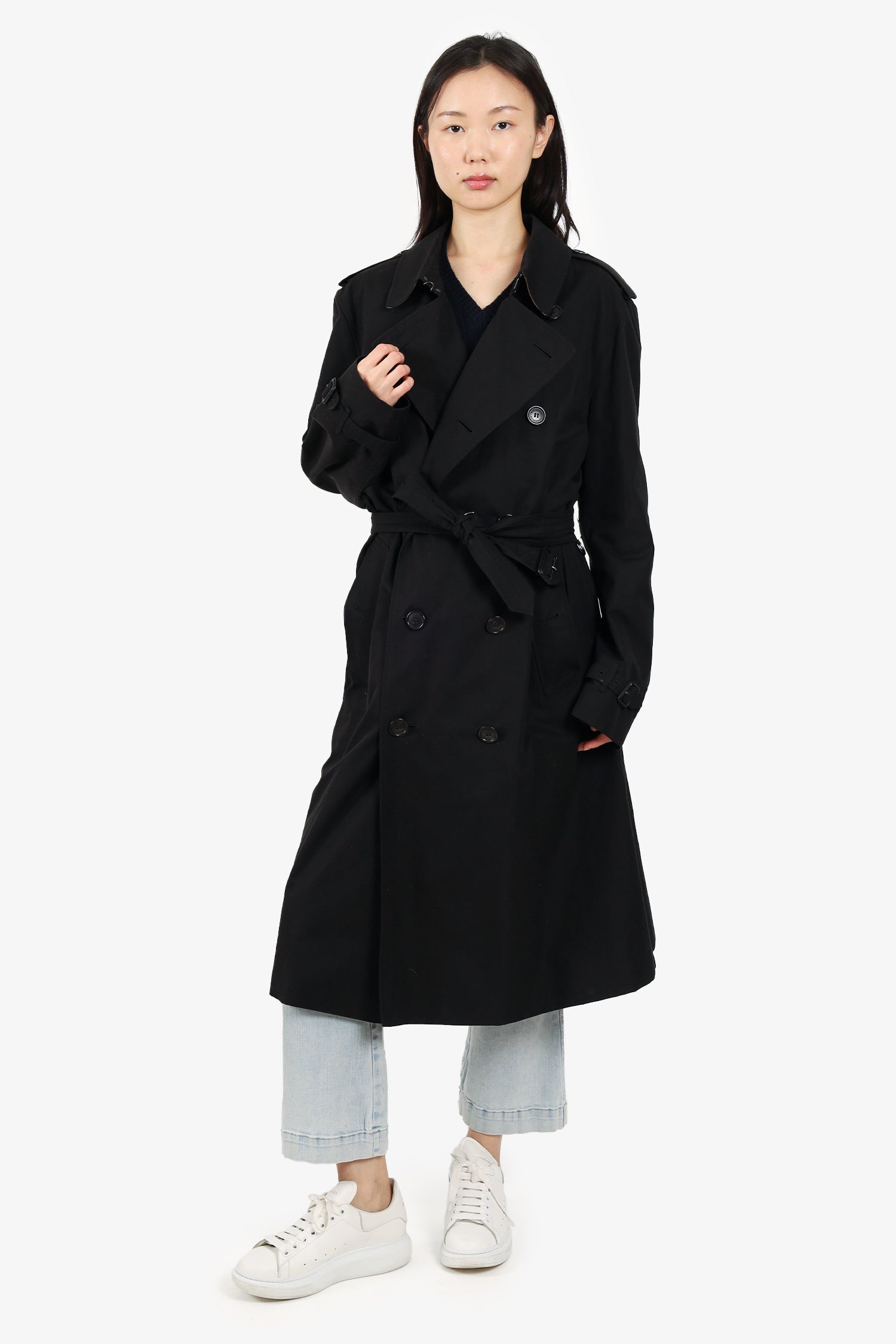 Refresh availabilityBurberry Black Double Breasted 'Kensington' Trench Coat. Front button closure. Lined. Tie waist closure. Tonal stitching.