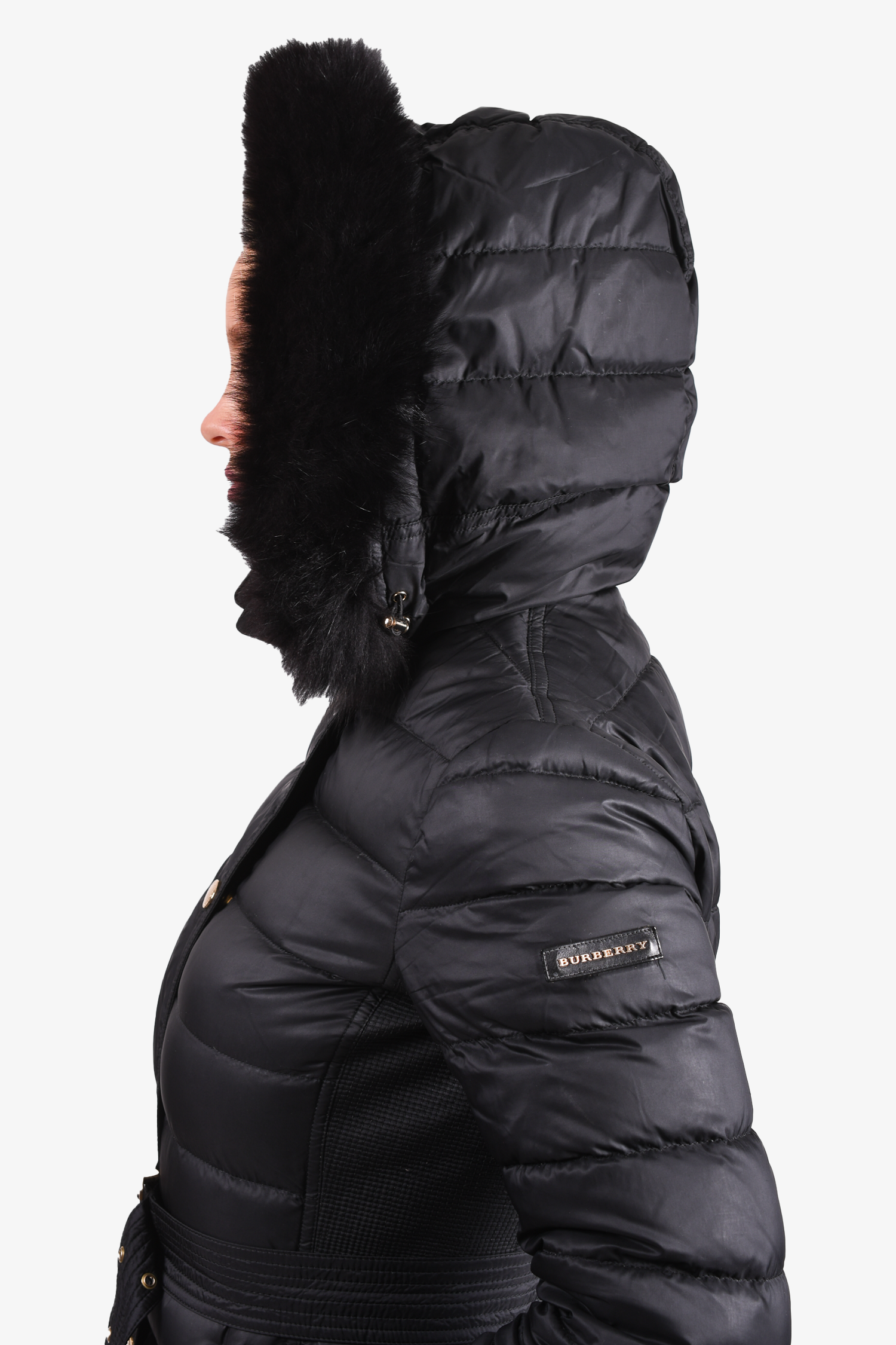 Refresh availabilityBurberry Black Down Belted Puffer Jacket with Fur Hood. Front zip and snap button-up closure. Front zip pockets. Brand logo patch on the left sleeve. Lined. Removable fur hood trim.