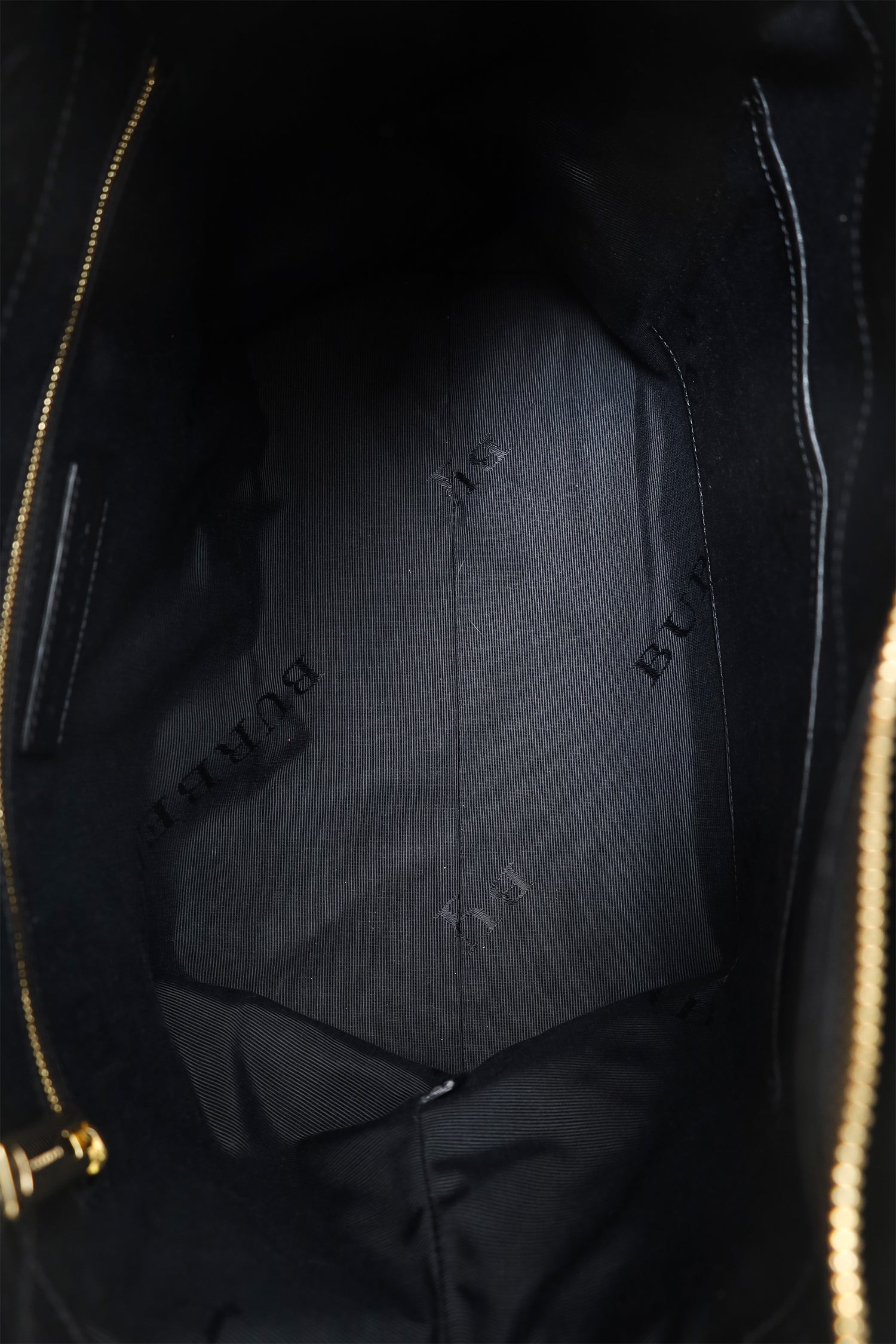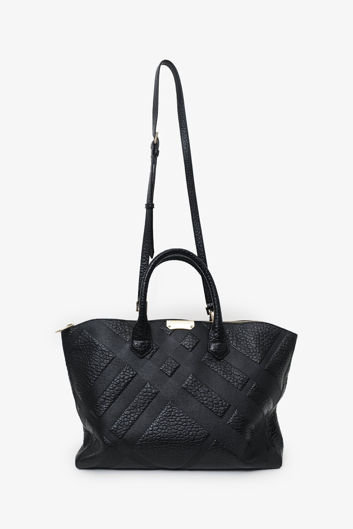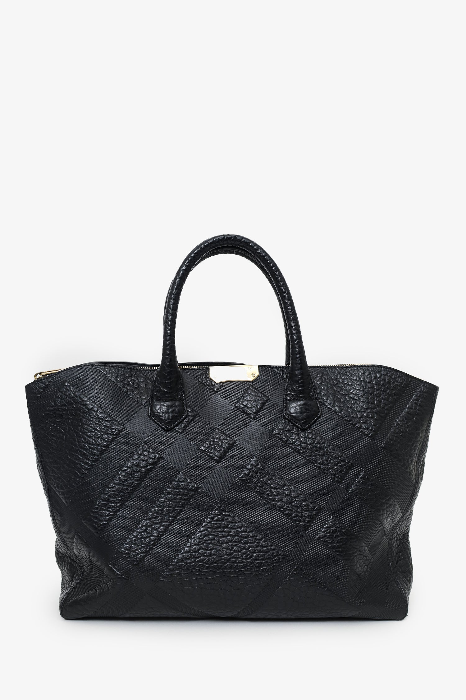 Refresh availabilityBurberry Black Embossed Check Leather Dewsbury Tote Bag With Strap. Top zip closure. Twin top handles. Removable strap with adjustable buckle closure. Lined interior. 3 interior pockets; 2 slip and 1 zip. Gold-tone hardware. Tonal stitching.
