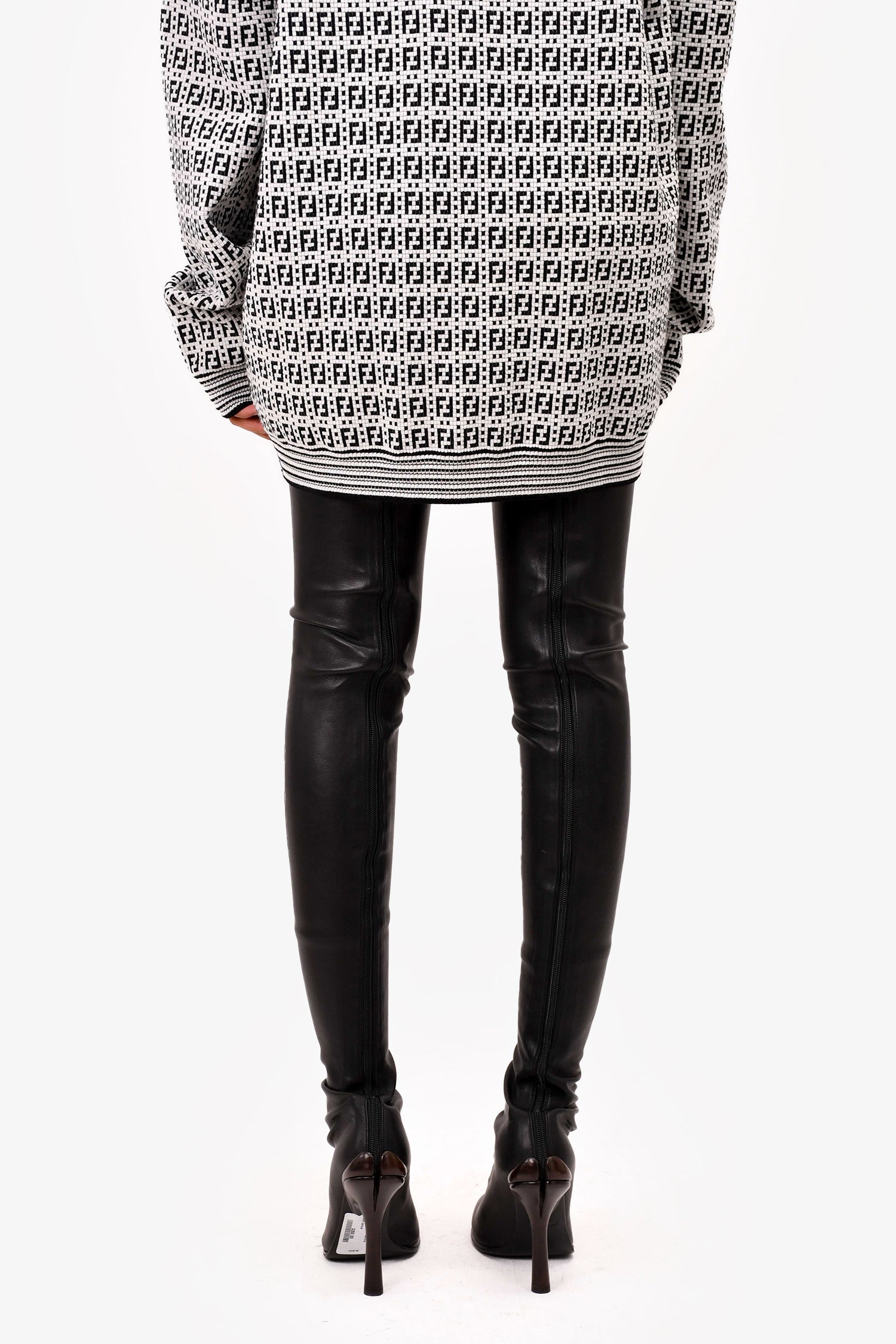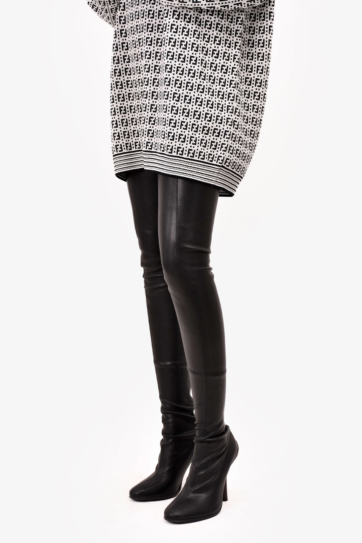 Refresh availabilityBurberry Black Faux Leather Thigh High Heeled Boots with Brown Heel. Almond toe. Rear zip closure.