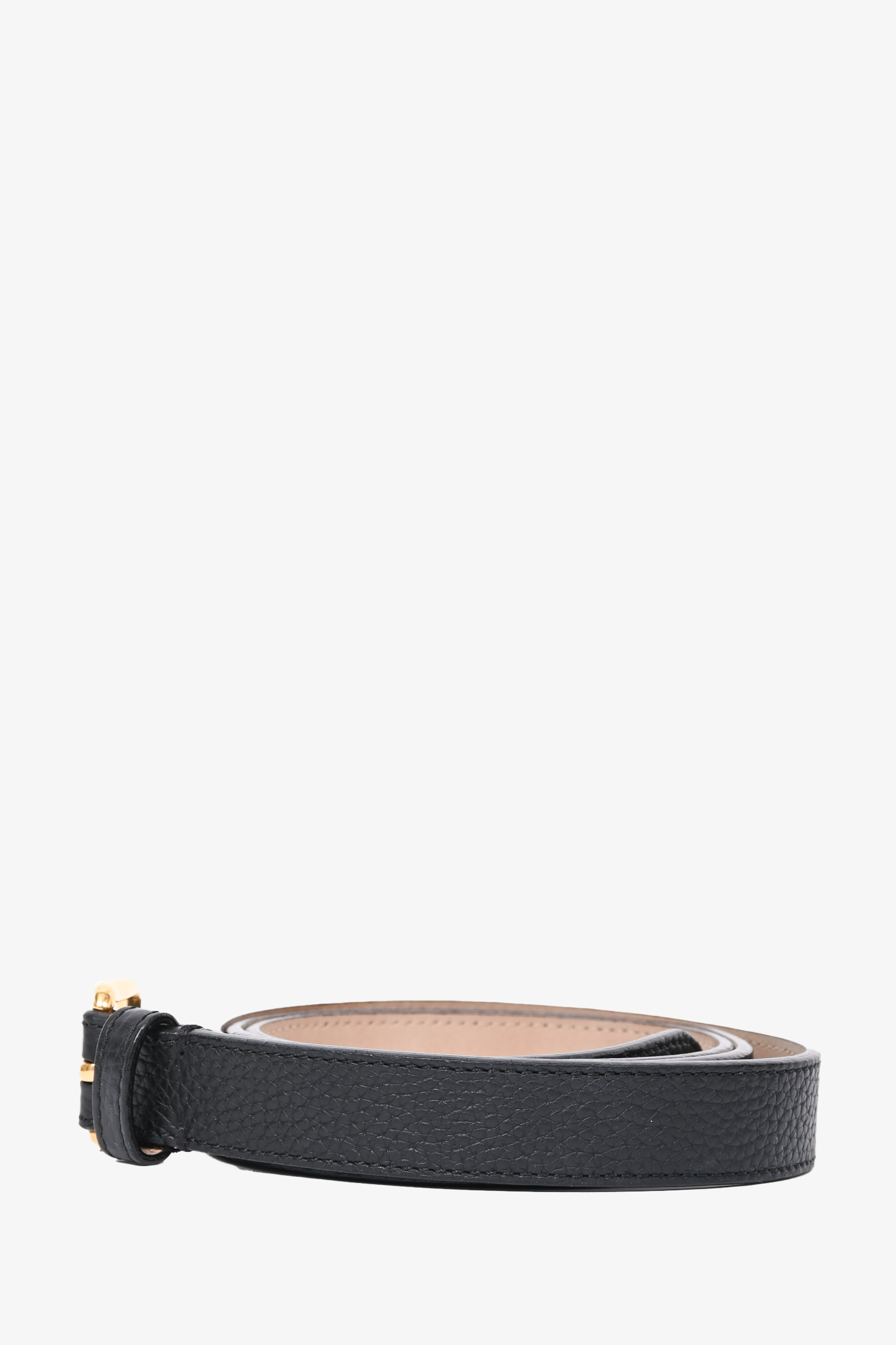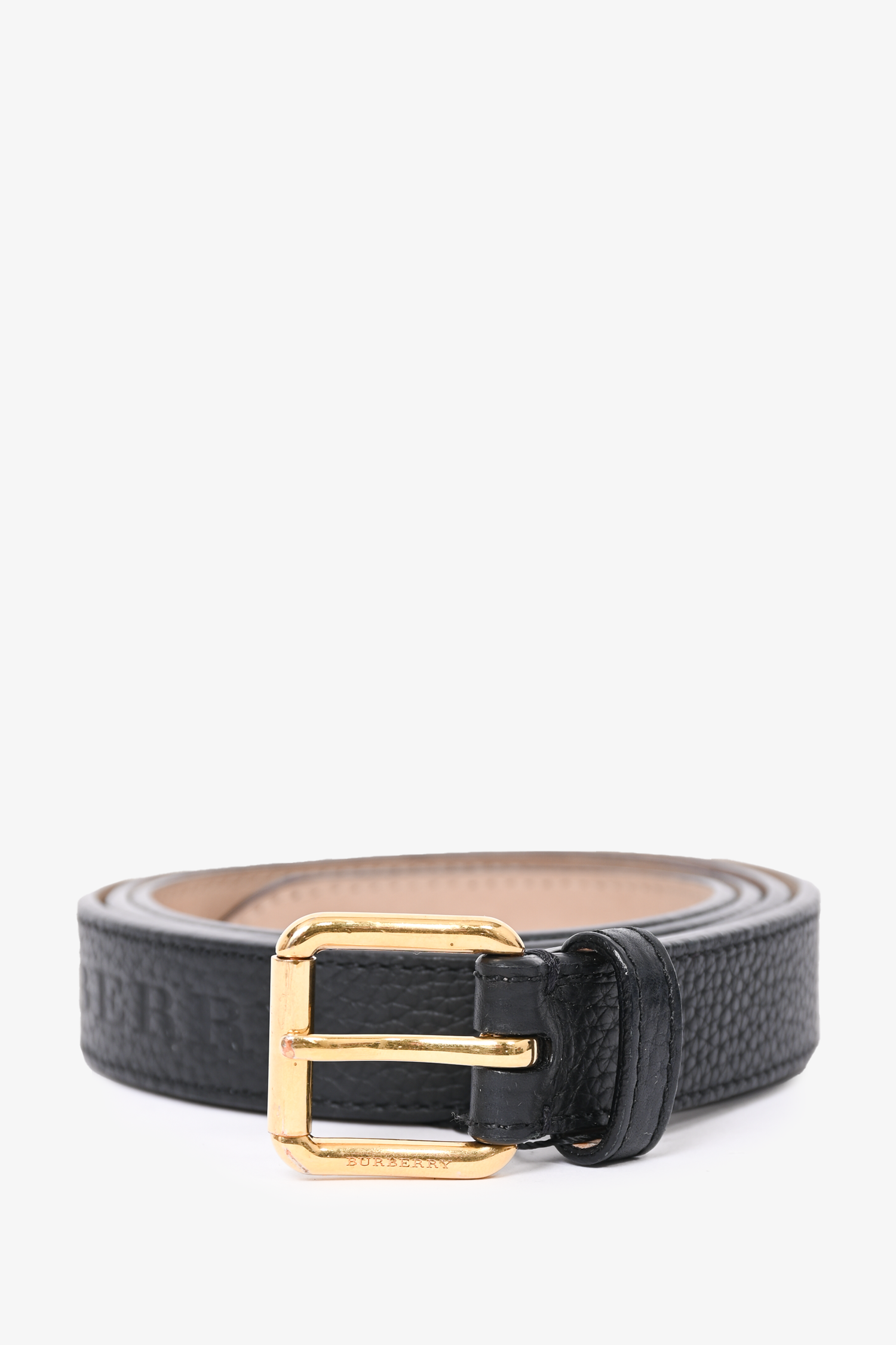 Refresh availabilityBurberry Black Grained Leather Belt. Buckle closure. Gold-tone hardware. Tonal stitching.