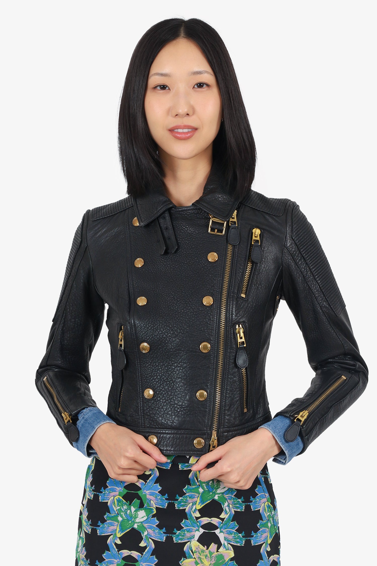 Refresh availabilityBurberry Black Leather Biker Jacket. Pull-on. Front zip and snap-button closure. Adjustable buckle closure at front neckline. Sleeve cuffs with zip closure. 3 front exterior zip pockets. Lined interior. Gold-tone hardware. Tonal stitching.