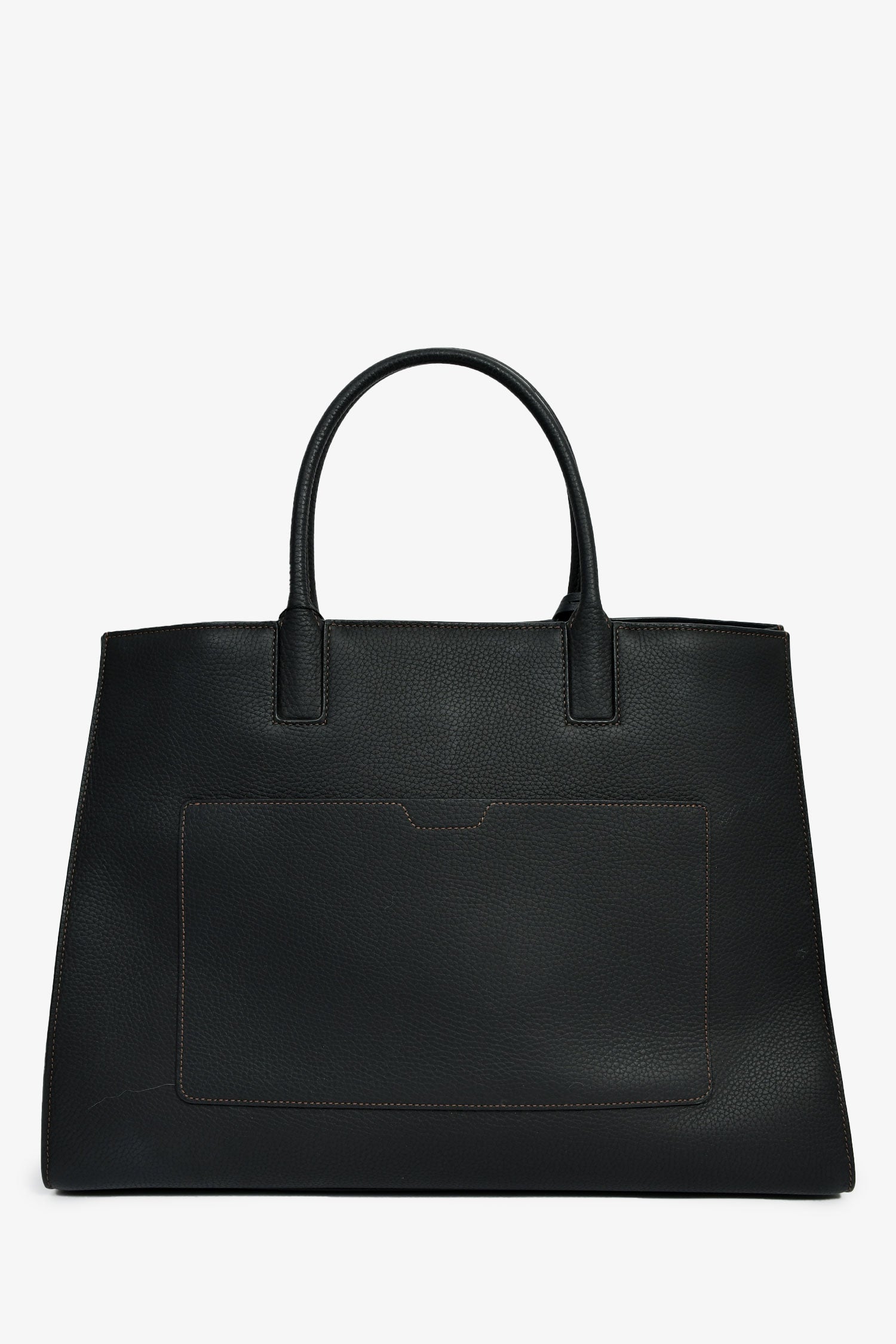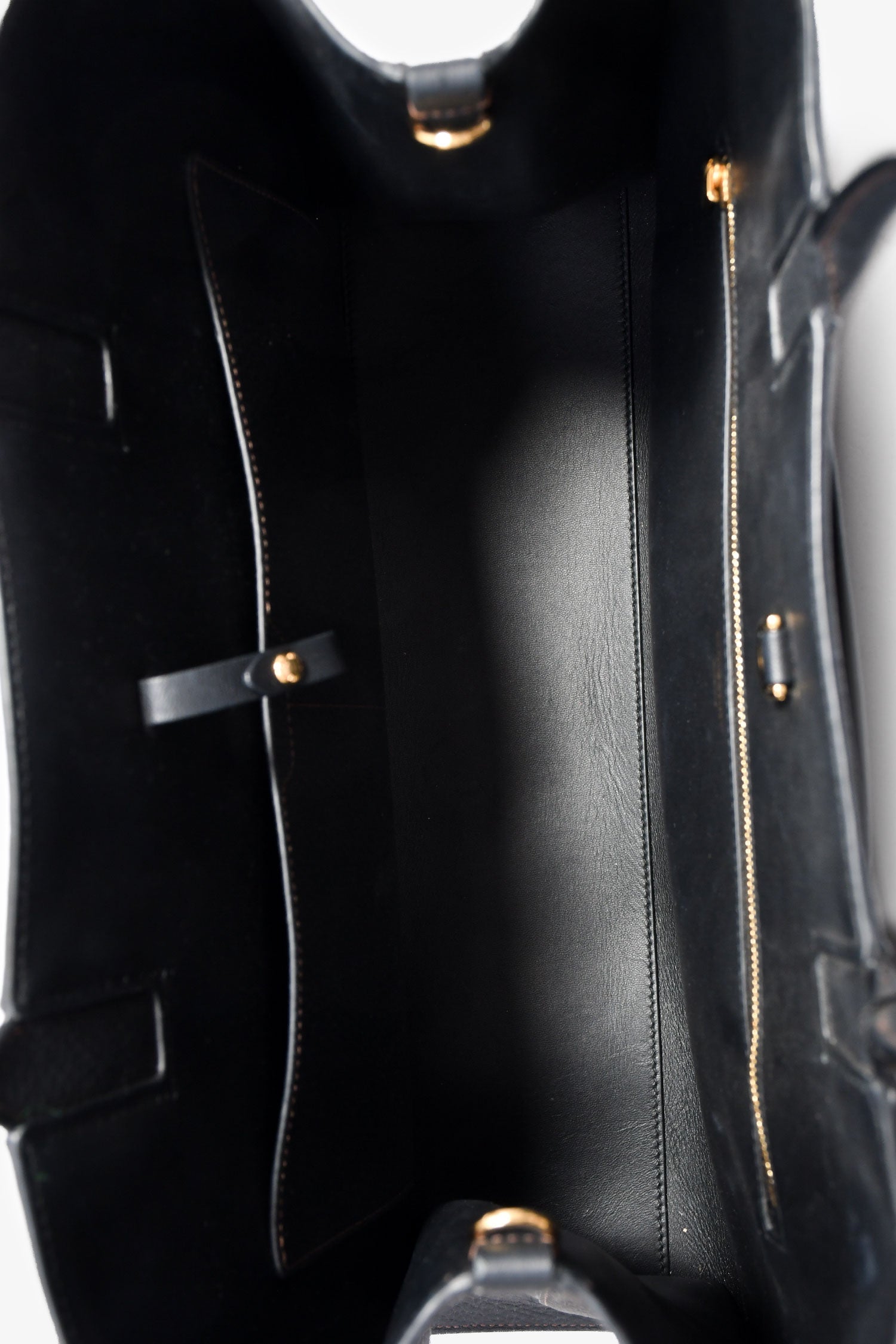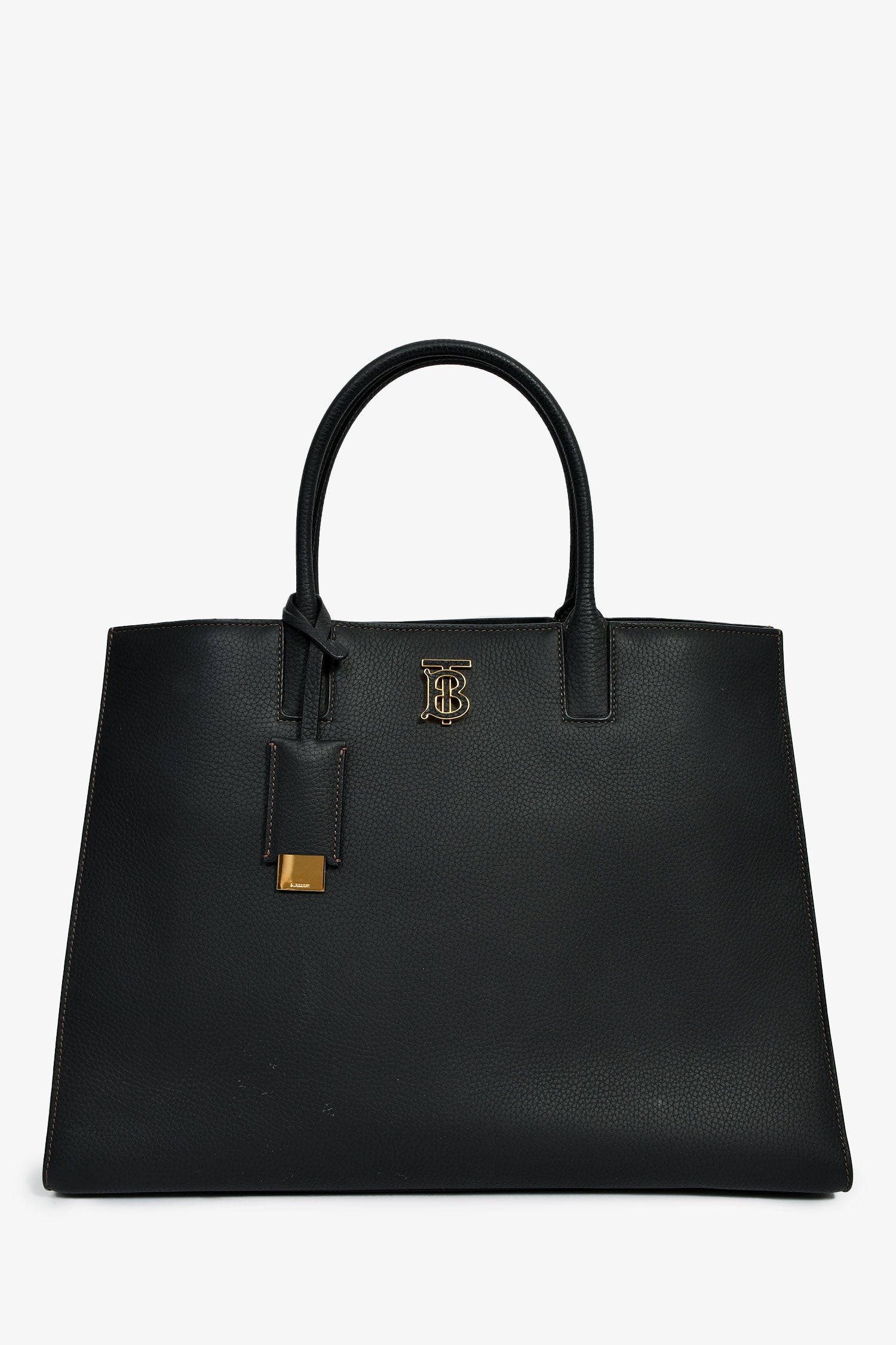 Refresh availabilityBurberry Black Leather 'Frances' Tote Bag. Open top with strap closure. Dual top handles. Protective base studs. Single exterior rear slip pocket. 3 interior wall pockets; 2 slip, 1 with zip closure. Detachable clochette. Gold-tone hardware. Tonal stitching.