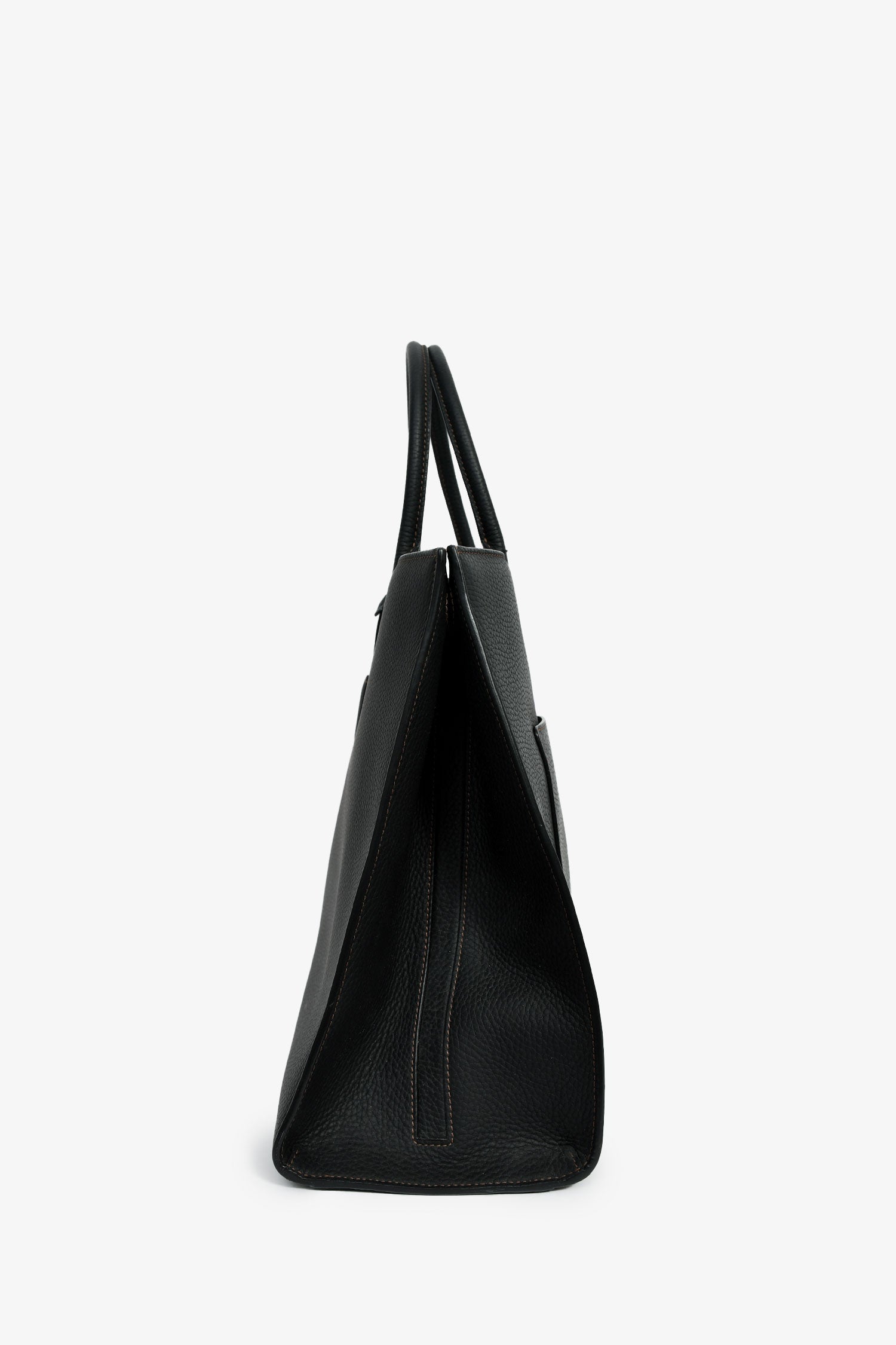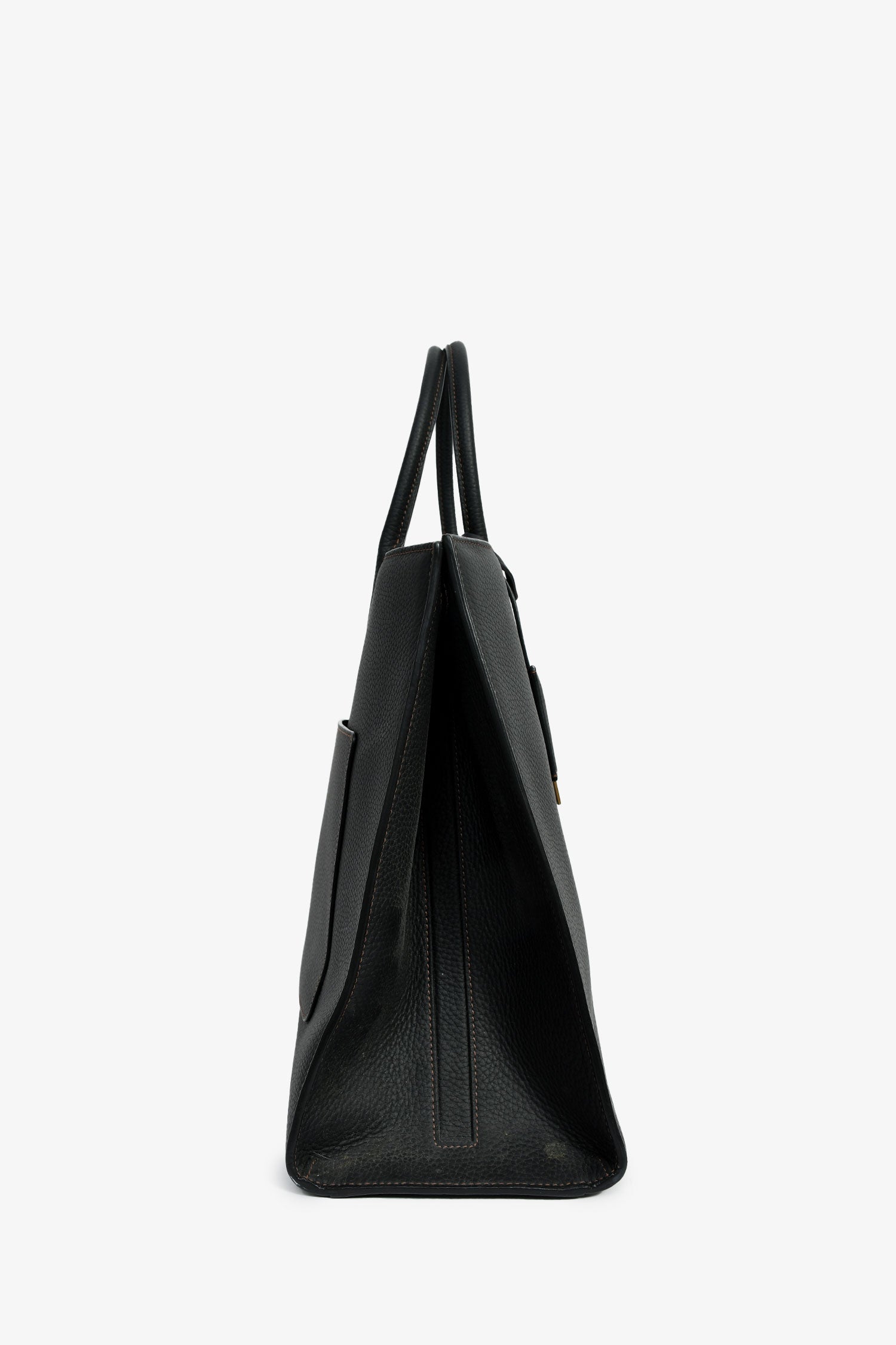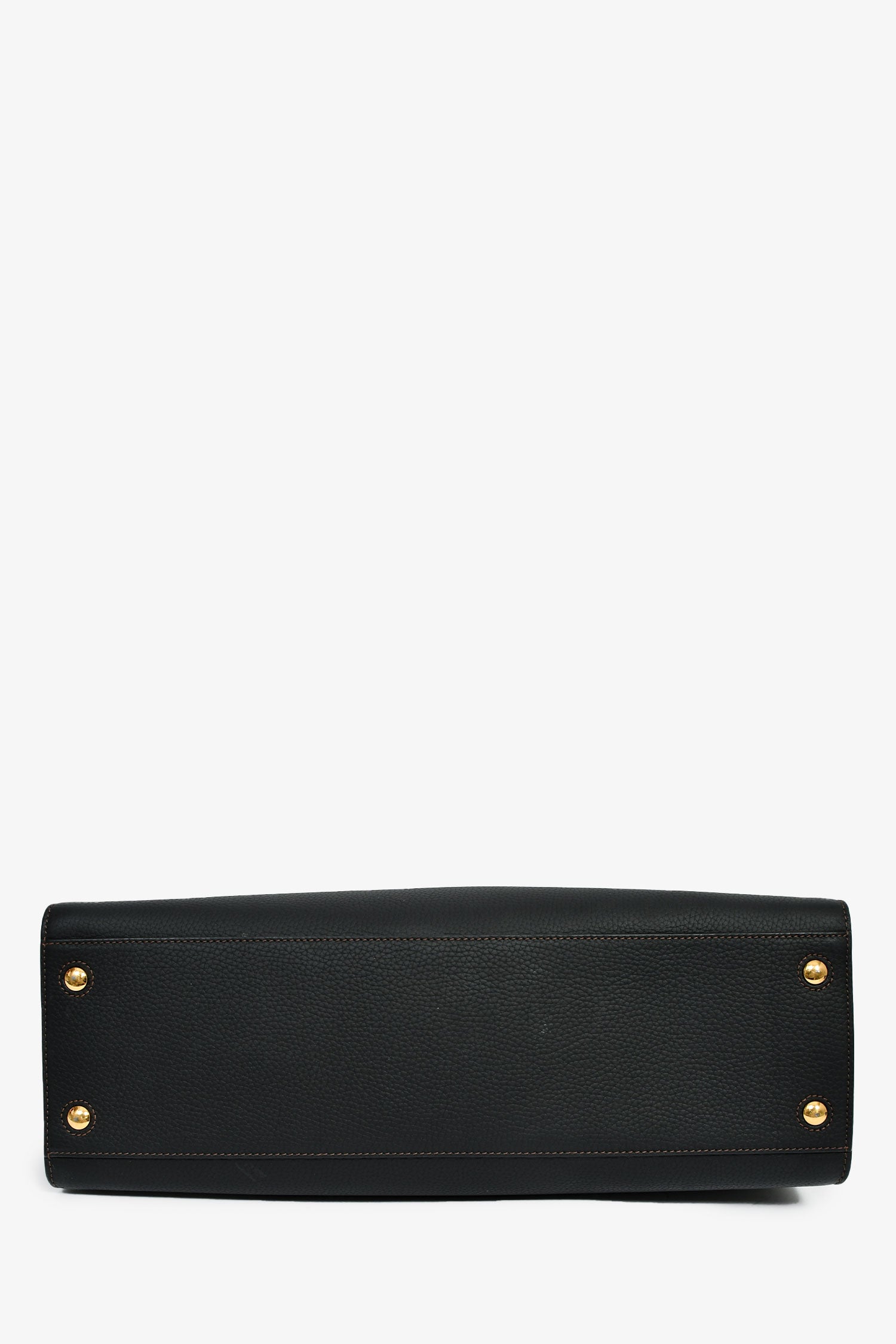 Refresh availabilityBurberry Black Leather 'Frances' Tote Bag. Open top with strap closure. Dual top handles. Protective base studs. Single exterior rear slip pocket. 3 interior wall pockets; 2 slip, 1 with zip closure. Detachable clochette. Gold-tone hardware. Tonal stitching.