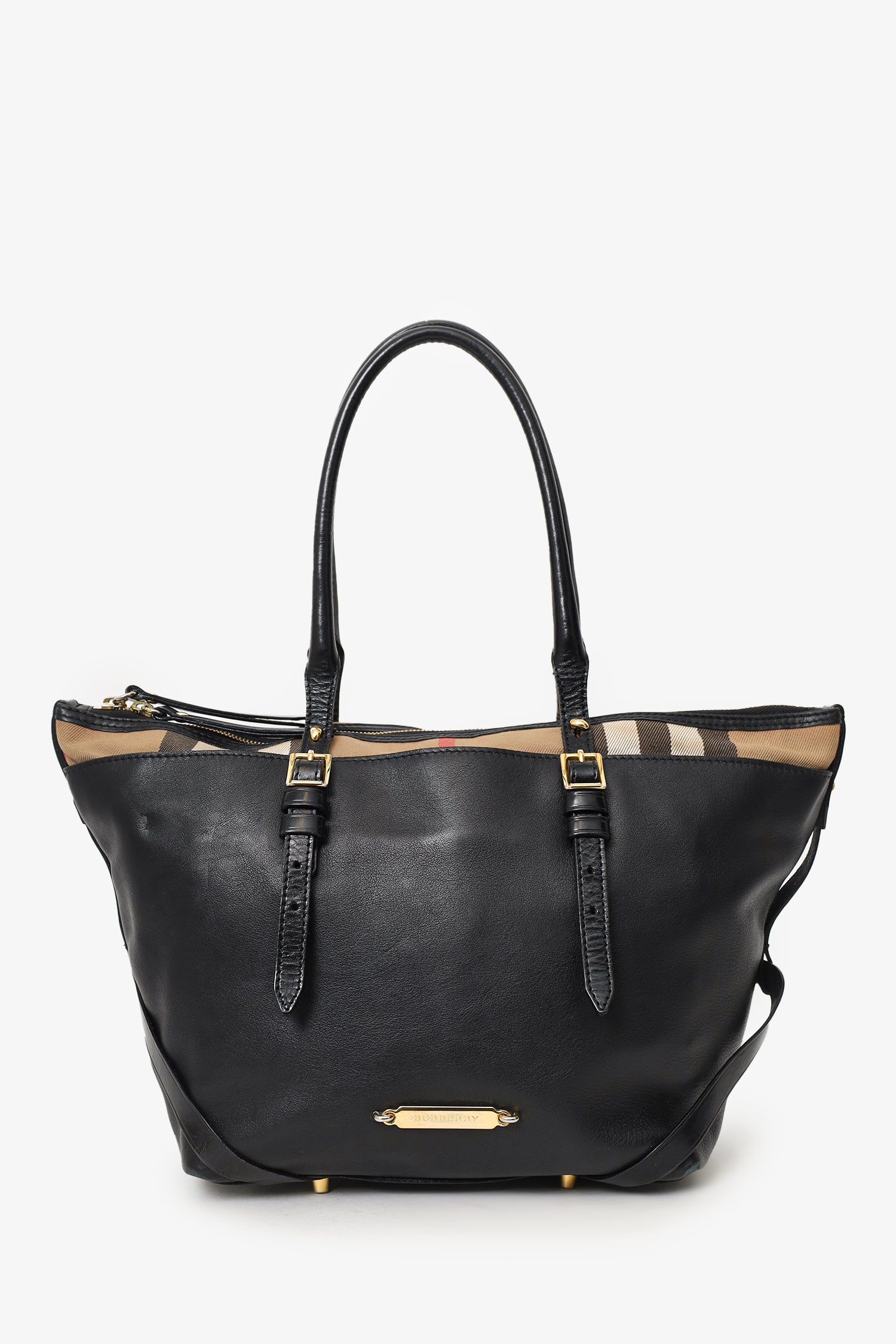 Refresh availabilityBurberry Black Leather/Nova Check Salisbury Tote. Top zip closure. Twin handles. Front slip pocket. Protective base studs. Lined interior. 3 interior pockets; 2 slip and 1 zip. Gold-tone hardware. Tonal stitching.