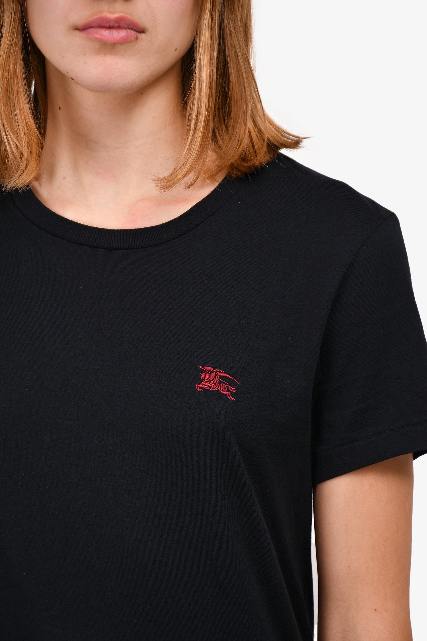 Refresh availabilityBurberry Black Logo Embroidered T-Shirt. Ribbed collar. Nova check strip lining on the collar. Tonal stitching.