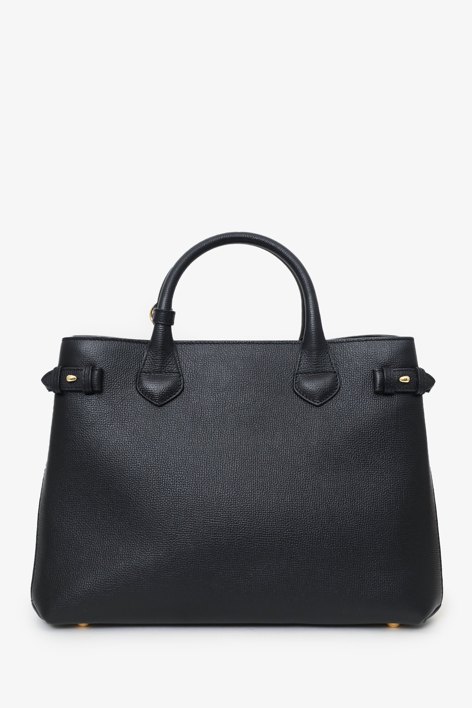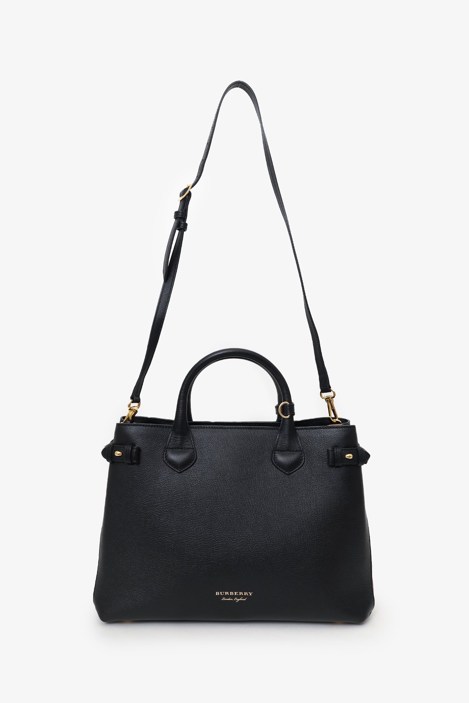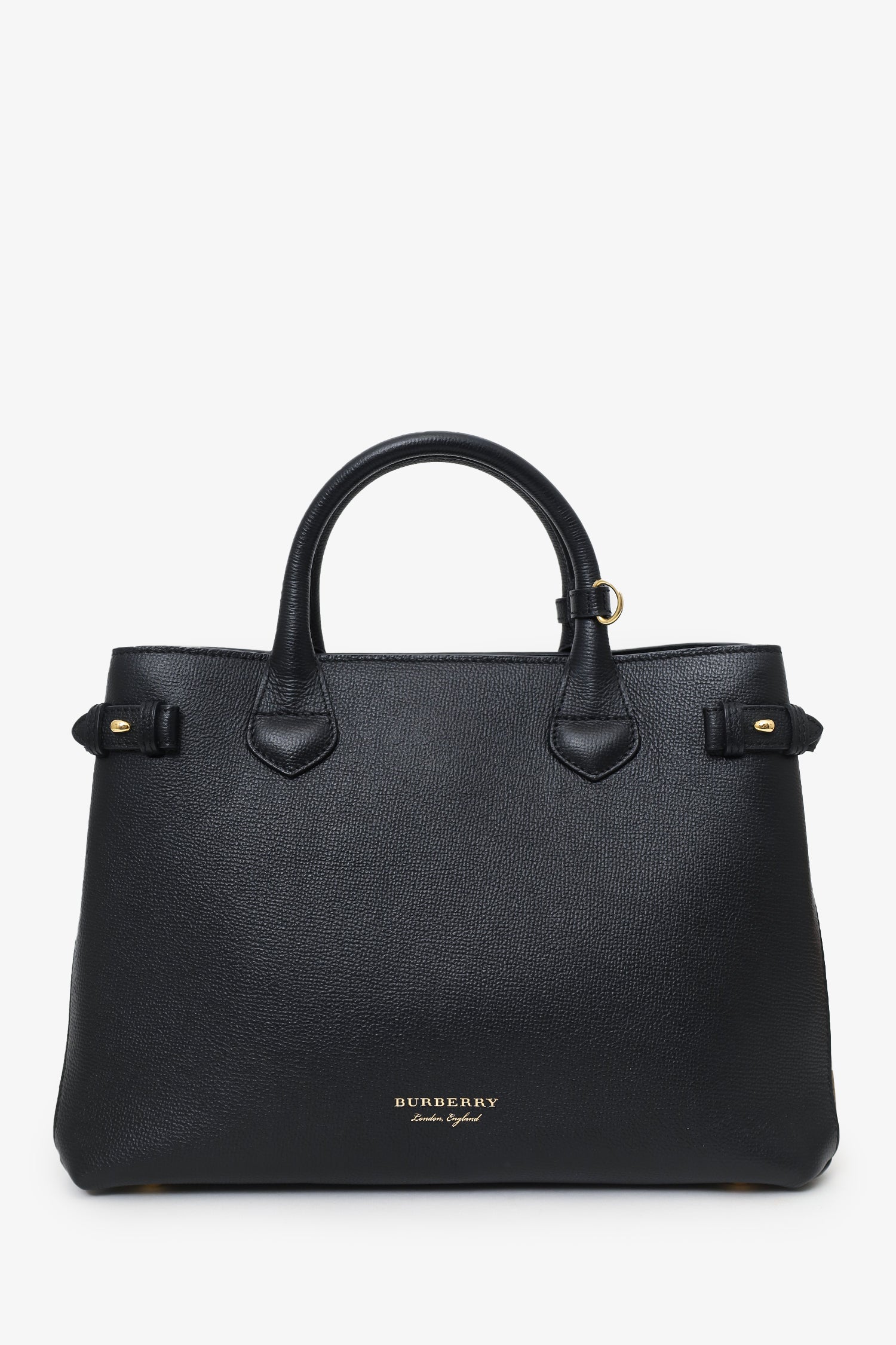 Refresh availabilityBurberry Black/Nova Print/Leather Top Handle Bag With Strap. Top zip and snap-button closure. Twin handles. Removable strap with adjustable buckle closure. Protective base studs. 3 interior compartments; middle zip, front and rear with snap-button closure. 2 interior slip pockets in front compartment and single interior zip pocket to rear compartment.