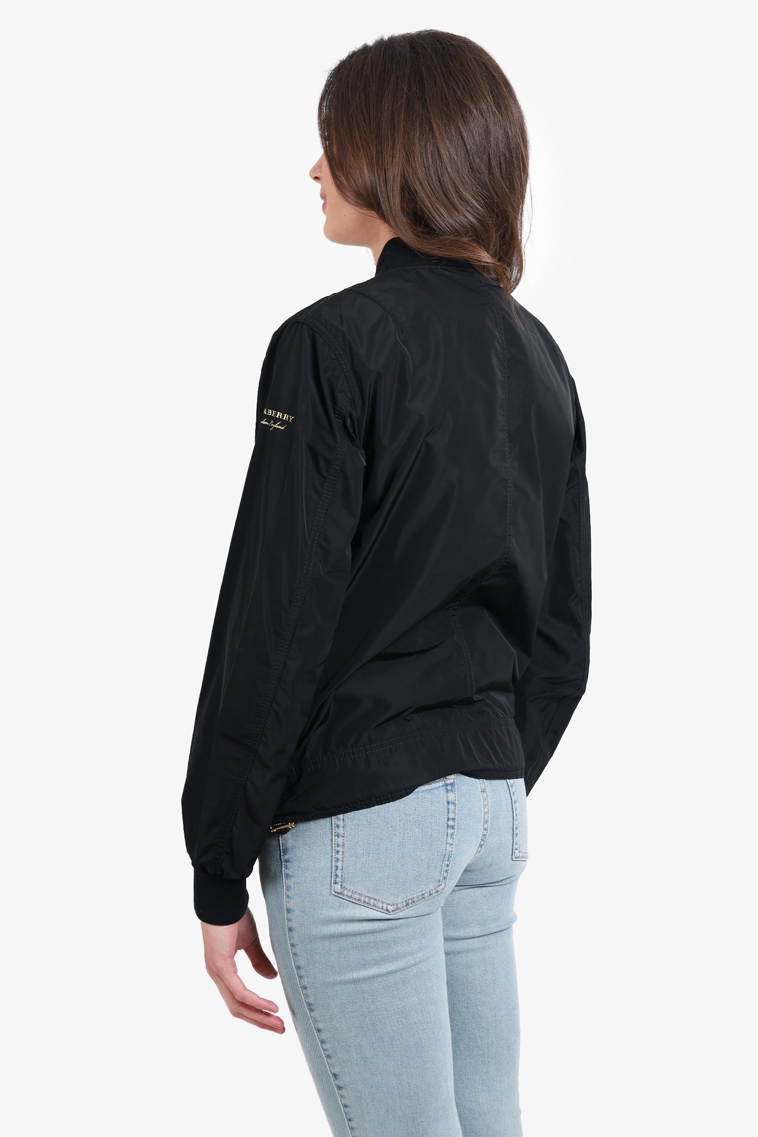 Refresh availabilityBurberry Black Nylon Bomber Jacket with Logo Arm. Gold-tone hardware. Front zip closure. Two front slip pockets with snap closure. Adjustable cinch detailing at hem. Unlined. Tonal stitching.