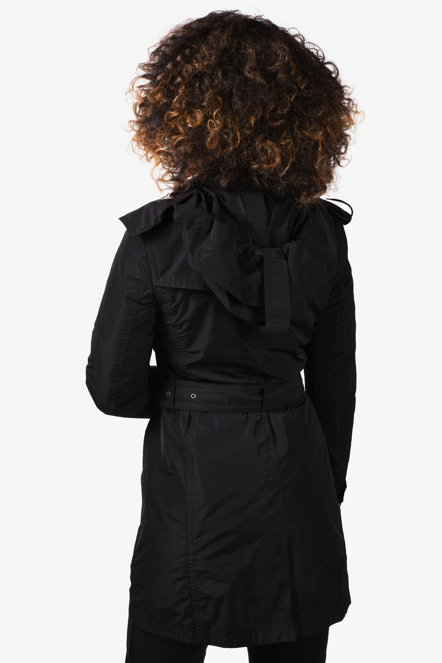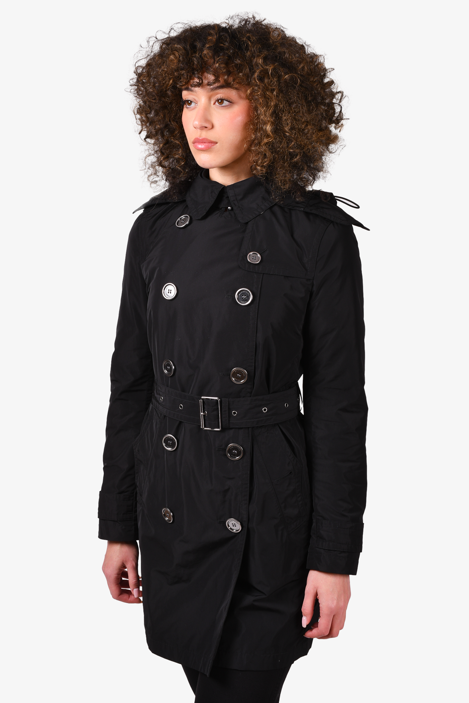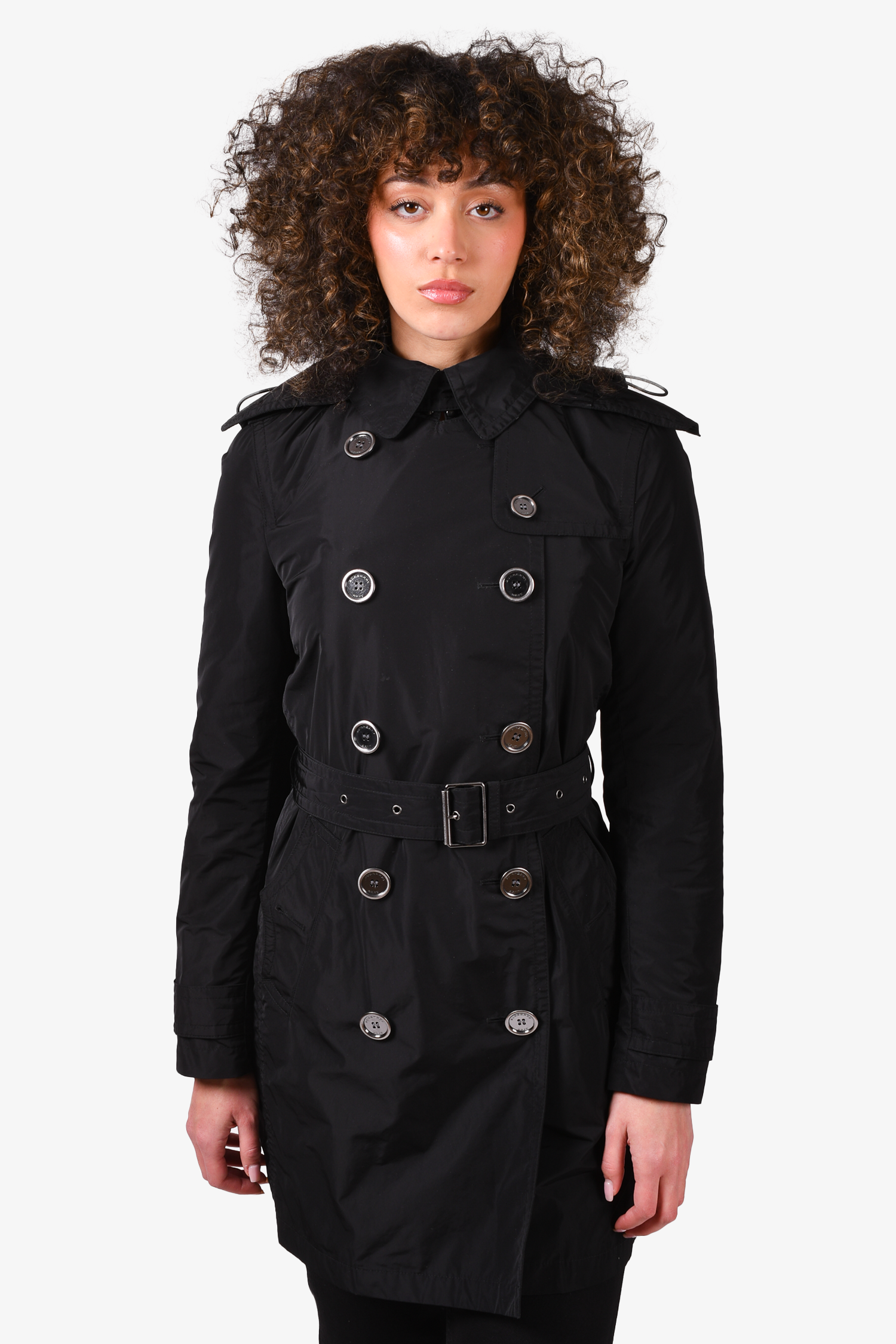 Refresh availabilityBurberry Black Nylon Double Breasted Trench Coat with Belt. Front button-up closure. Front pockets with button closure. Latch closure on the collar. Tonal stitching.