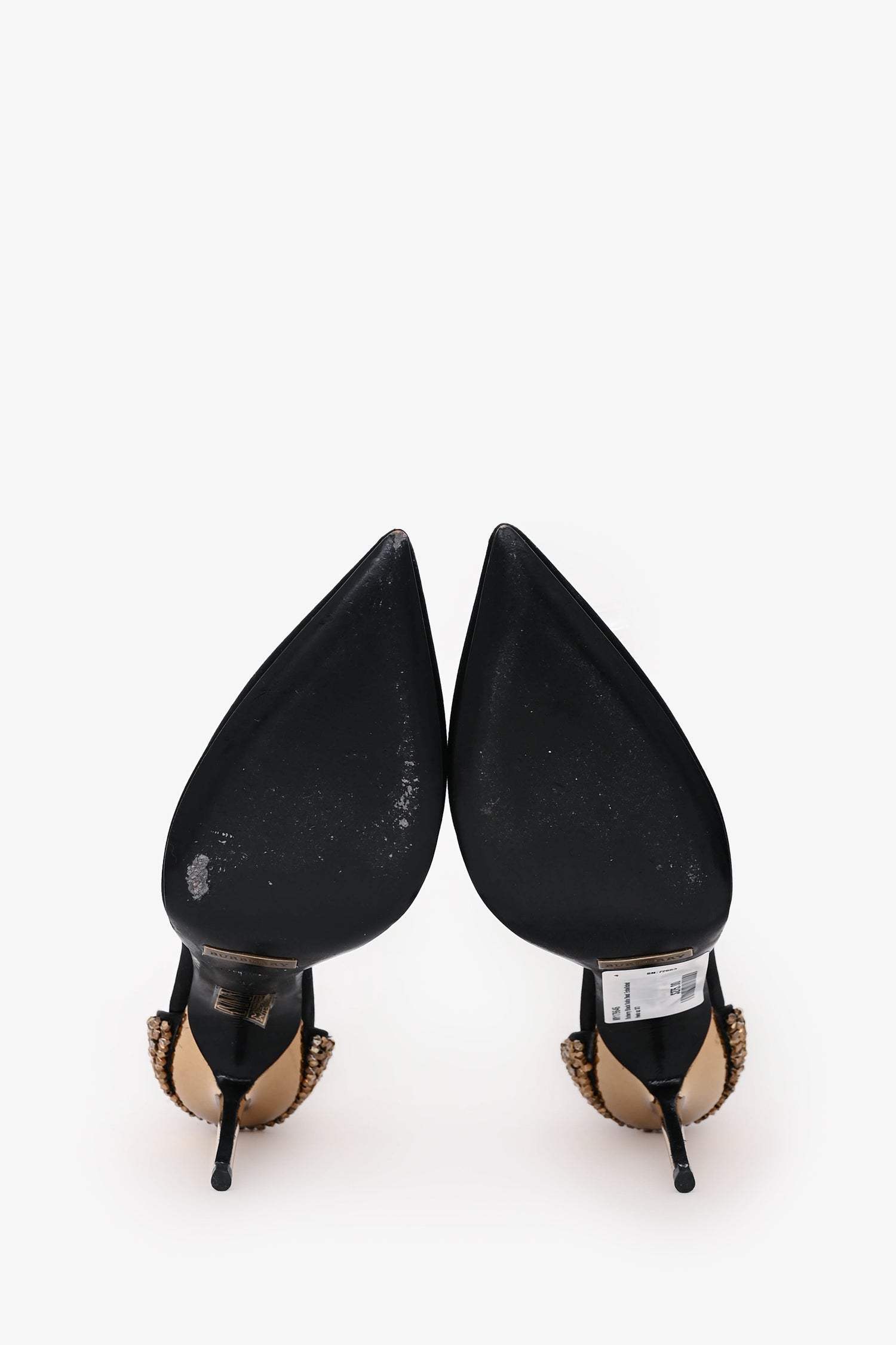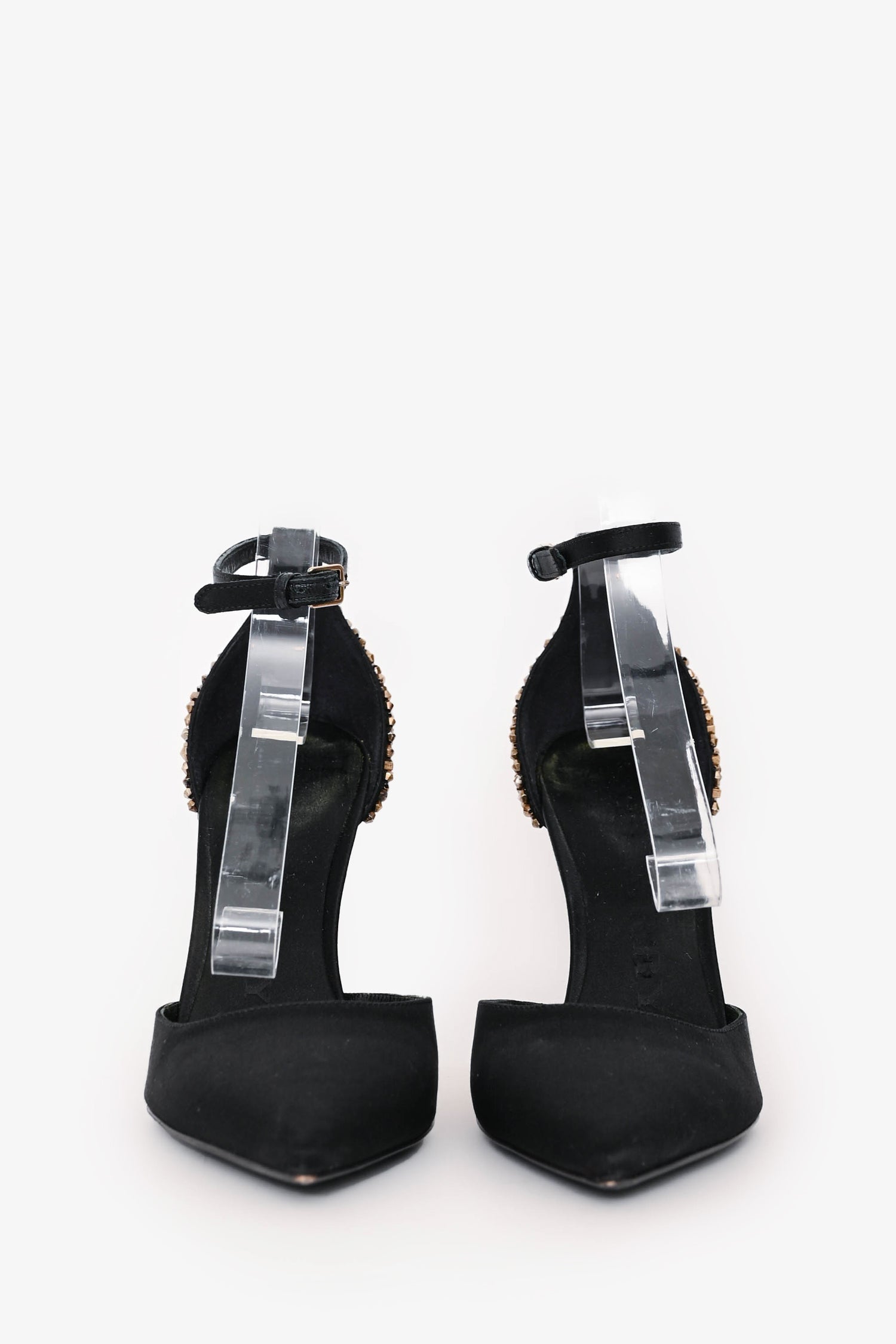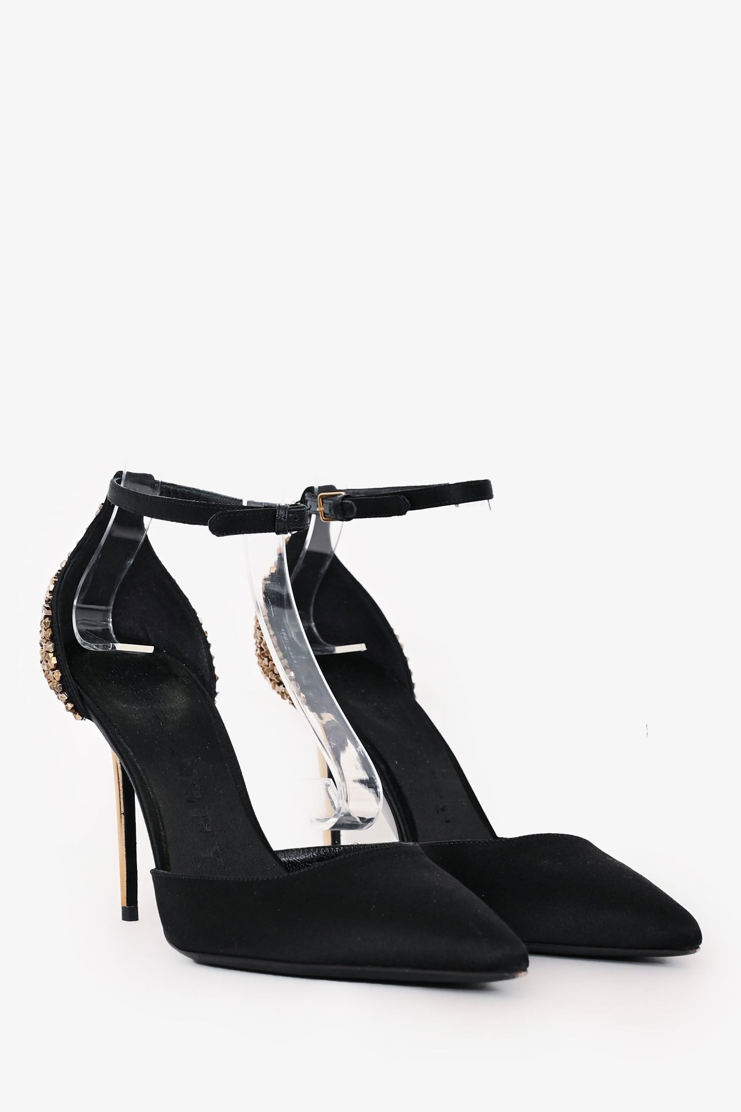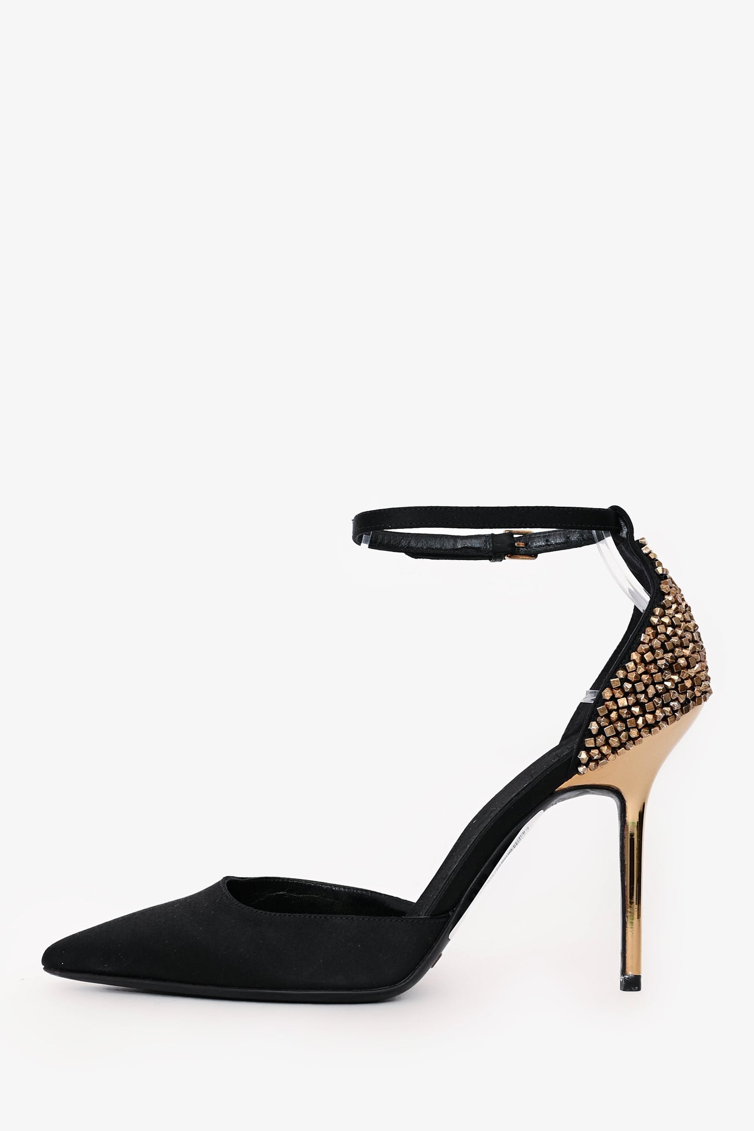 Refresh availabilityBurberry Black Satin Bead Embellished Heels. Slip-on. Pointed toe. Adjustable ankle strap. Fabric lining and insole. Metal Heel. Gold-tone hardware. Tonal stitching.