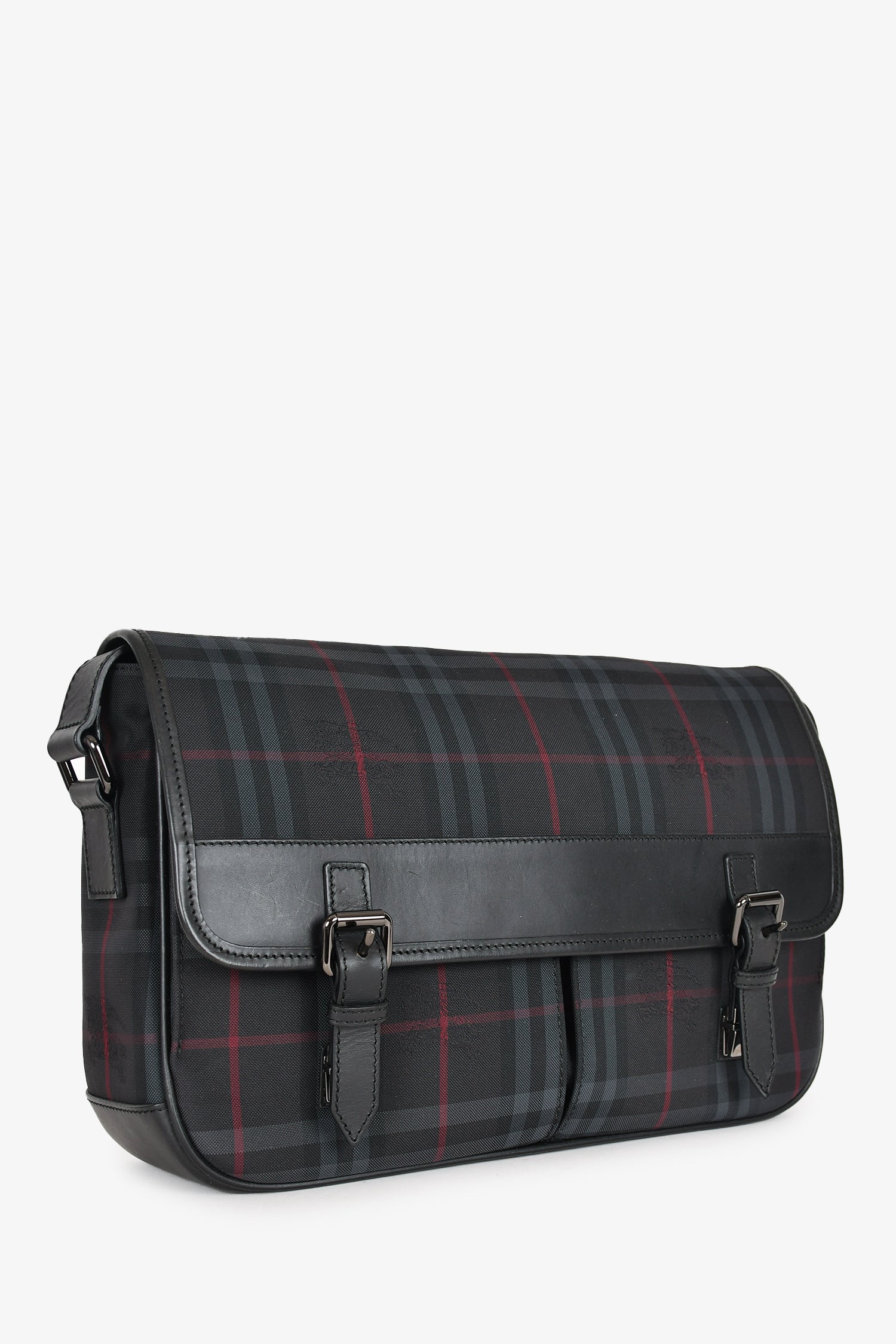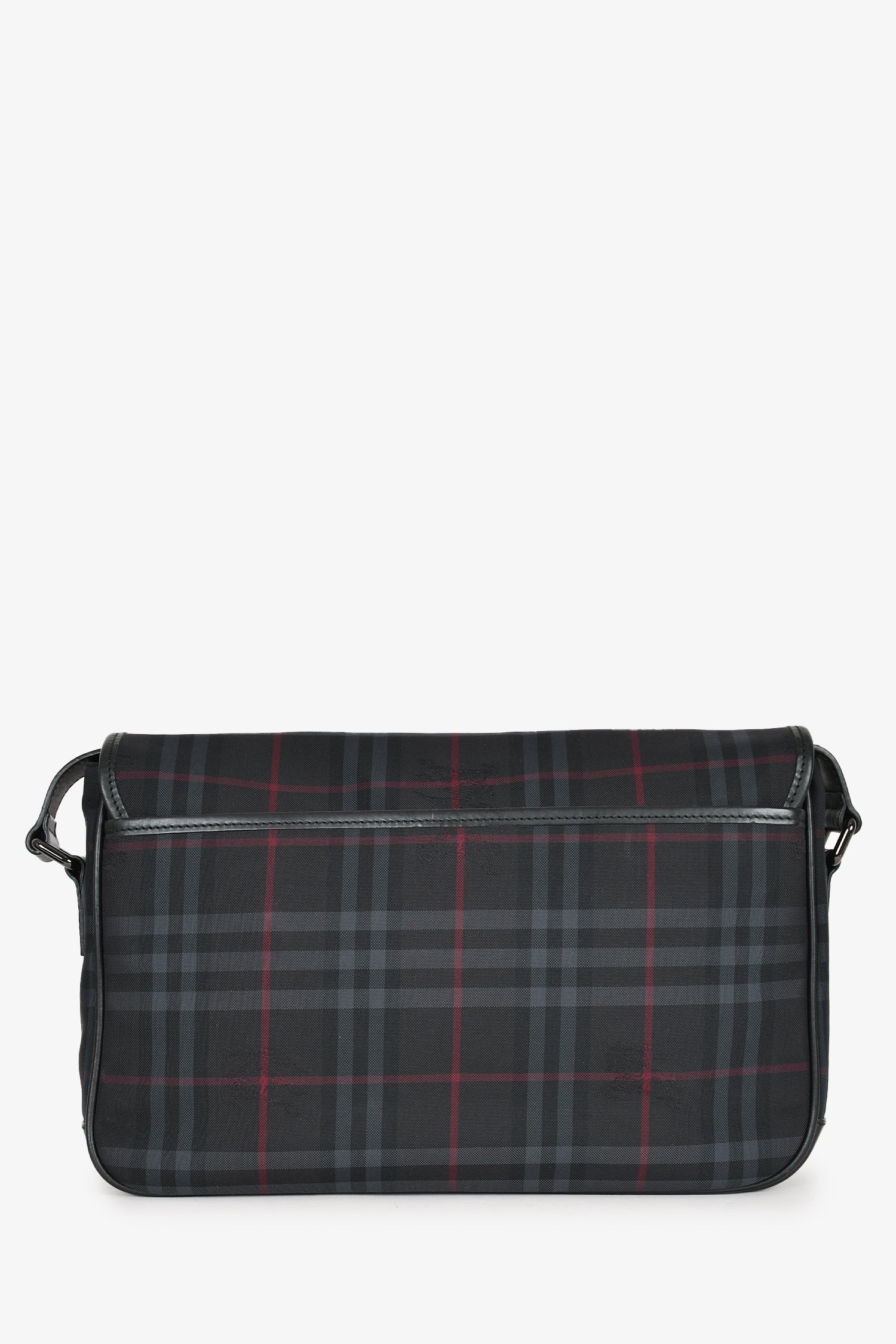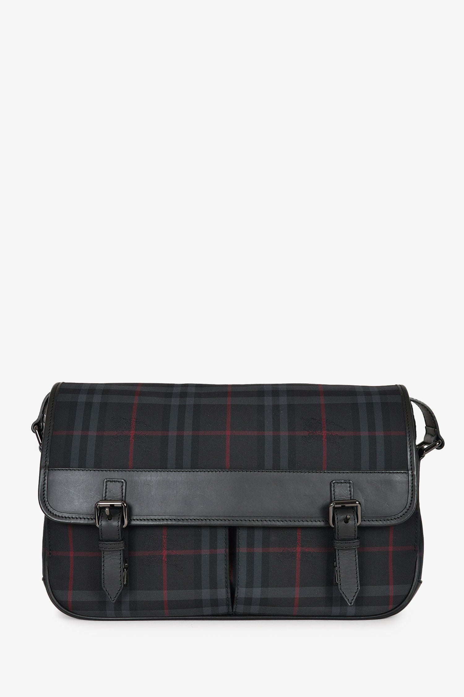 Refresh availabilityBurberry Black Tartan Canvas/Leather Tartan Messenger Bag. Front fold-over flap with push lock closures. 2 front pockets. Outer rear slip pocket. Black textile interior lining. 3 interior wall pockets; 2 slip and 1 with zip closure. Adjustable strap. Silver-tone hardware.
