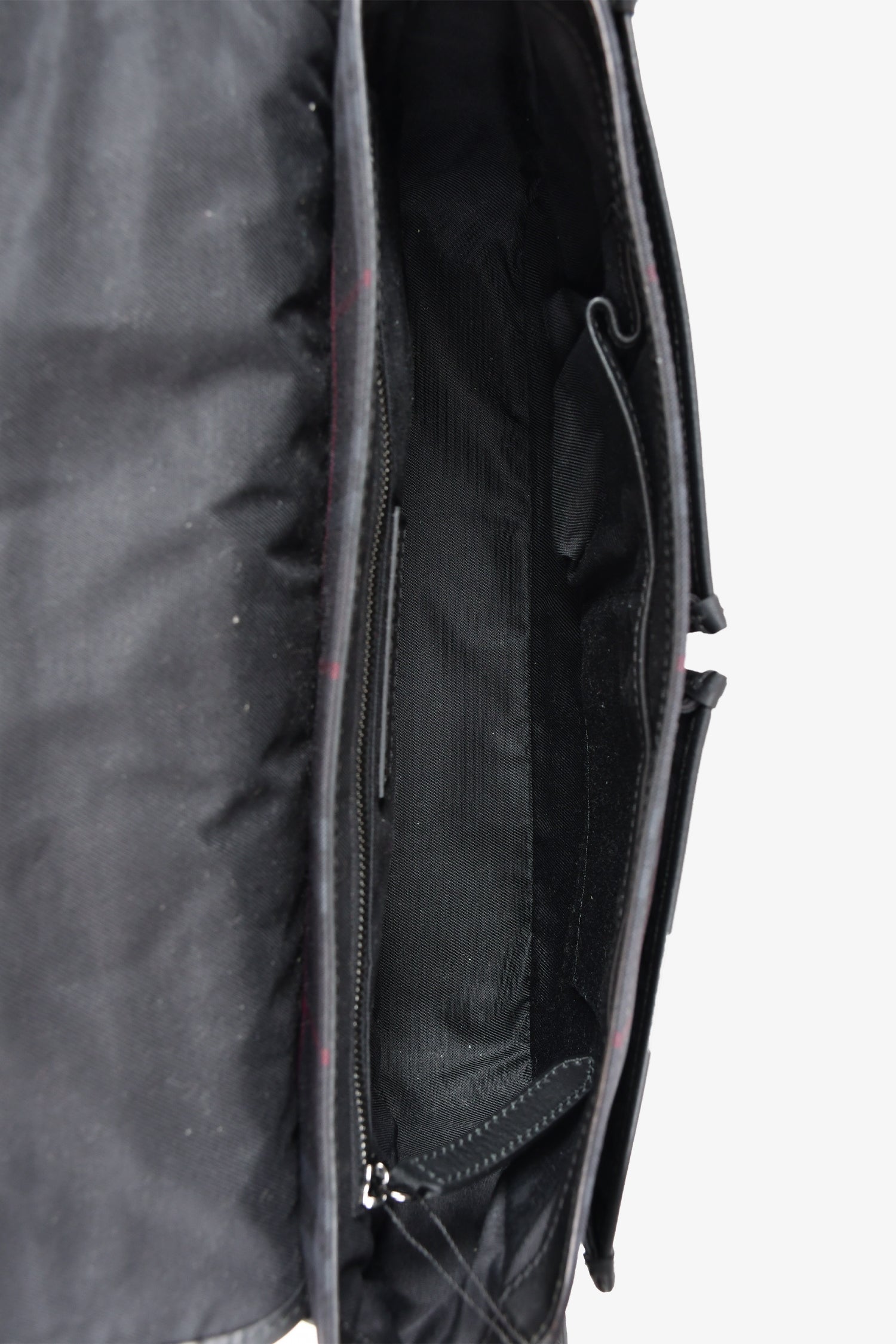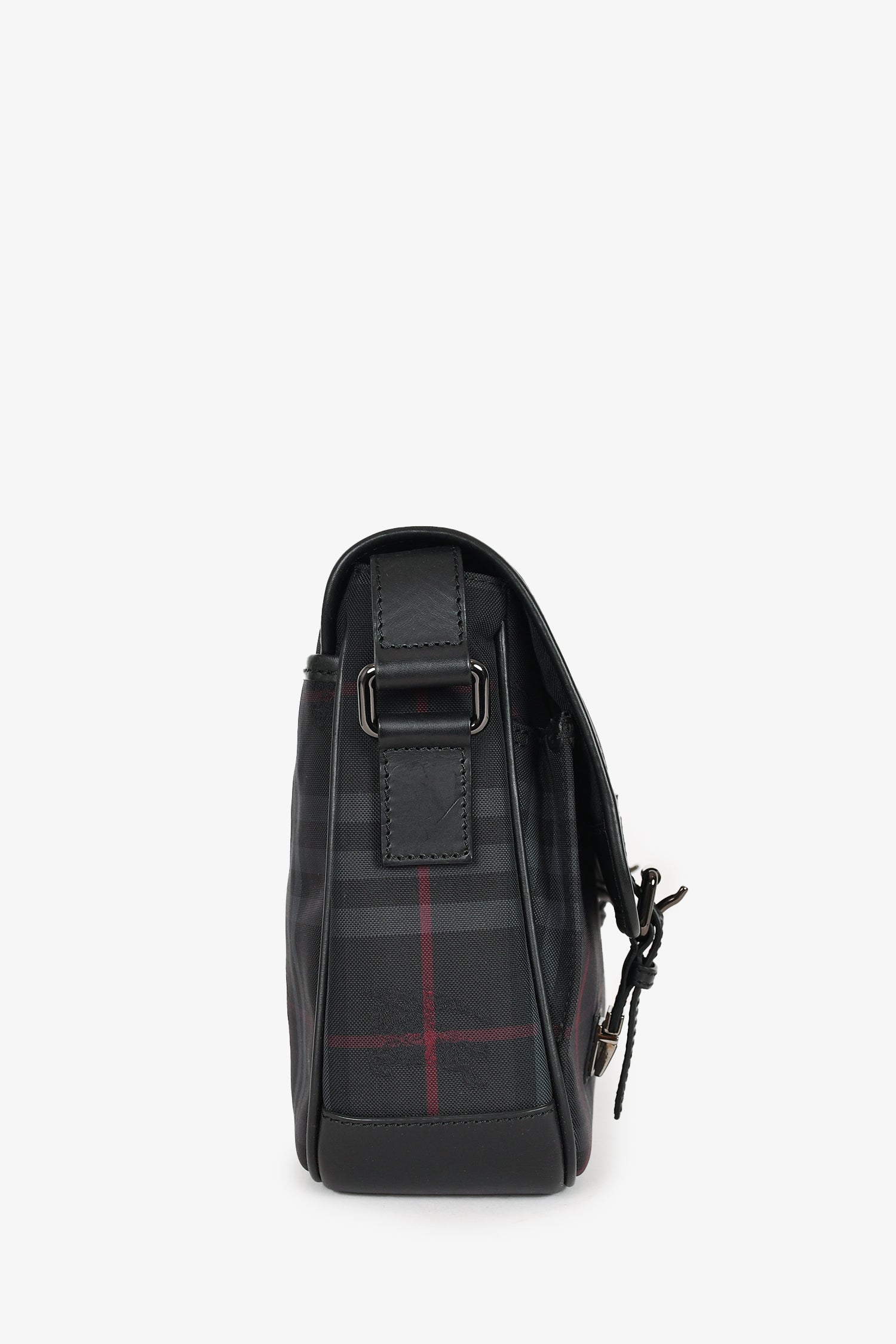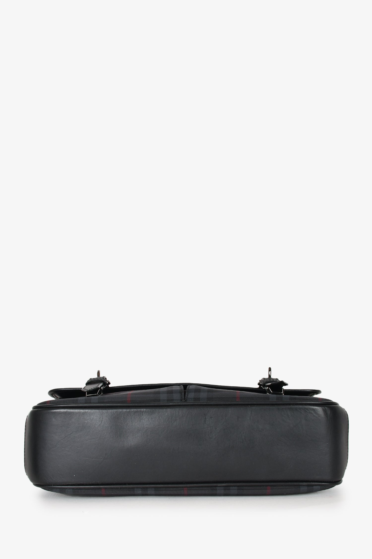 Refresh availabilityBurberry Black Tartan Canvas/Leather Tartan Messenger Bag. Front fold-over flap with push lock closures. 2 front pockets. Outer rear slip pocket. Black textile interior lining. 3 interior wall pockets; 2 slip and 1 with zip closure. Adjustable strap. Silver-tone hardware.