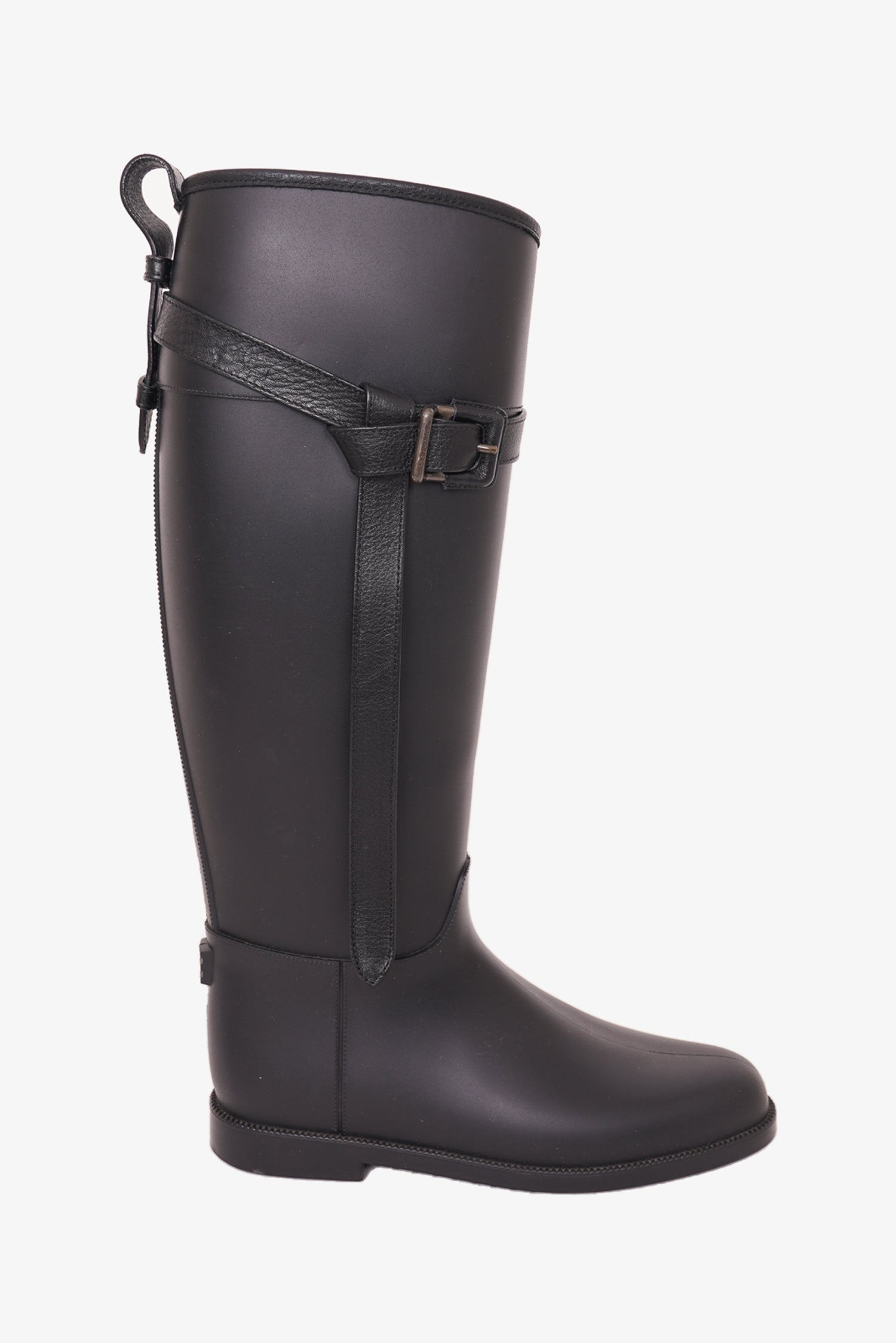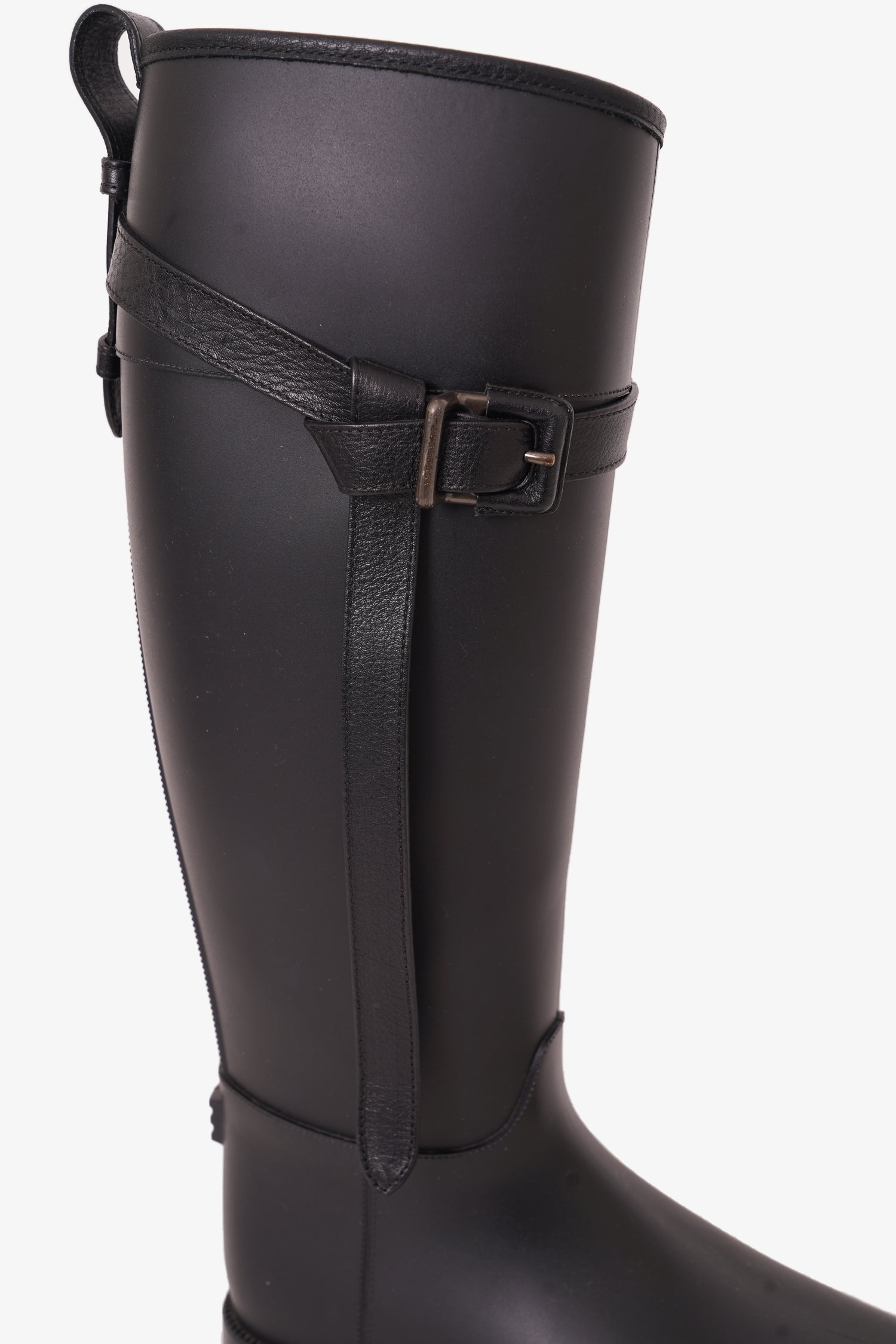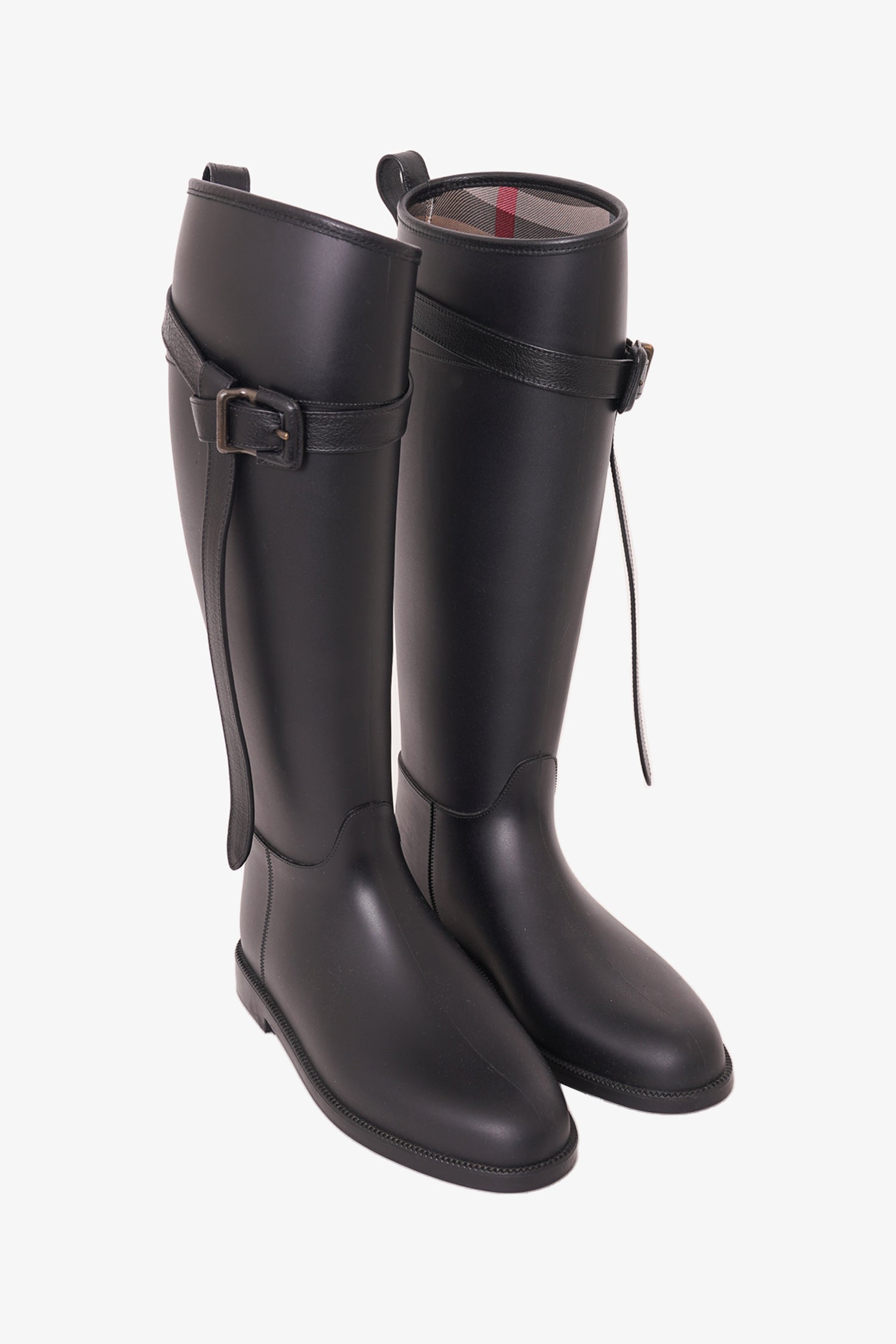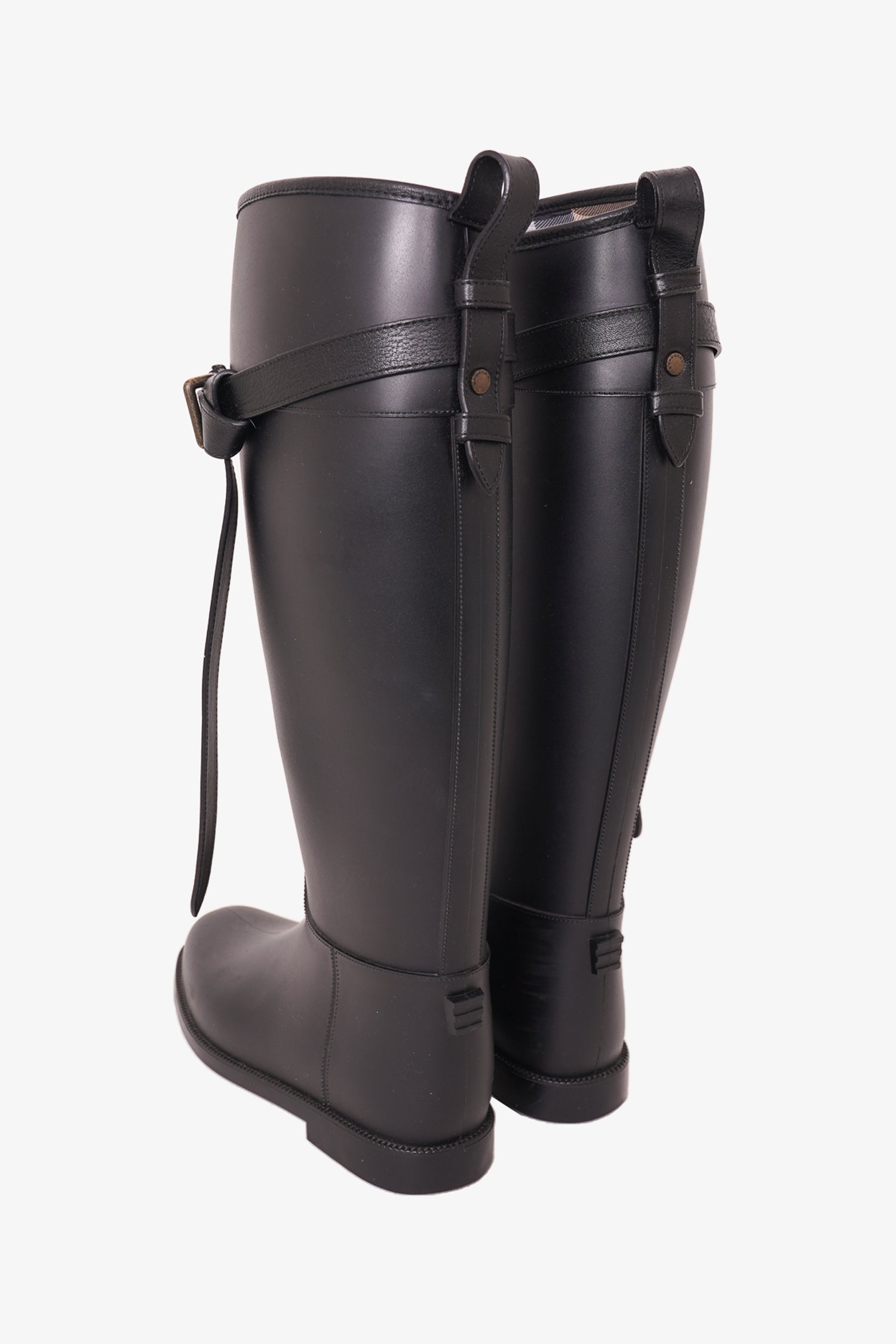 Refresh availabilityBurberry Black Trim Rubber Rain Boots. Round toe. Buckle detail. Tonal stitching.