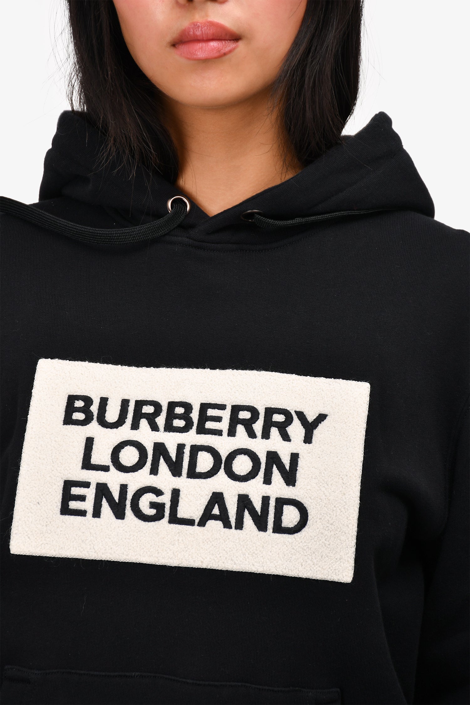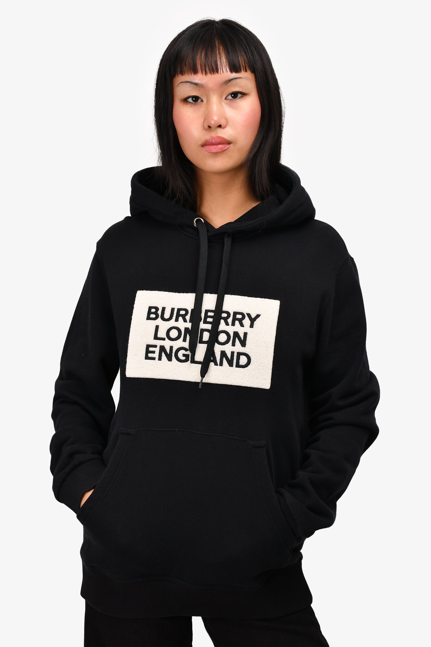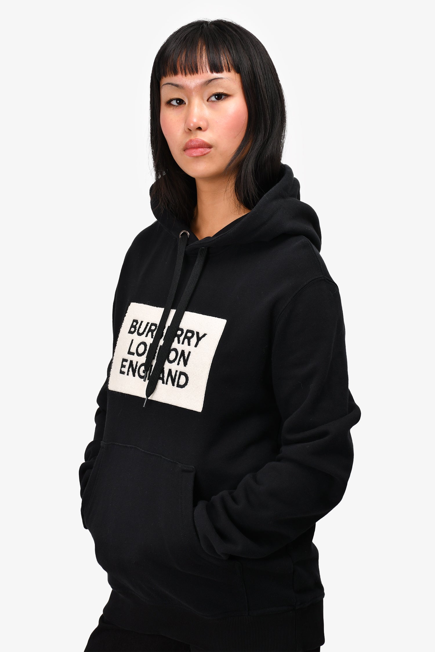 Refresh availabilityBurberry Black/White Logo Patched Hoodie. Pull-on. Front pocket. Ribbed cuffs and hem.