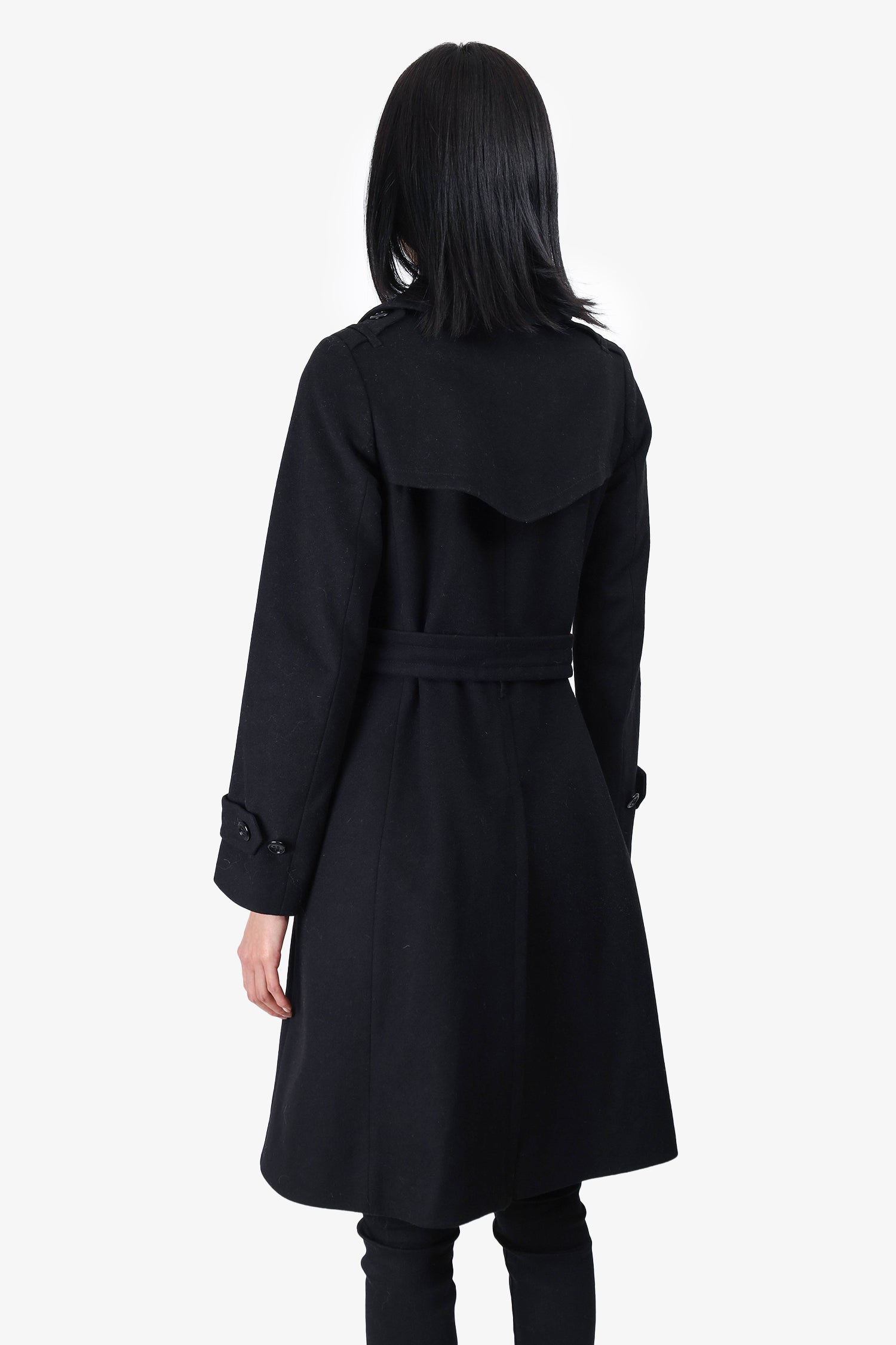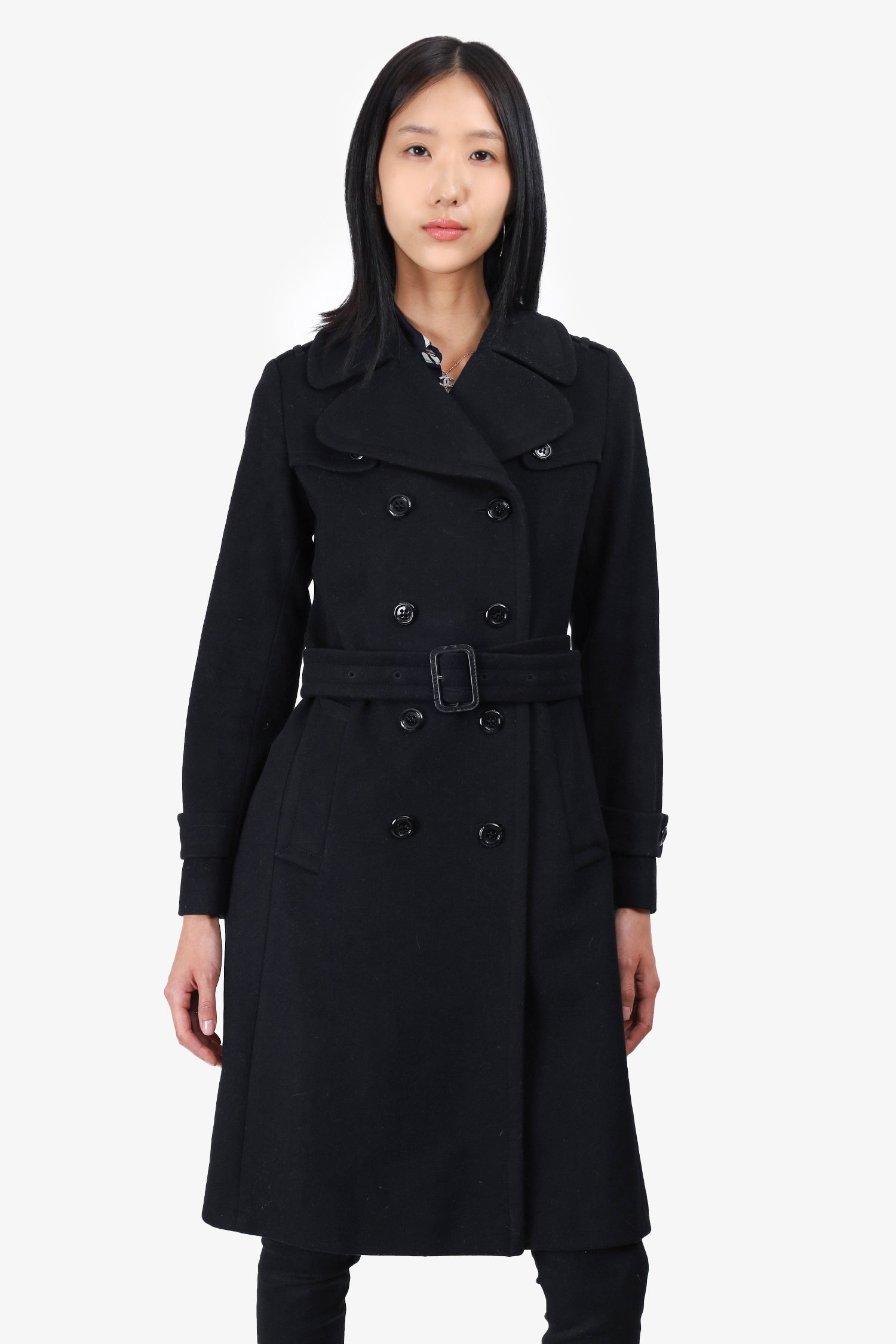 Refresh availabilityBurberry Black Wool/Cashmere Belted Coat. Collared neckline. Front button-up closure. 2 front slip pockets. Adjustable pull-through belt around waist. Lined. Tonal stitching.