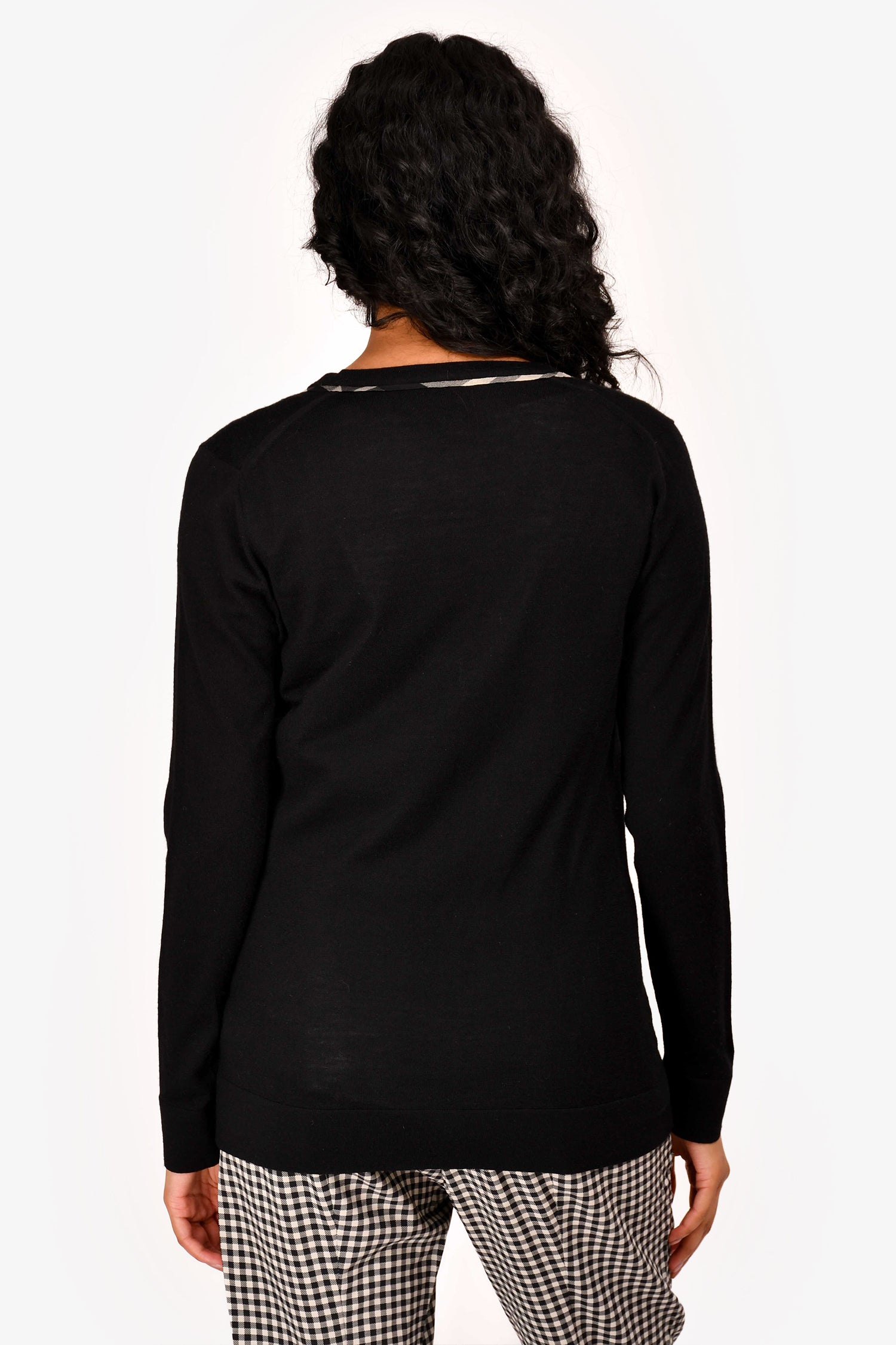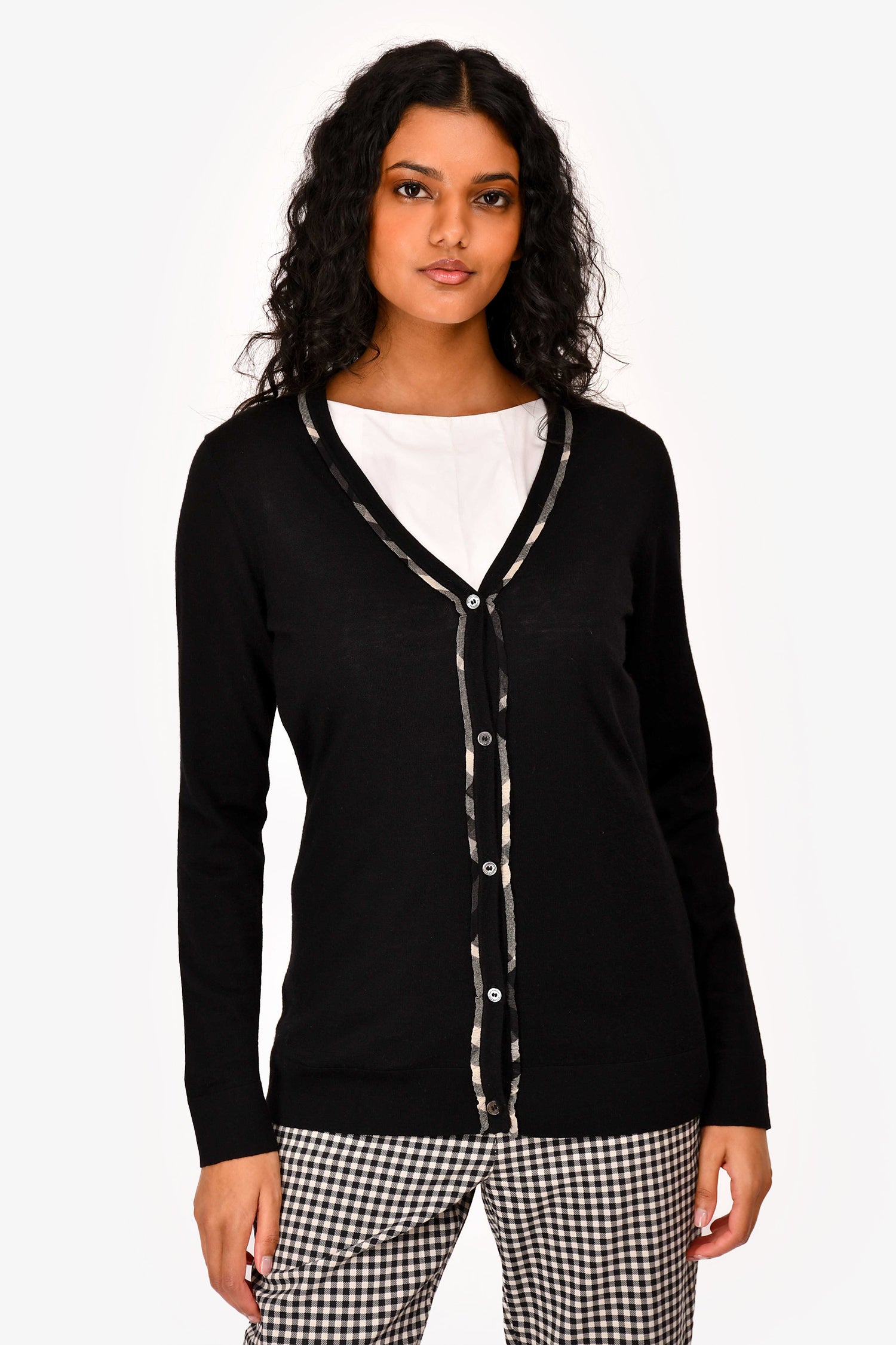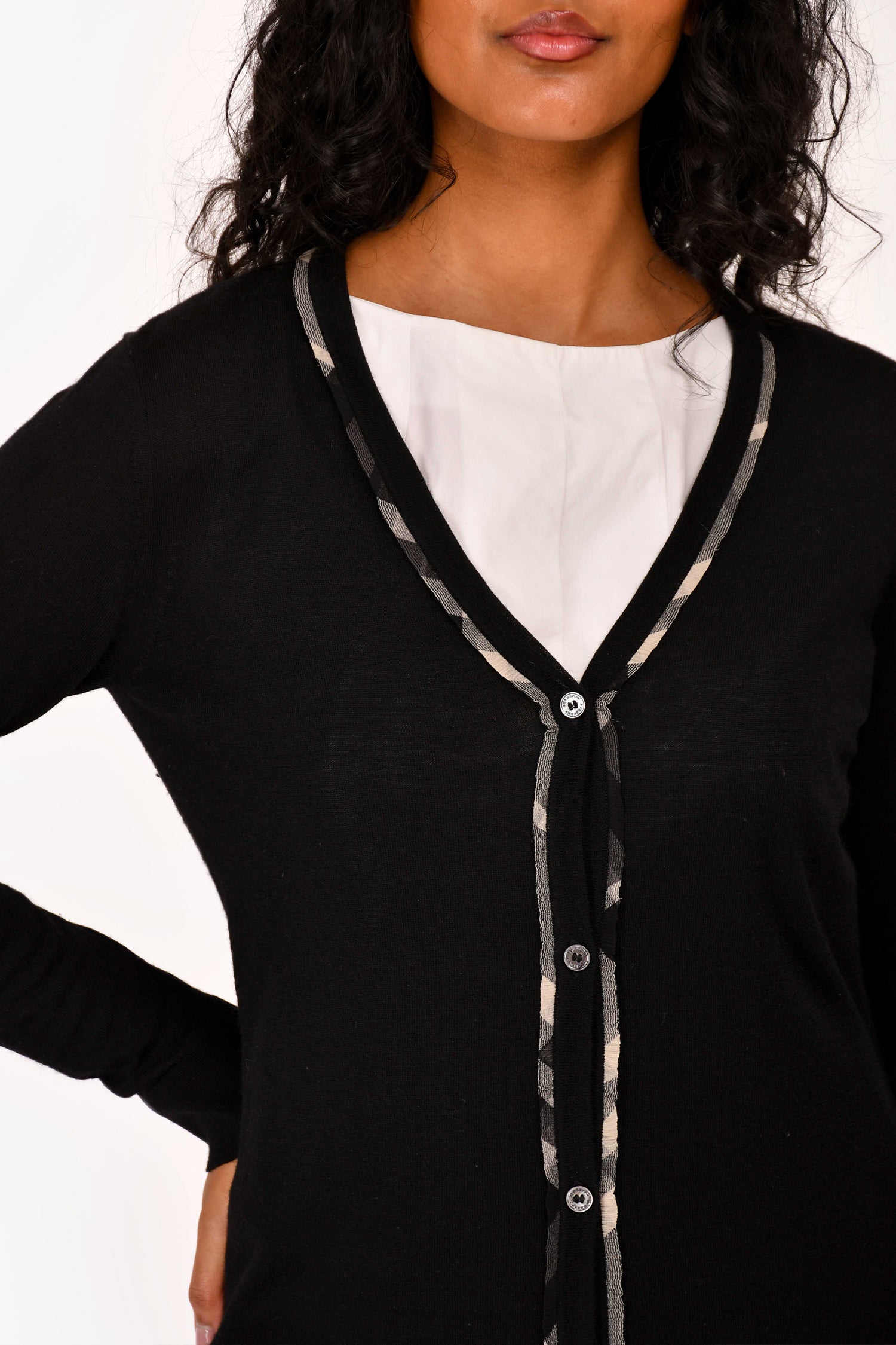 Refresh availabilityBurberry Black Wool Cashmere Blend Cardigan. Front button-down closure. Ribbed coffs and hem. Tonal stitching.