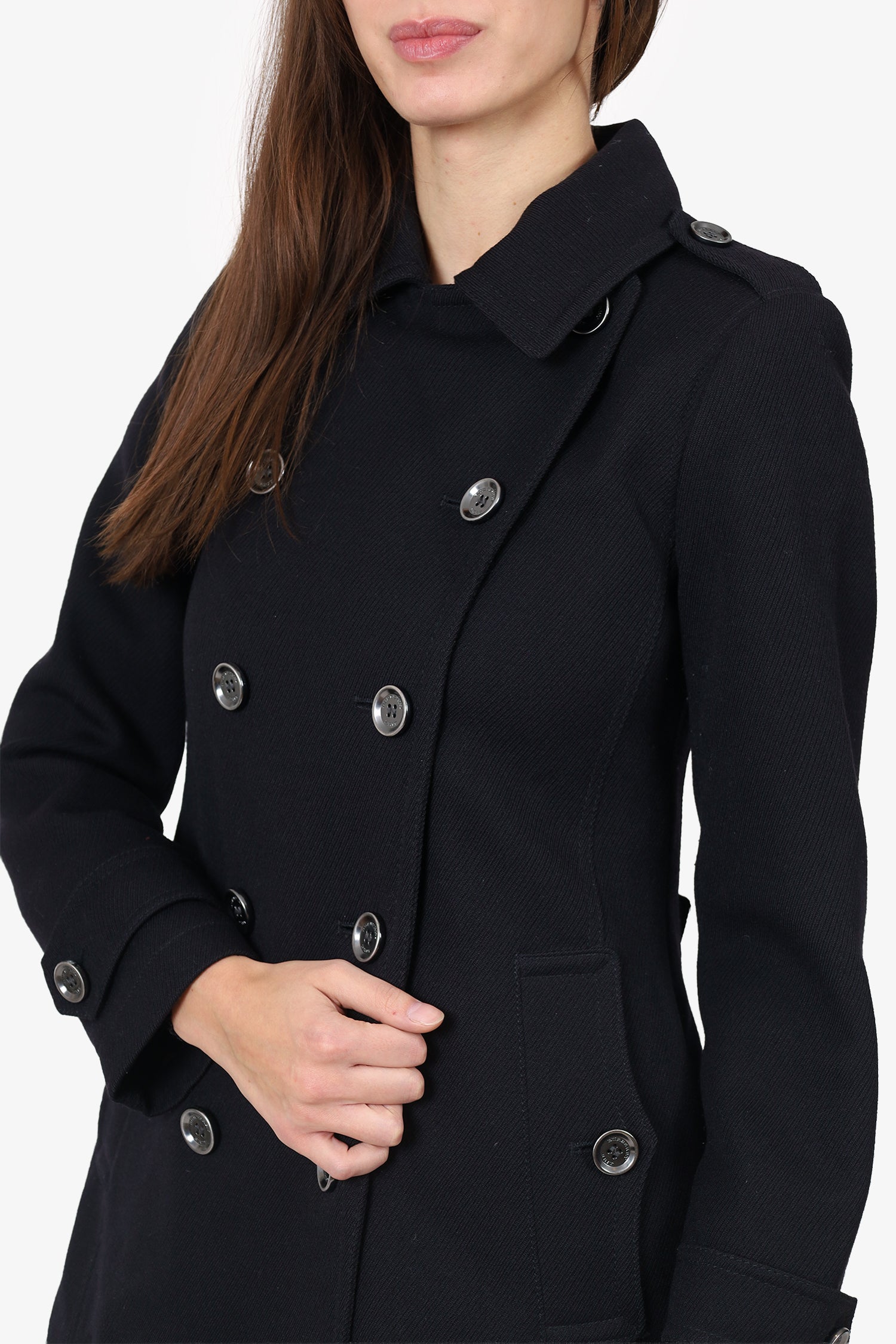 Refresh availabilityBurberry Black Wool Double Breasted Coat. Pull-on. Collared neckline. Front button-up closure. Shoulders and sleeve cuffs with button-up closure. 2 exterior front pockets with button-up closure. rear button-up closure. Lined interior. Gunmetal-tone hardware. Tonal stitching.