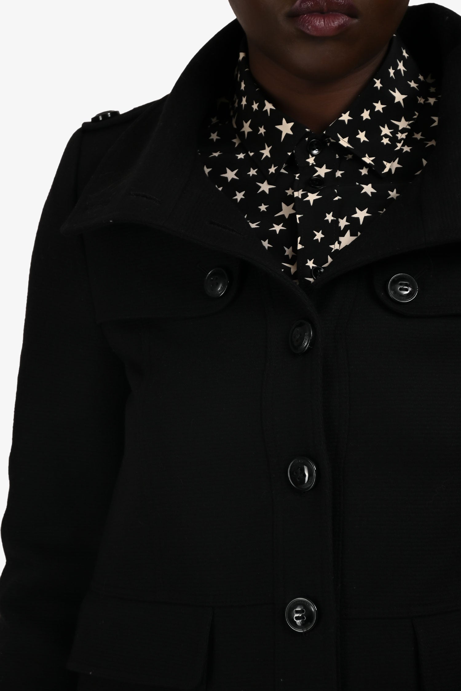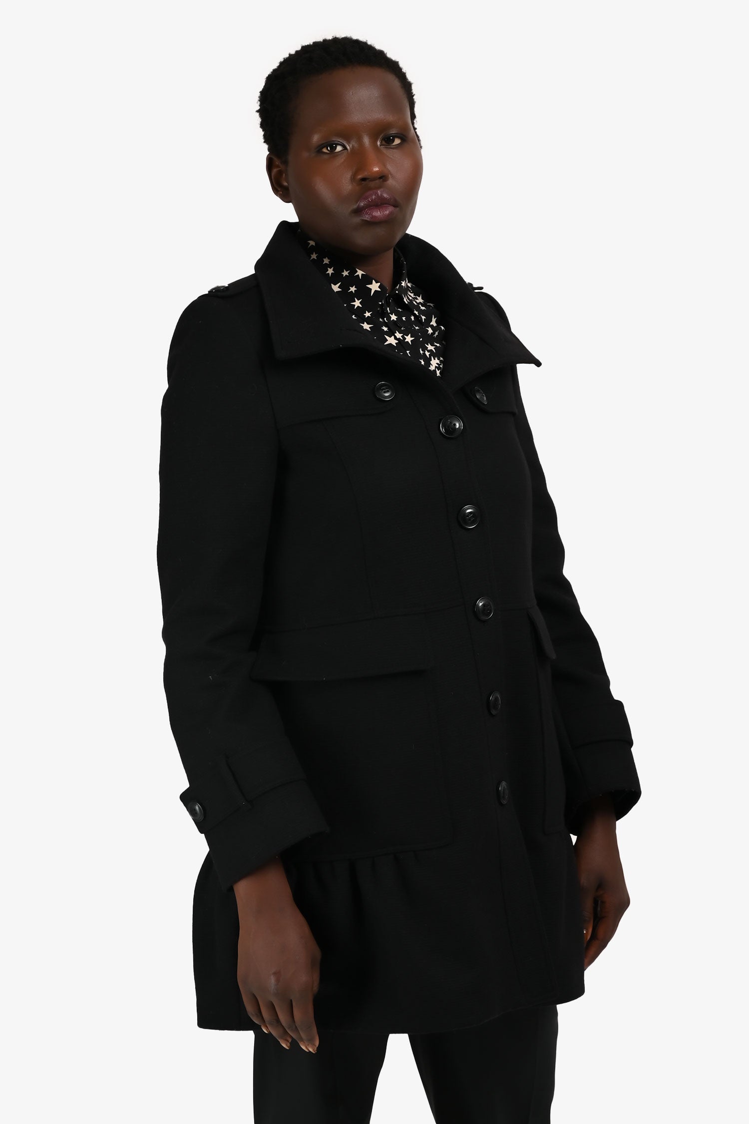 Refresh availabilityBurberry Black Wool/Cashmere Ruffled Hem Coat. Front button-up closure. Front pockets. Lined. Button closure on the cuffs.