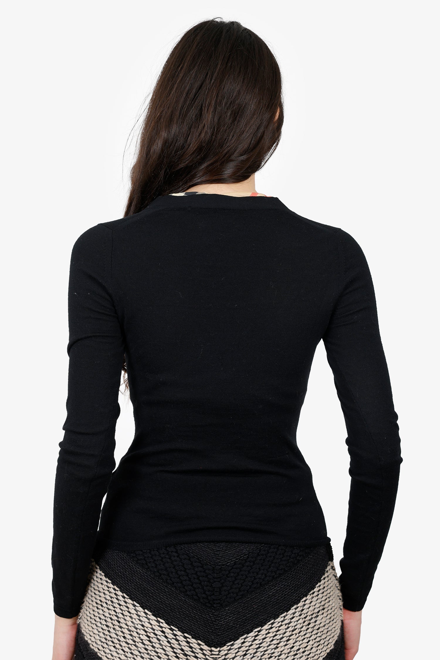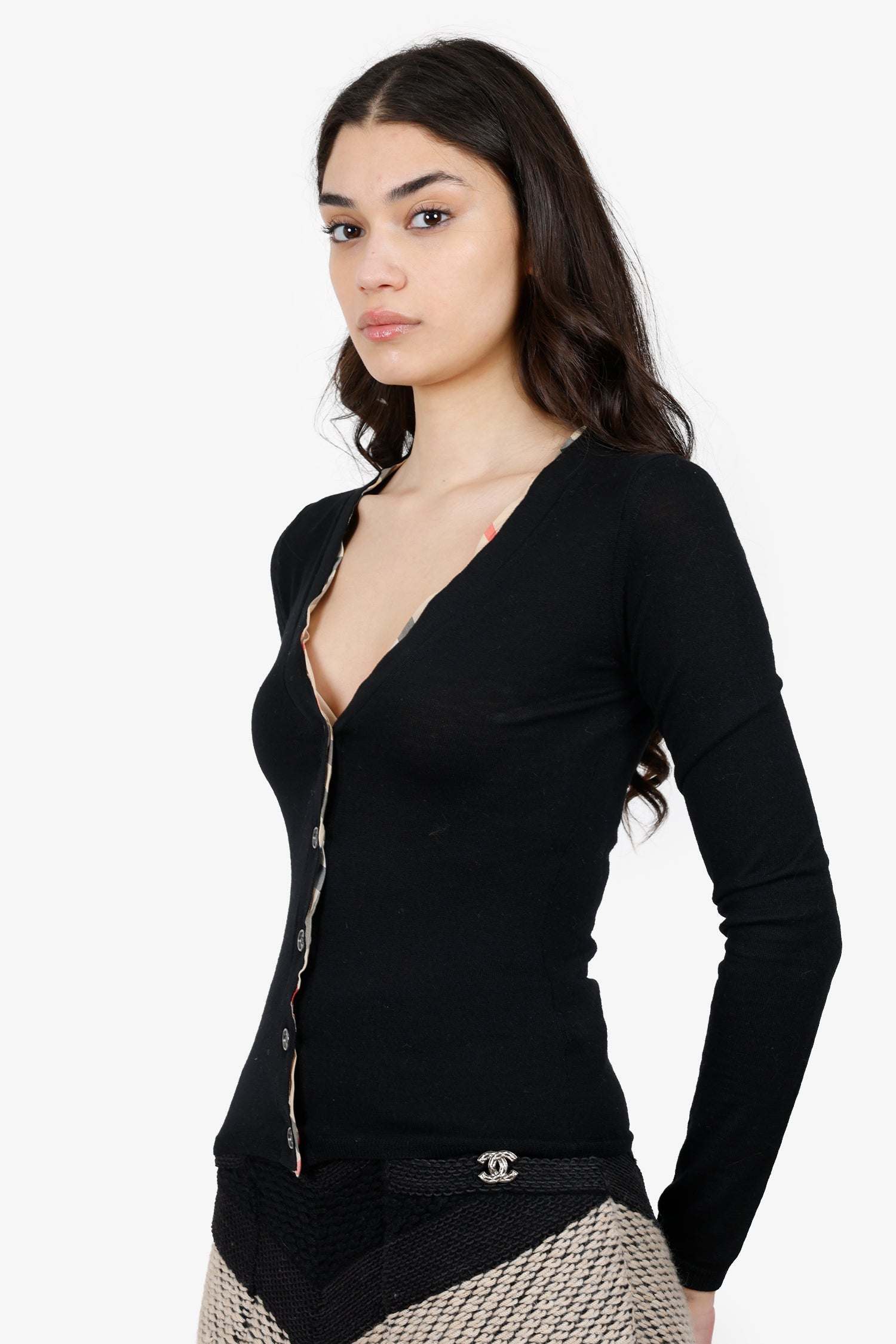 Refresh availabilityBurberry Black/Brown Trim Detailed Cardigan. V-neckline. Front button-up closure. Tonal stitching.