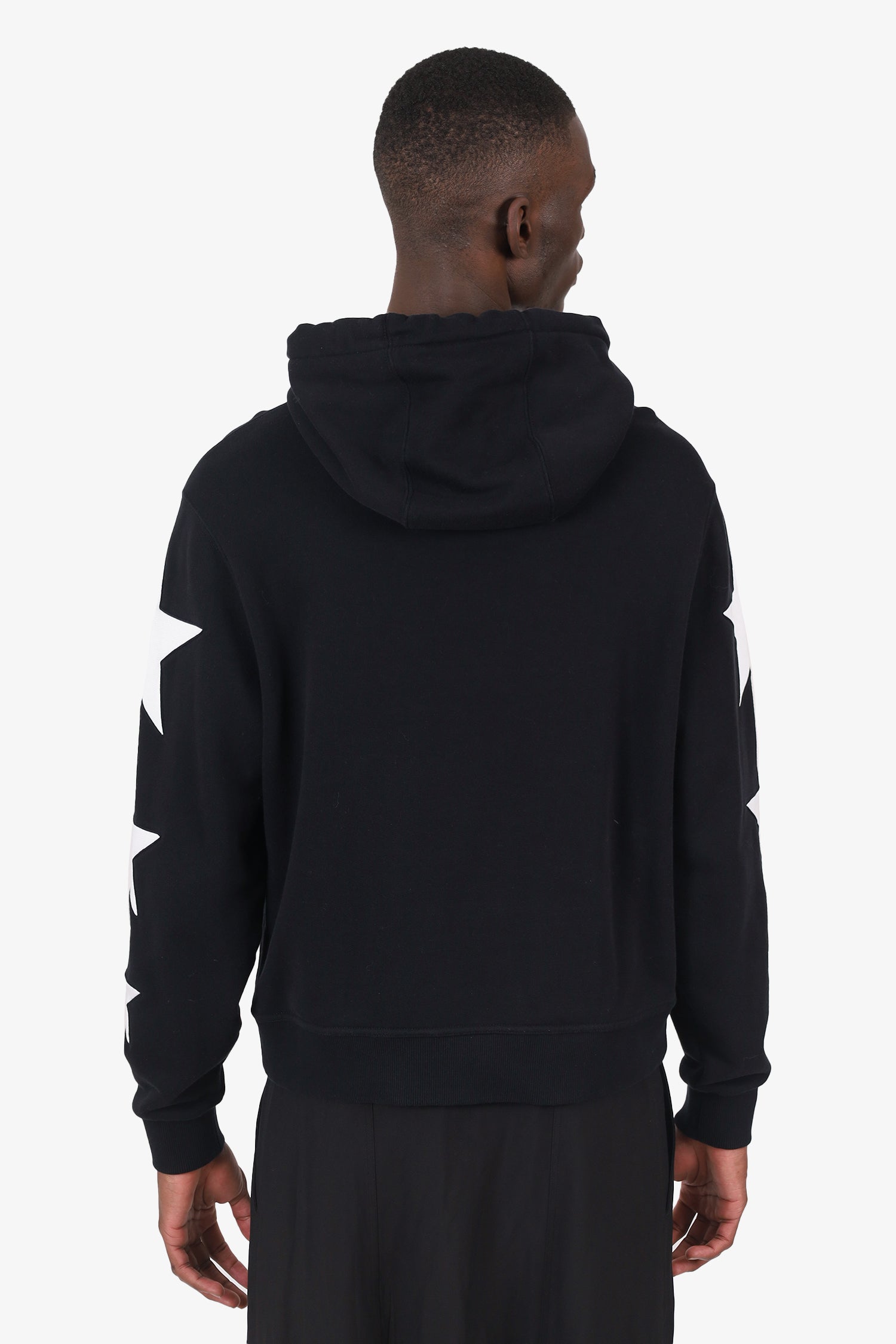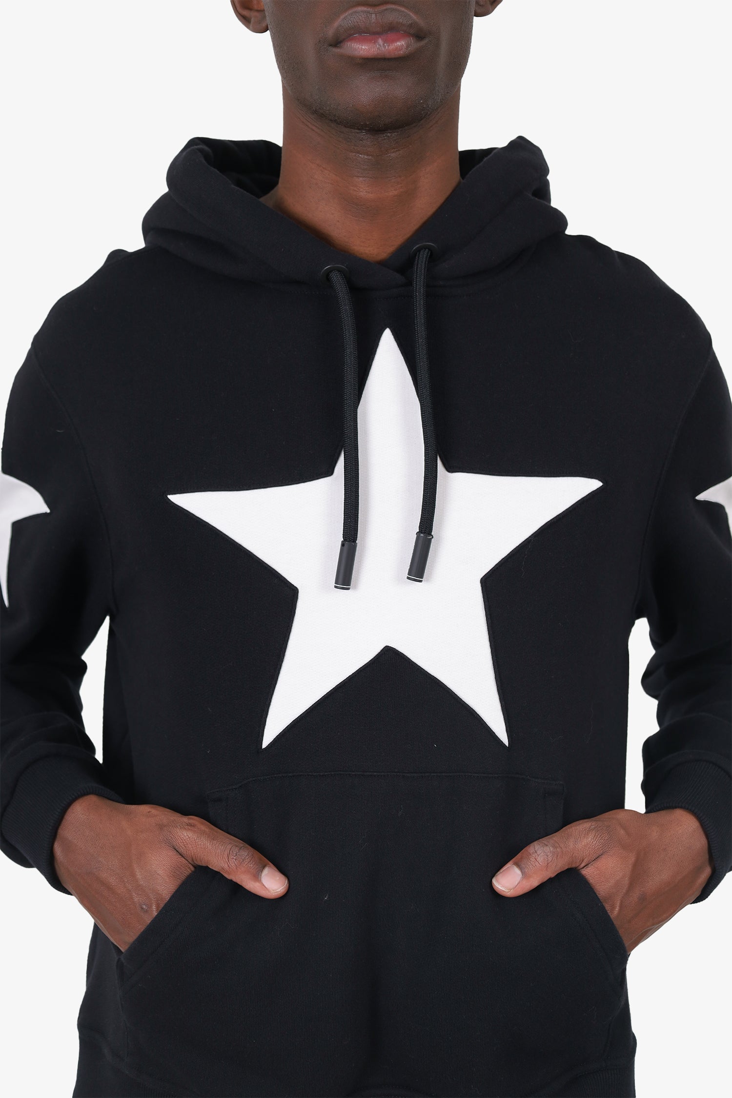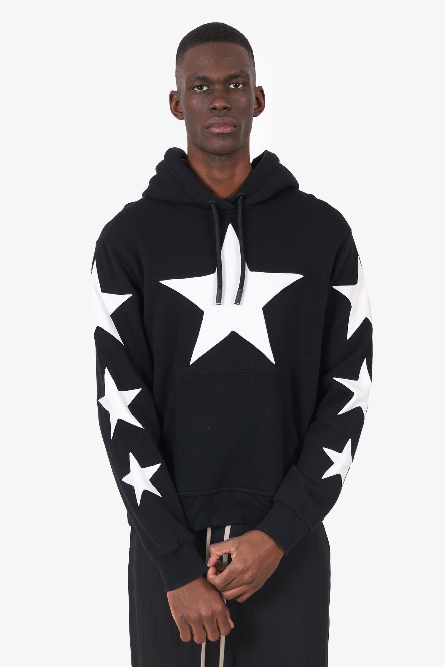 Refresh availabilityBurberry Black/White Star Hoodie. Pull-on. Hooded with adjustable cinching drawstring closure. Front kangaroo pocket. Ribbed sleeve cuffs. Tonal stitching.