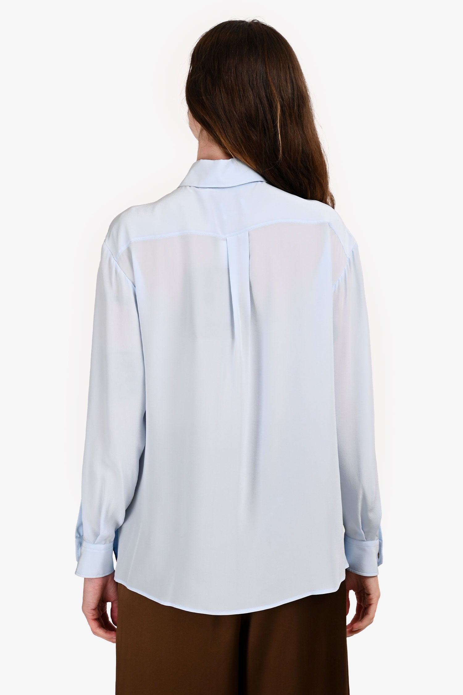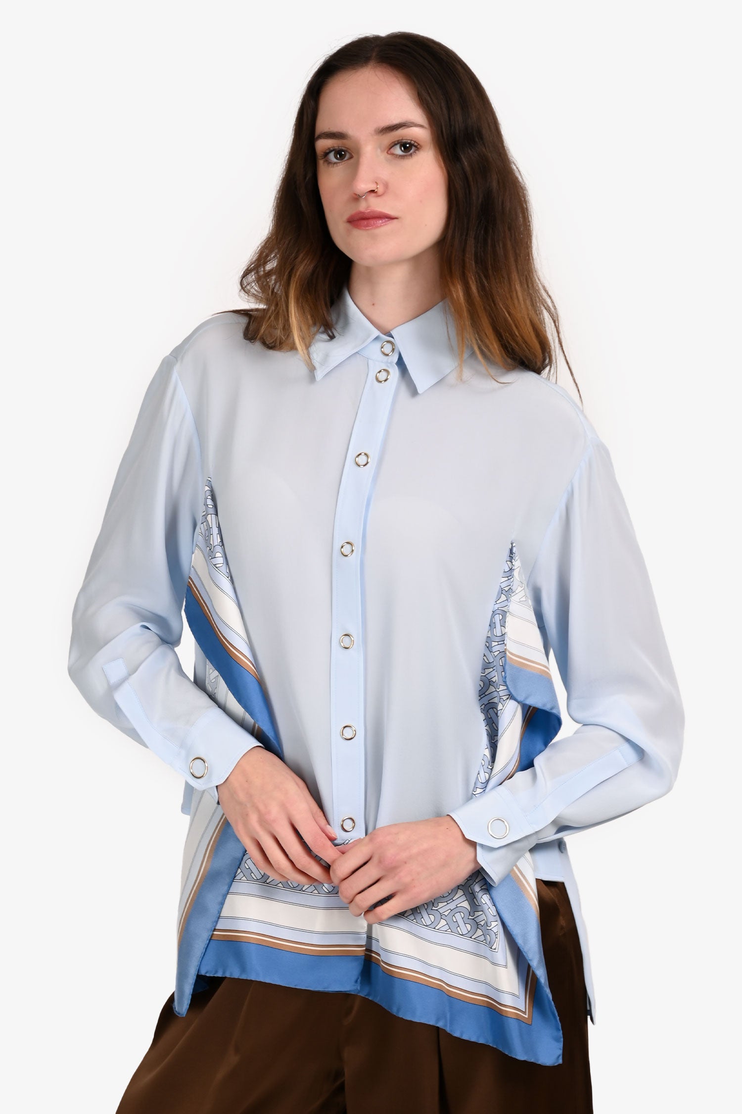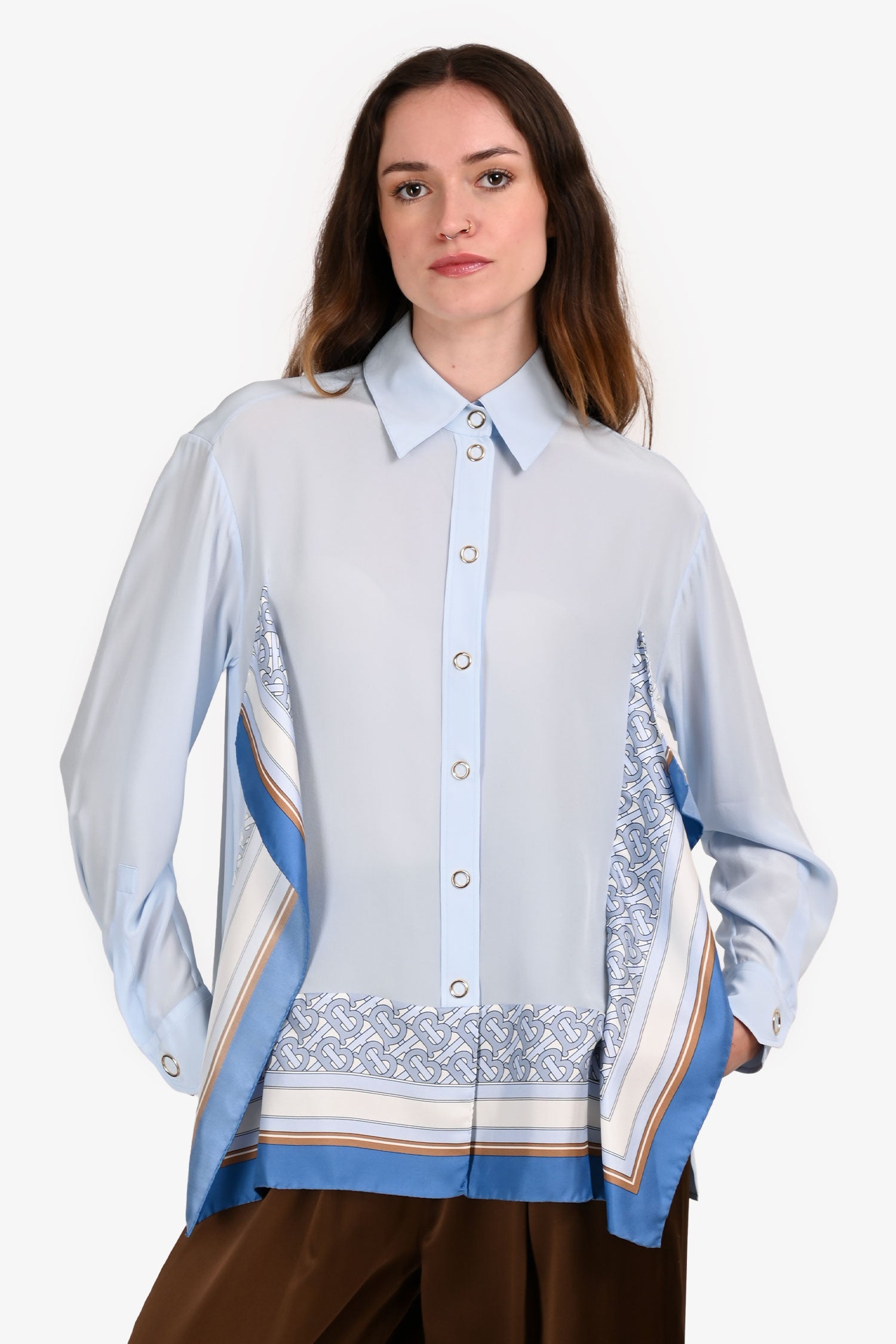 Refresh availabilityBurberry Blue/Brown Silk 'TB' Printed Scarf Button-Up Shirt. Pull-on. Point collar with front snap closure. Long sleeves with button cuffs. Scarf-print silk panels. Straight hem with side vents. Tonal stitching.