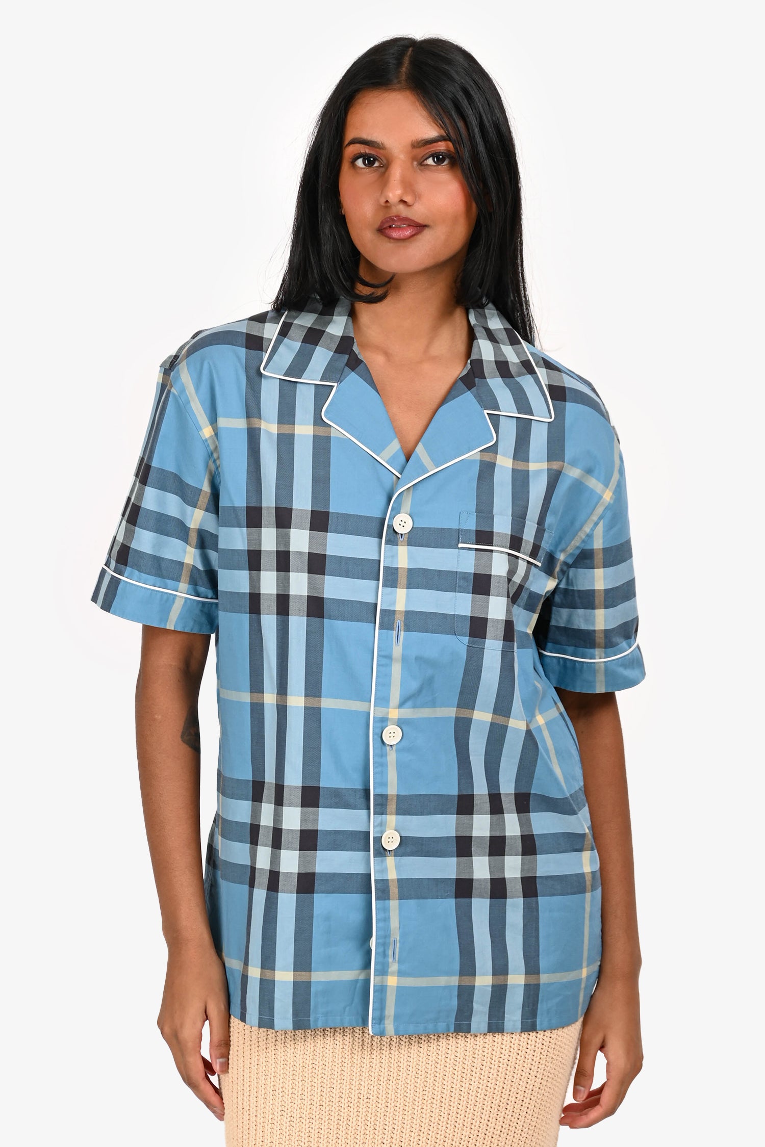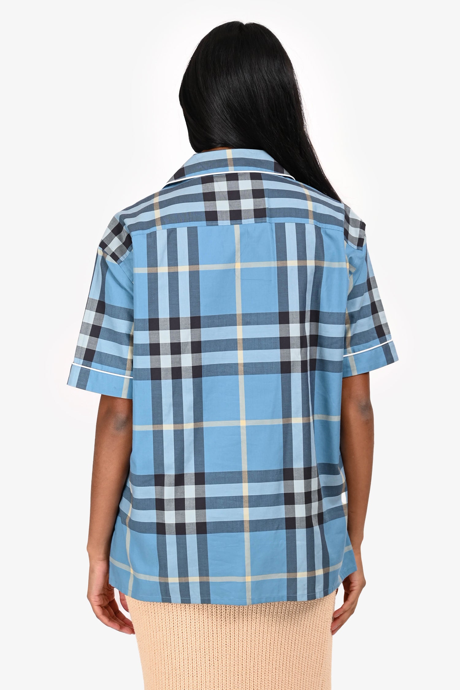 Refresh availabilityBurberry Blue Check Button Down Shirt. Slip-on. Collared neckline. Front button-up closure. Single front chest pocket. Tonal stitching.
