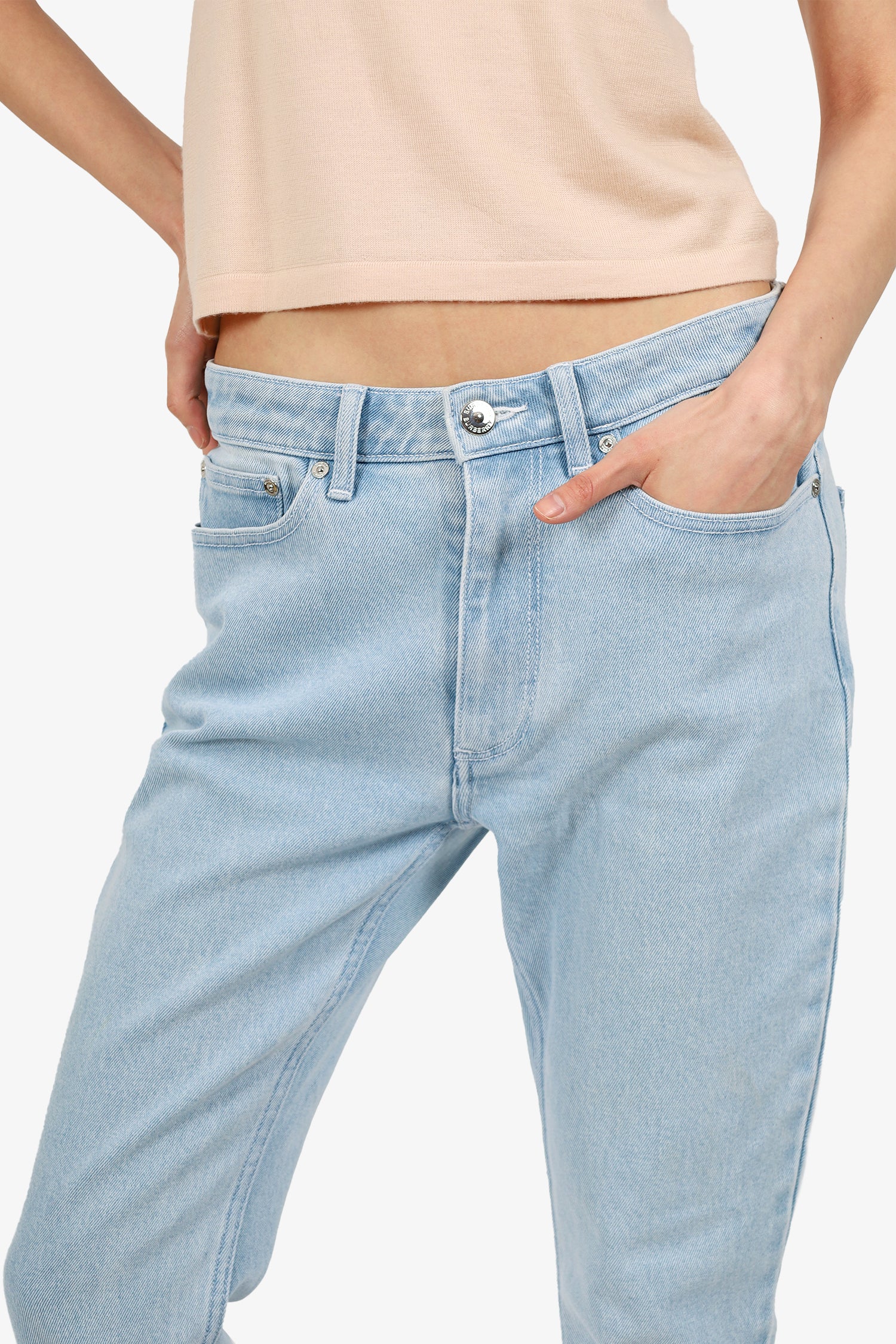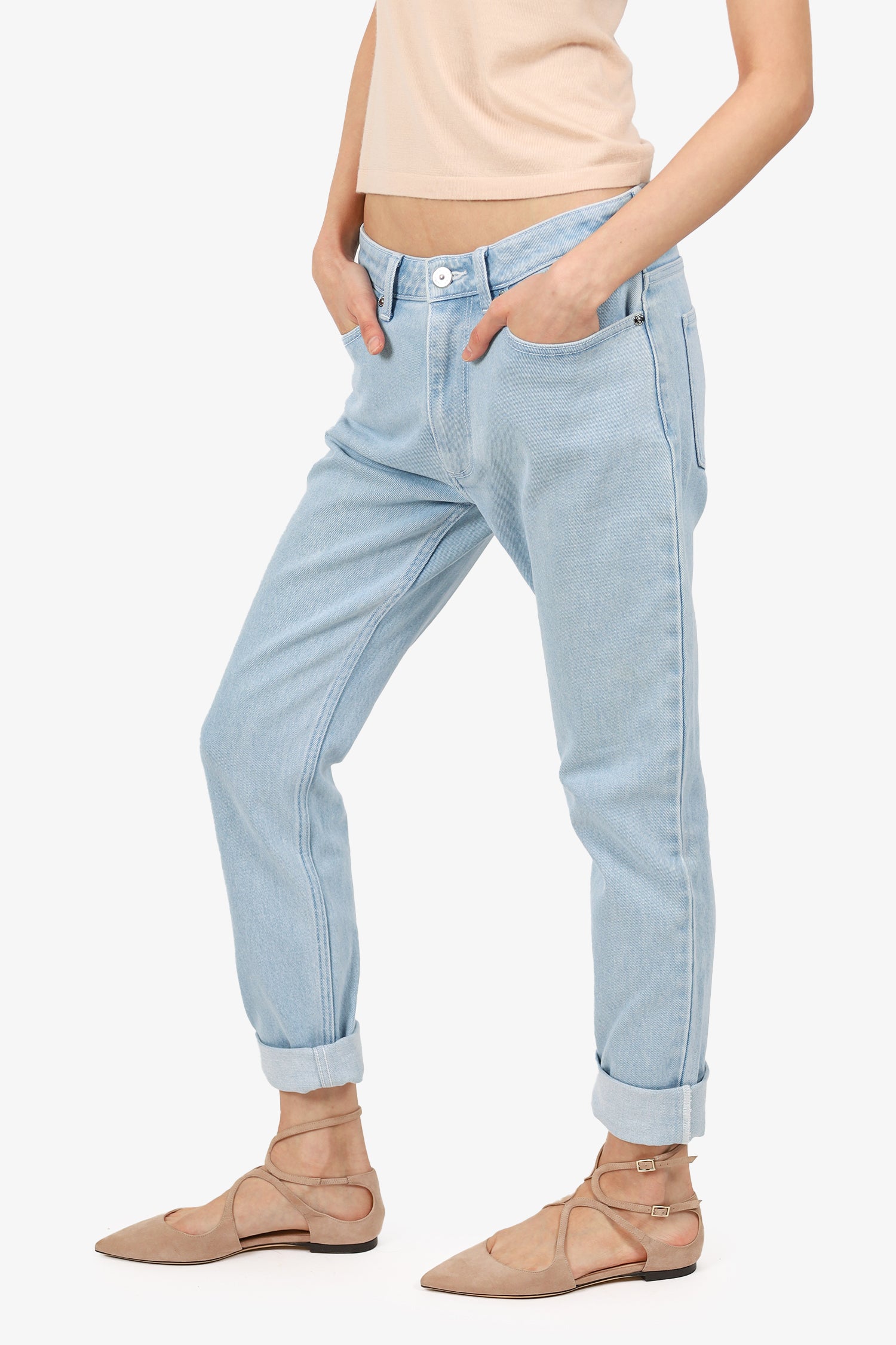 Refresh availabilityBurberry Blue Denim Straight Leg Jeans. Front zip with button-up closure. Belt loops around waistband. 5 exterior slip pockets; 2 front with 1 mini compartment, and 2 rear. Logo patch on rear right pocket. Silver-tone hardware. Tonal stitching.