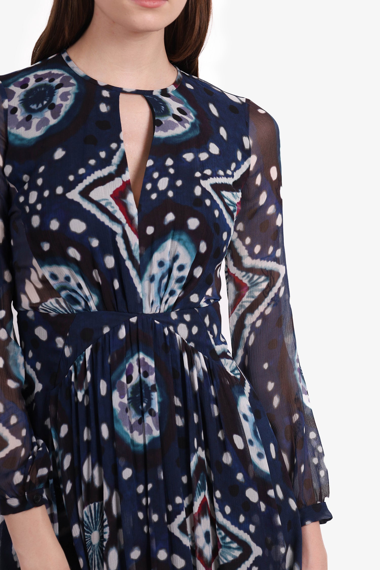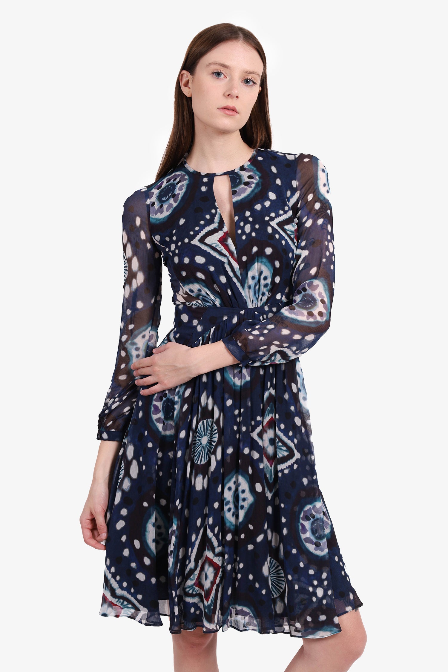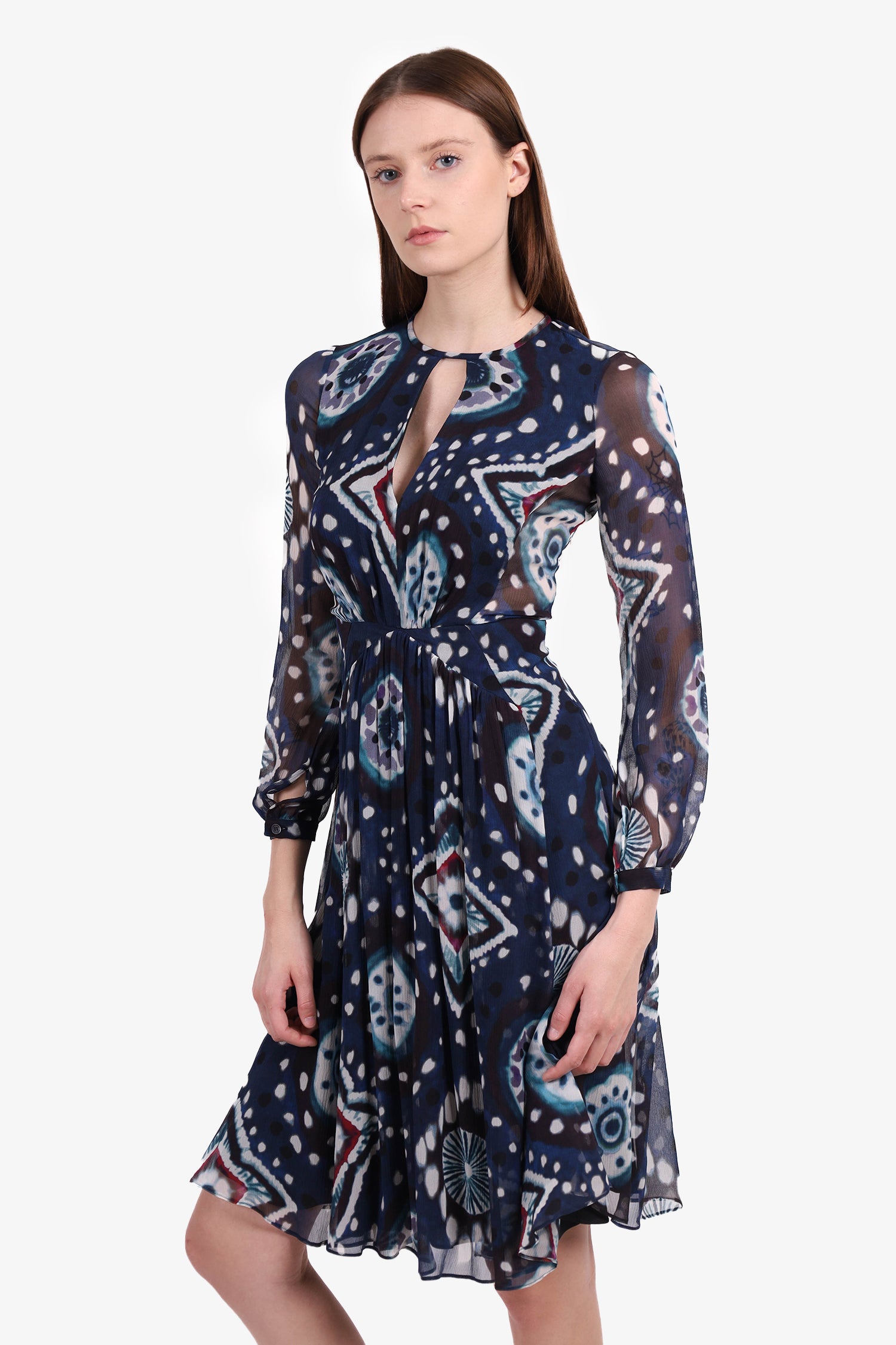 Refresh availabilityBurberry Blue/White Silk Tie-Dye Print Chiffon Midi Dress. Back zip and hook closure. Tonal stitching. Partially lined.