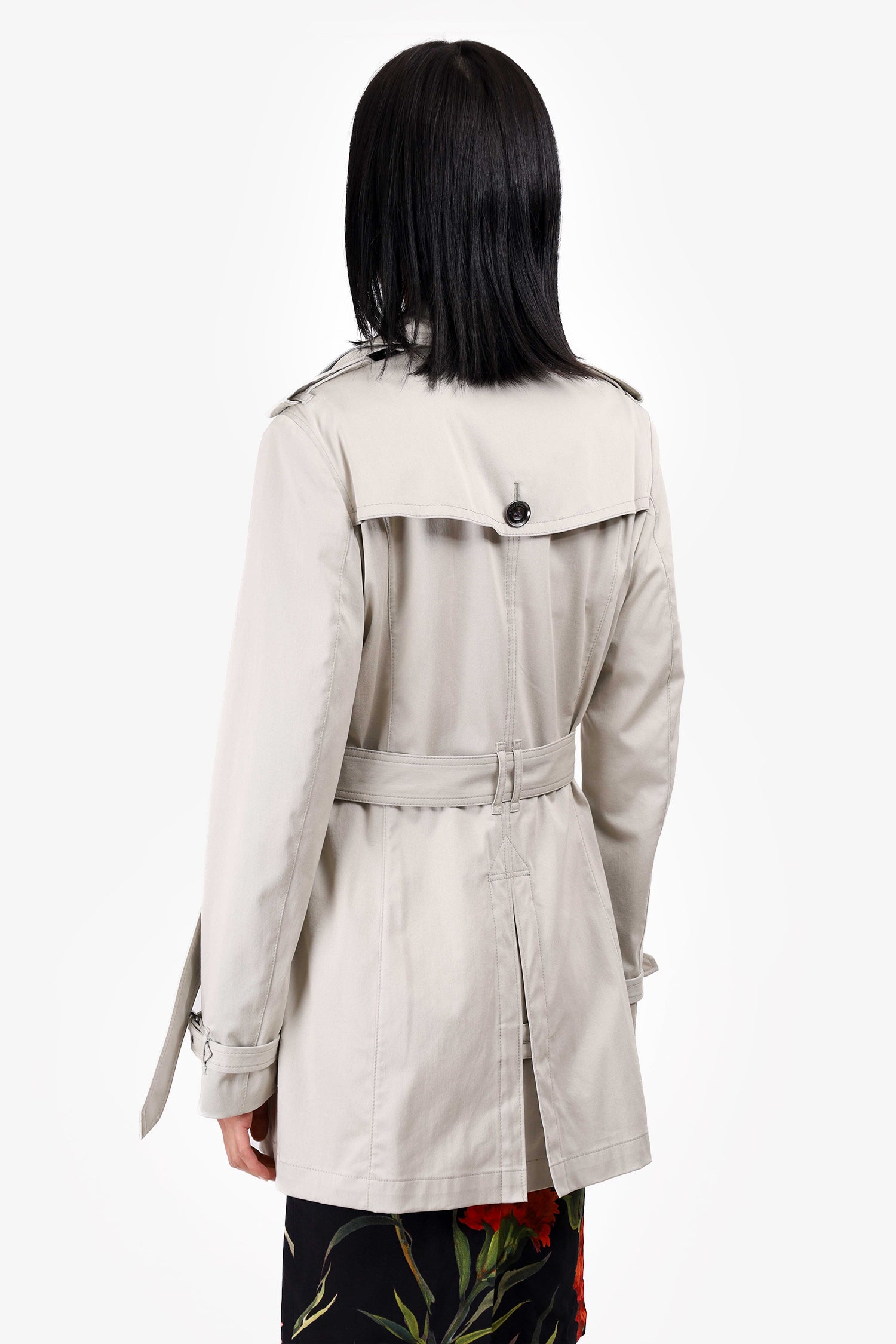 Refresh availabilityBurberry Brit Beige Short Double Breasted Trench Coat. Removable belt. Buckled cuff detailing. Silver-tone hardware. Lined. Tonal stitching.