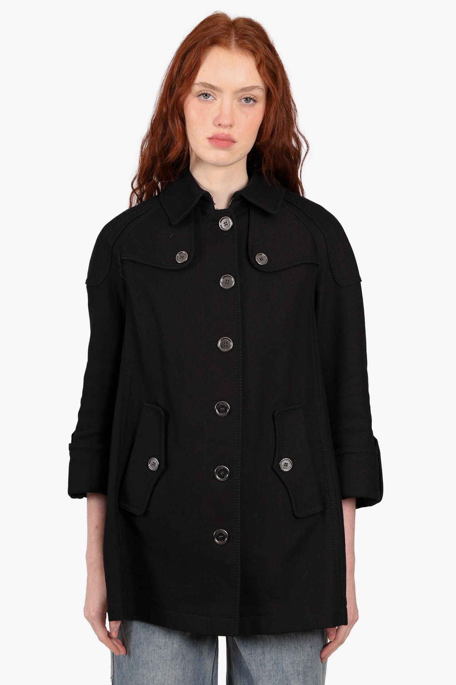 Refresh availabilityBurberry Brit Black Cotton Button Up Coat. Front button closure. 2 front pockets with top flap closure. Button closure on cuffs. Unlined. Tonal stitching. Silver hardware.