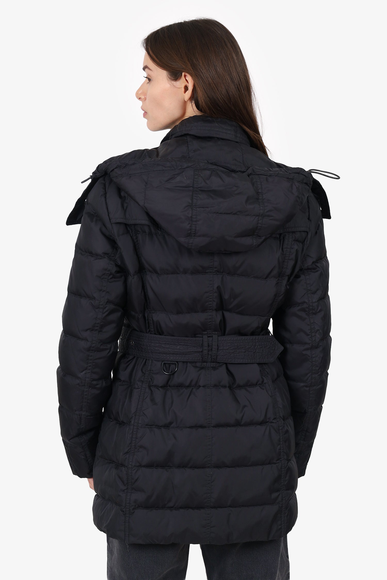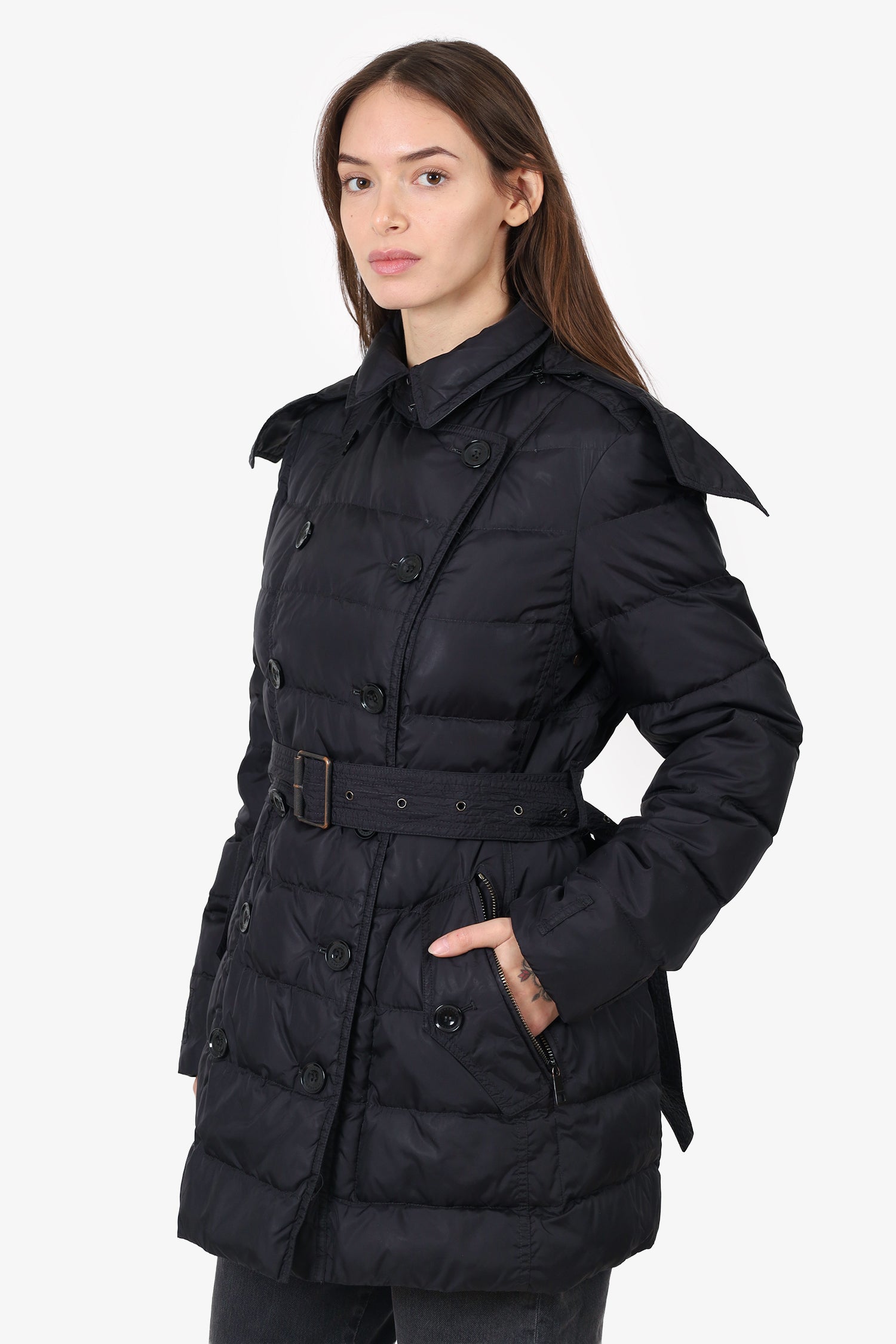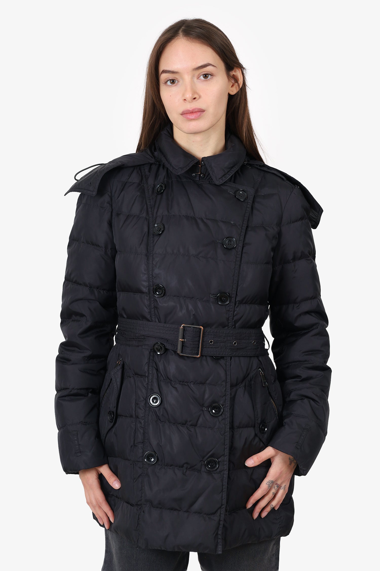 Refresh availabilityBurberry Brit Black Puffer Coat With Hood. Pull-on. High neckline. Detachable hood with zip-off closure. Button-up and cinch cord closures to hood. Front button with zip and hook-up closure. Removable belt with adjustable pull-through buckle closure. 4 exterior front pockets; 2 button-up and and 2 zip-up. Lined interior. Gunmetal-tone hardware. Tonal stitching.