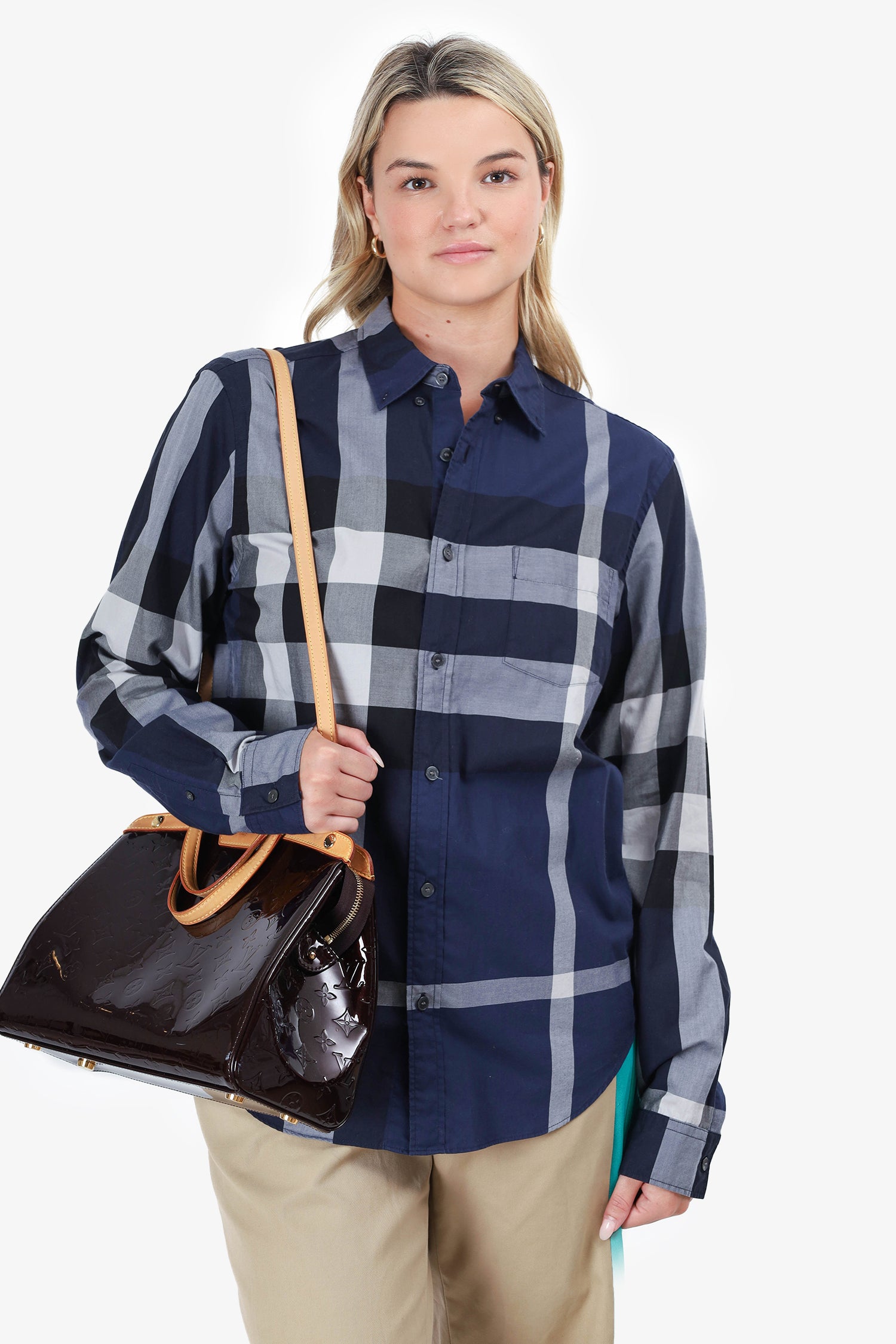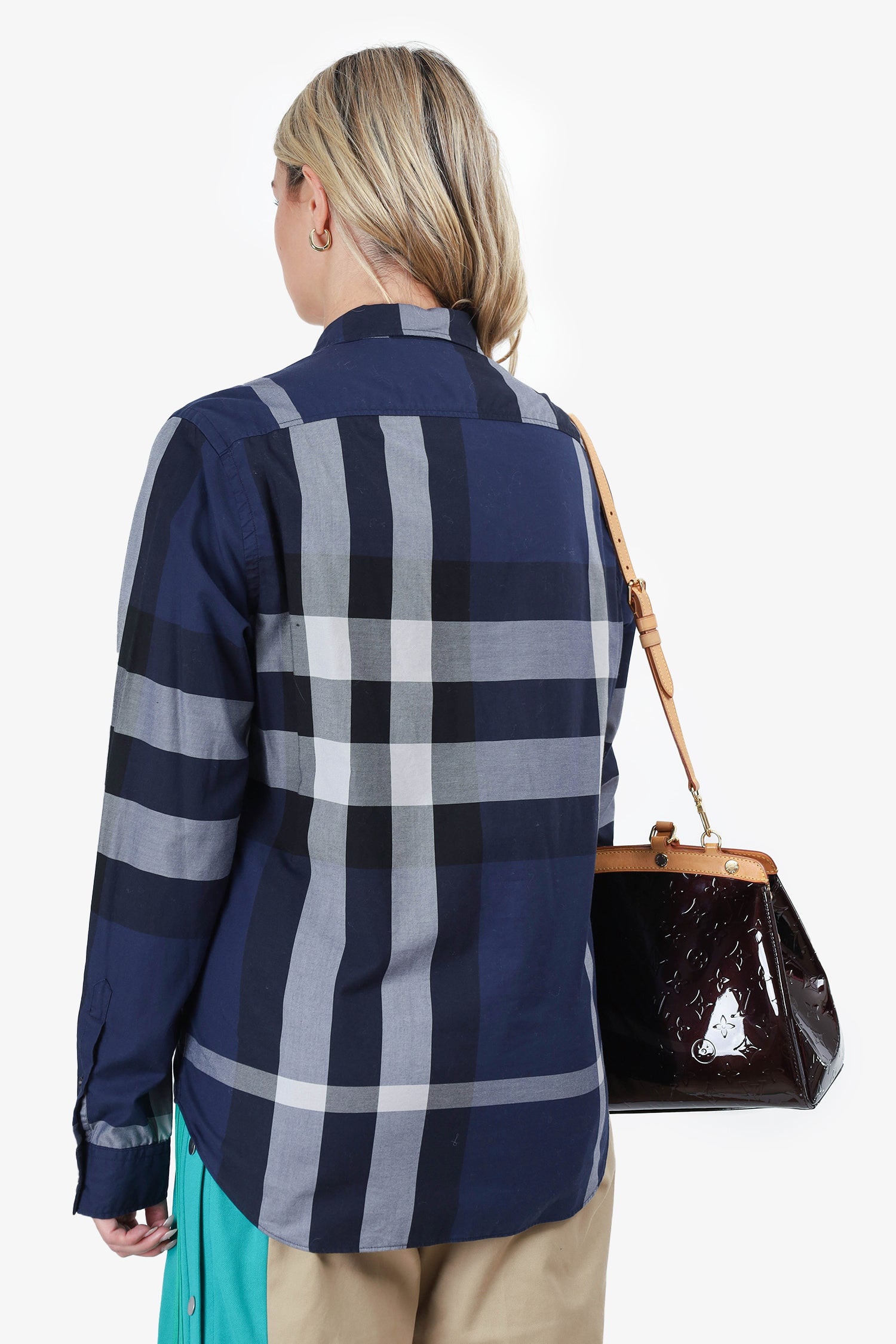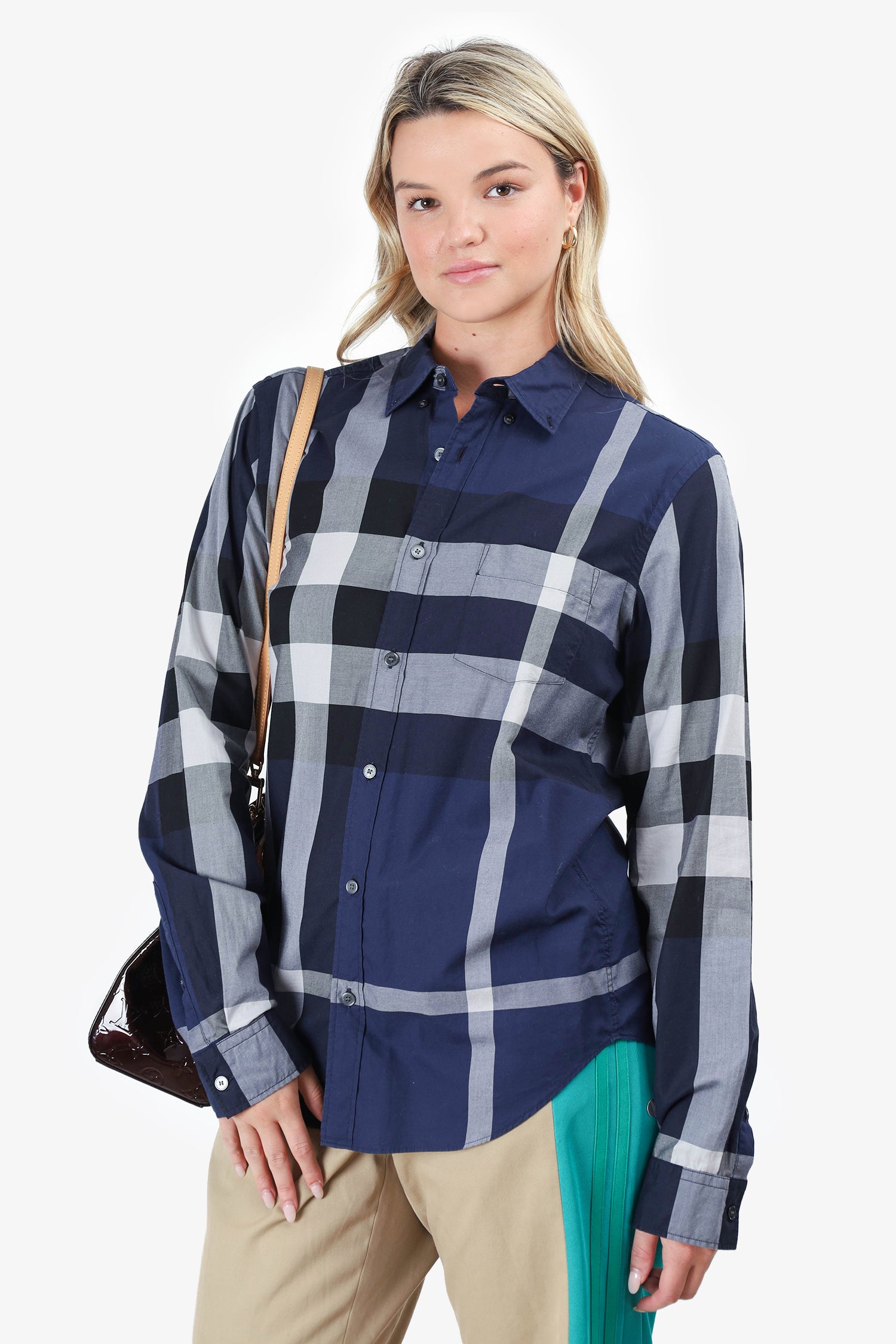 Refresh availabilityBurberry Brit Blue Check Long Sleeve Shirt. Front button closure. Front slip pocket. Buttoned cuffs. Curved hem. Unlined. Tonal stitching.