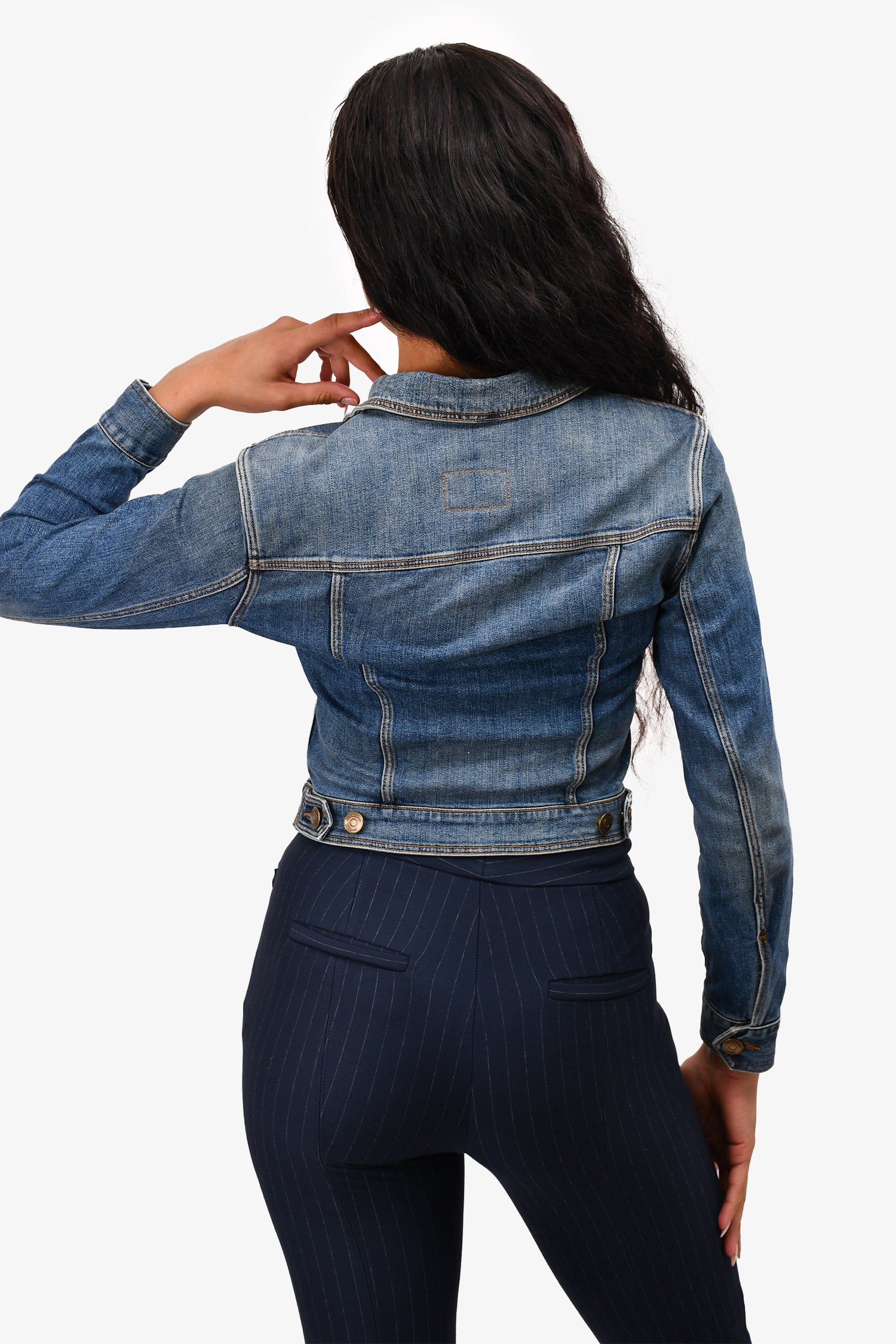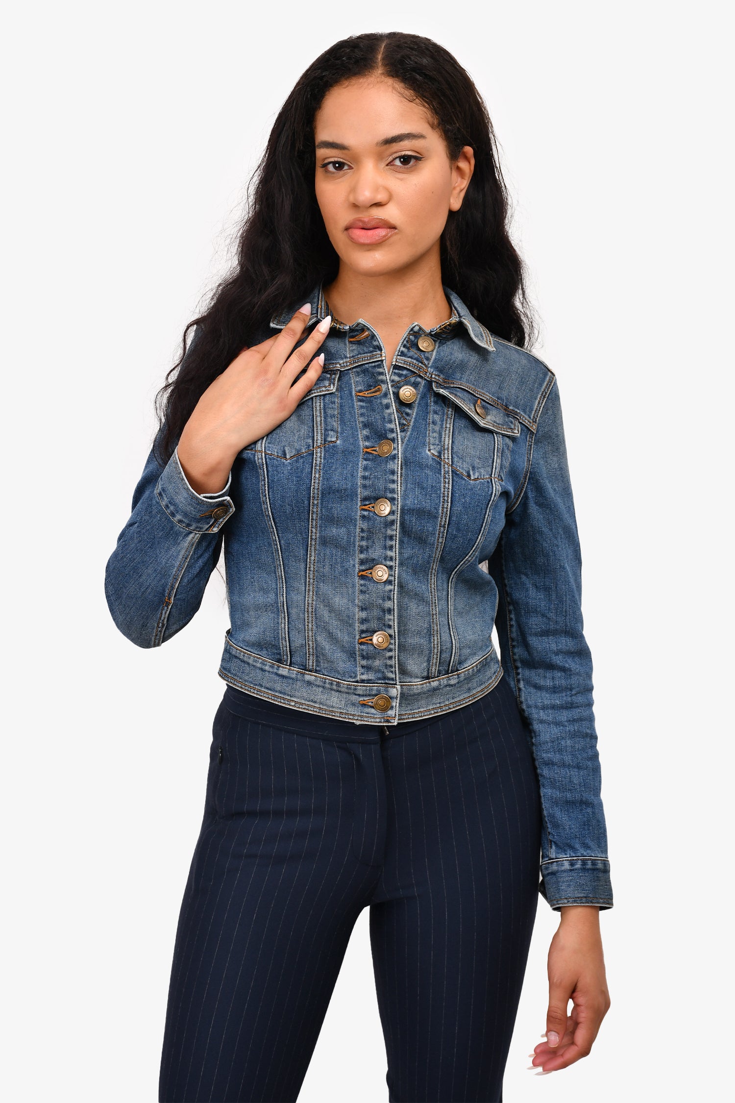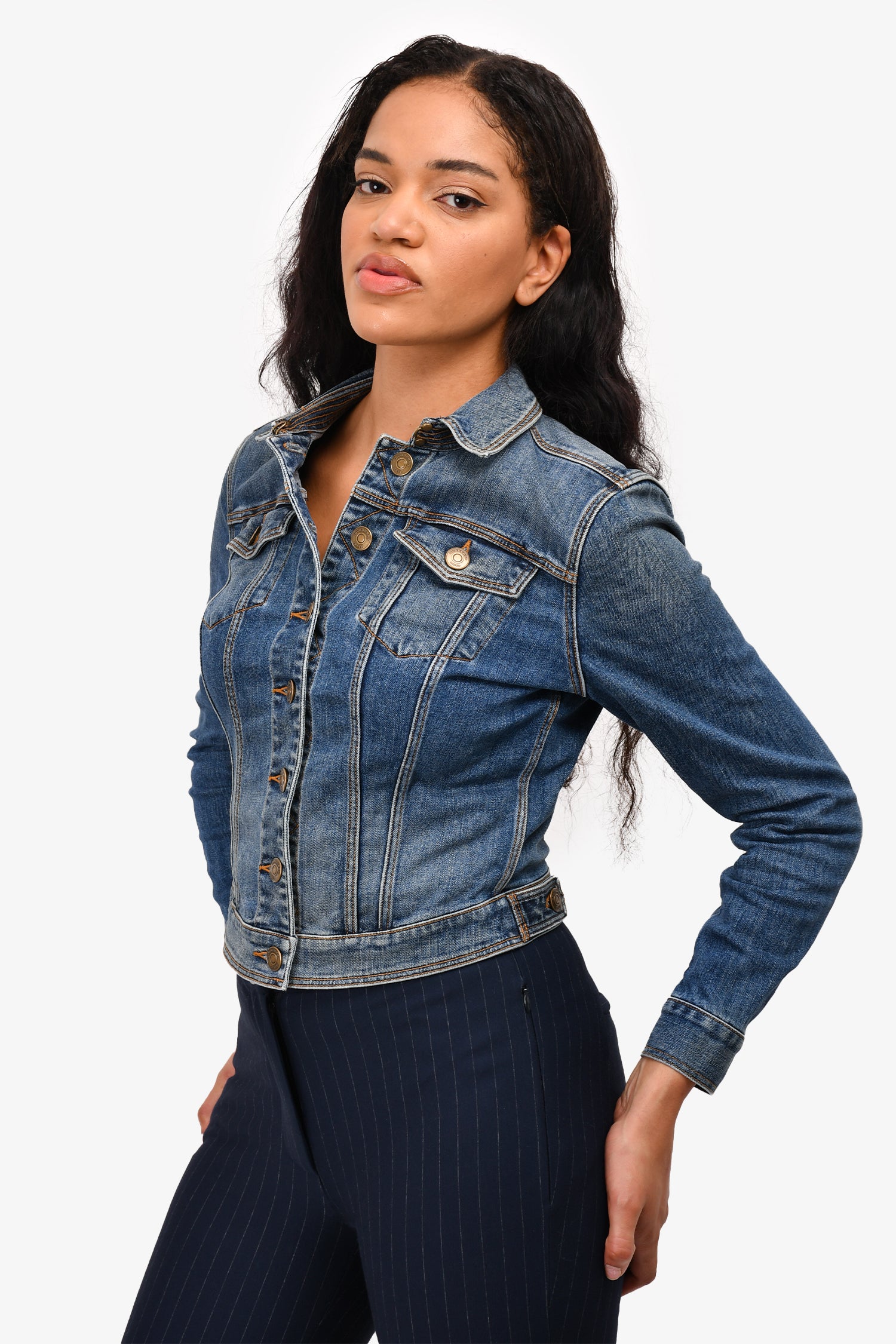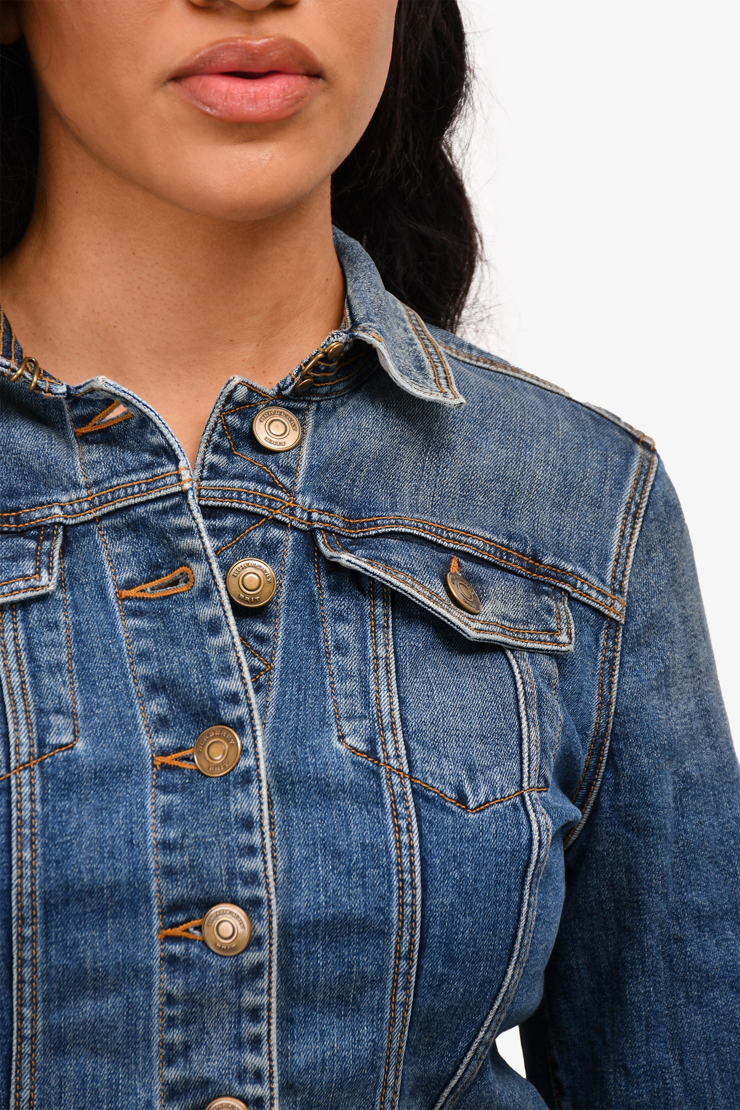 Refresh availabilityBurberry Brit Blue Denim Jacket. Gold-tone hardware. Two breast pockets. Fly hook closure at the collar. Button-up closure. Mid-wash. Tonal stitching.