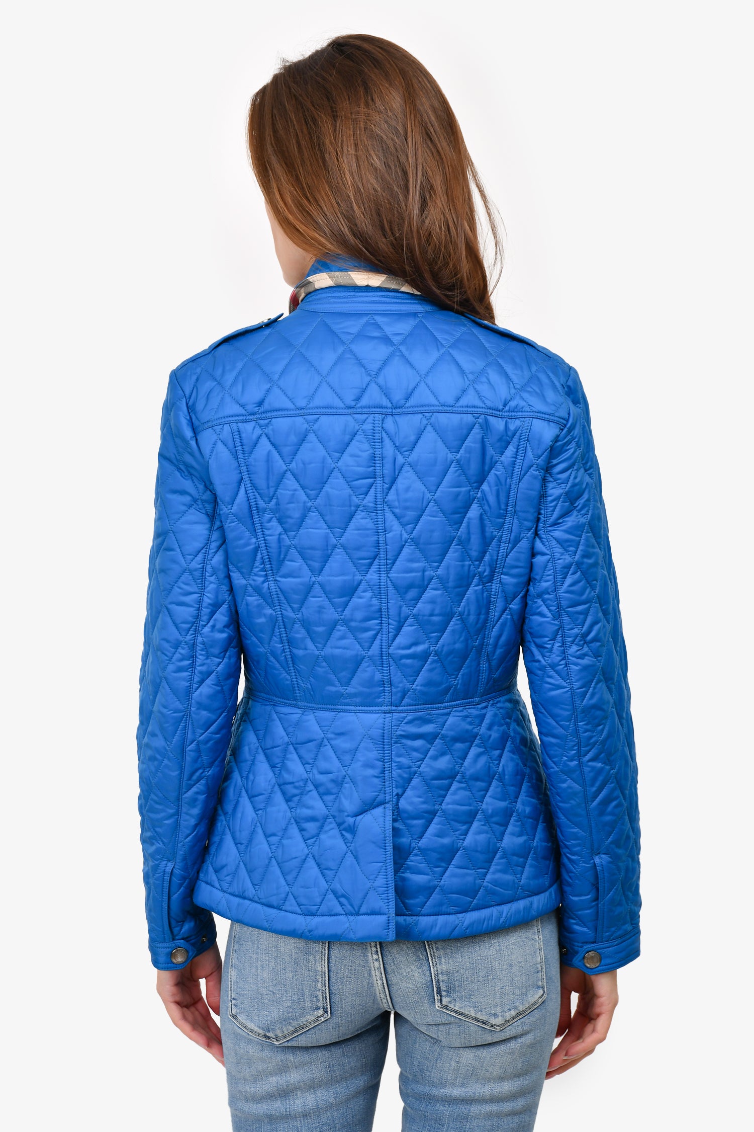 Refresh availabilityBurberry Brit Blue Quilted Zip Up Jacket. Front zip-up closure. Grey-tonal hardware. Front pockets. Snap-on button closure. Tonal stitching.