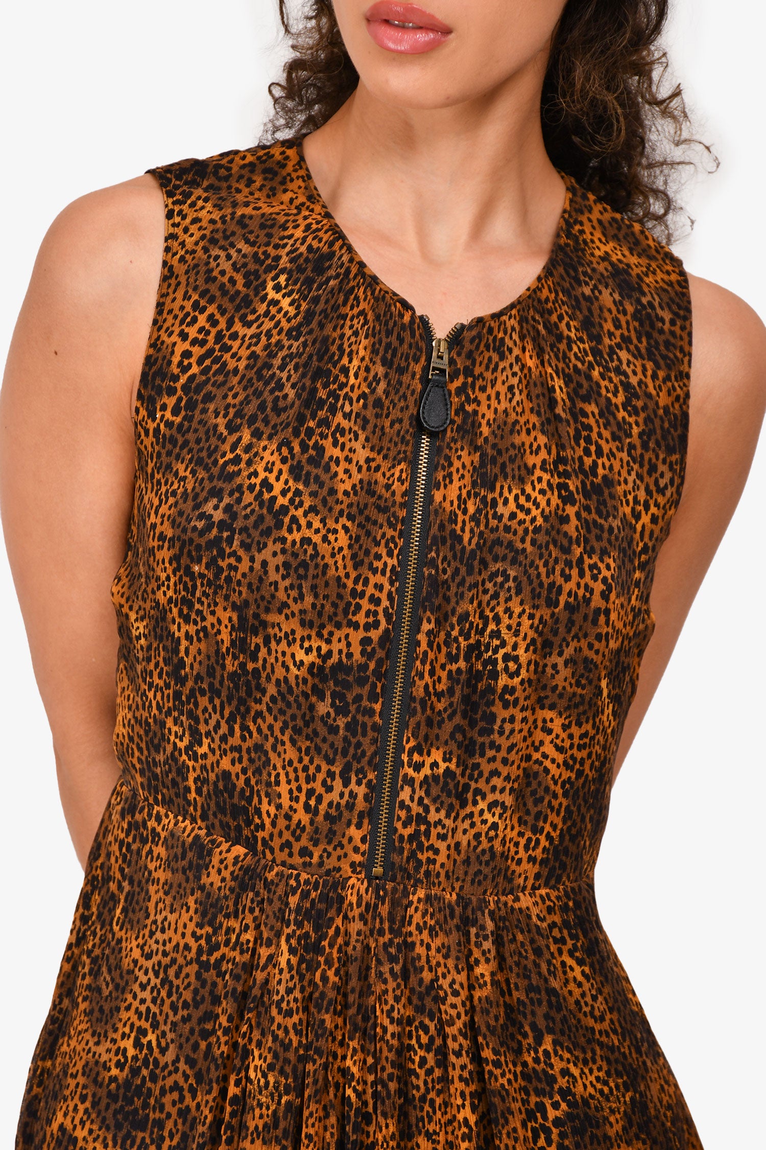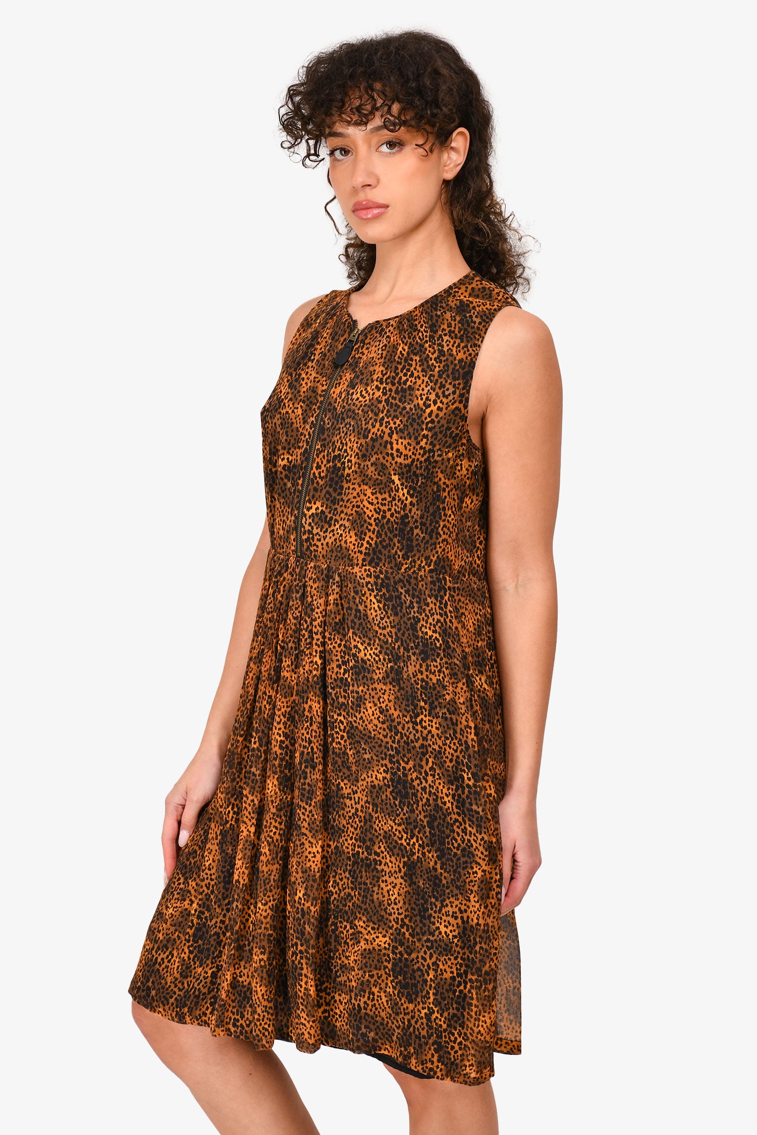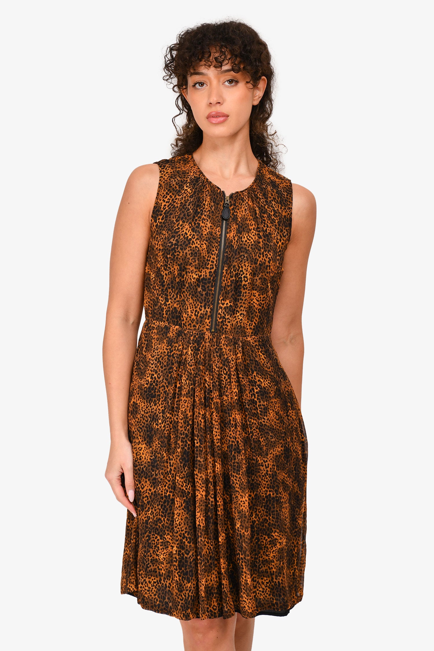 Refresh availabilityBurberry Brit Brown/Black Leopard Zip Detail Sleeveless Dress. Zipped front with a leather pull tab. Side seam zipper. Lined interior. Tonal stitching.