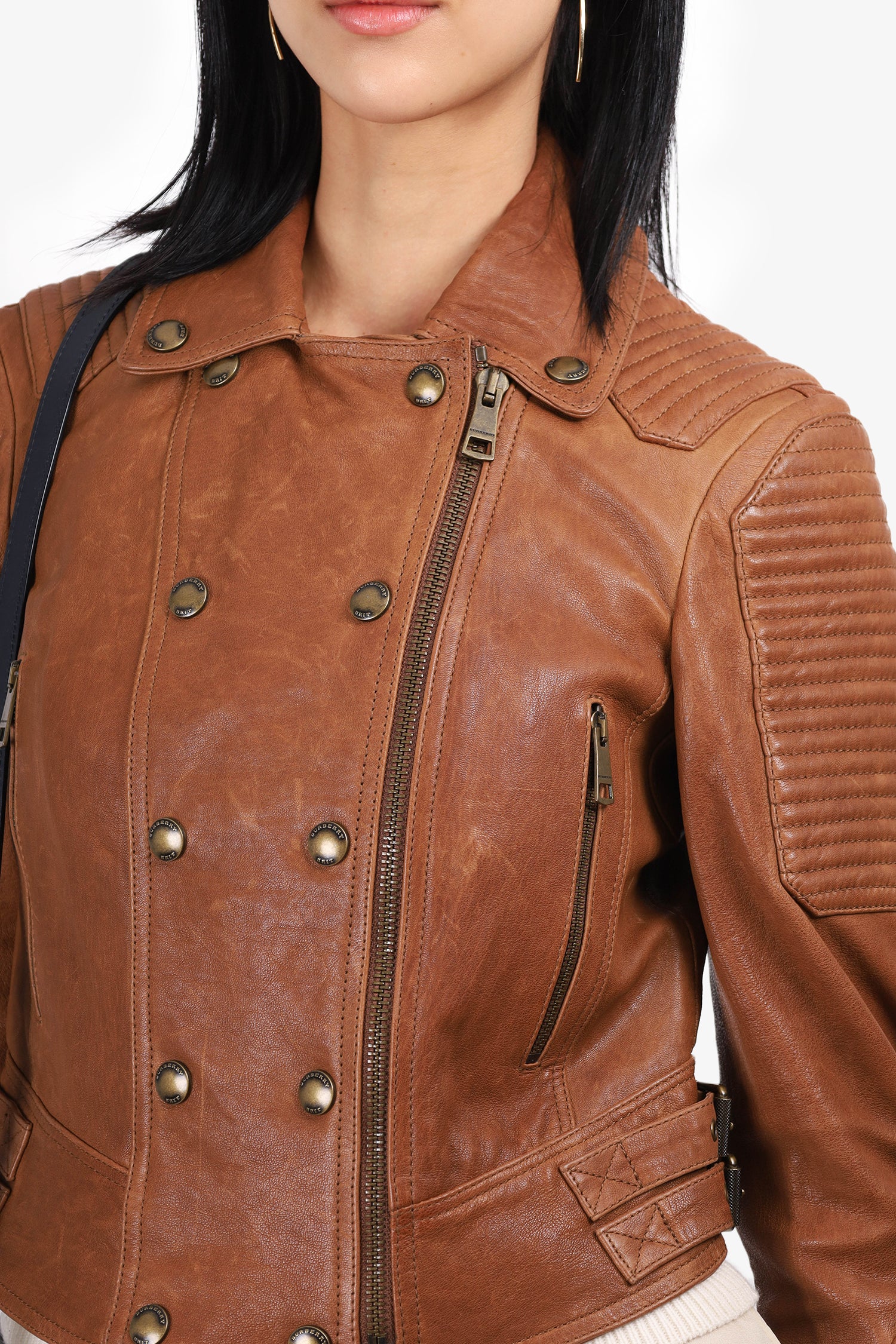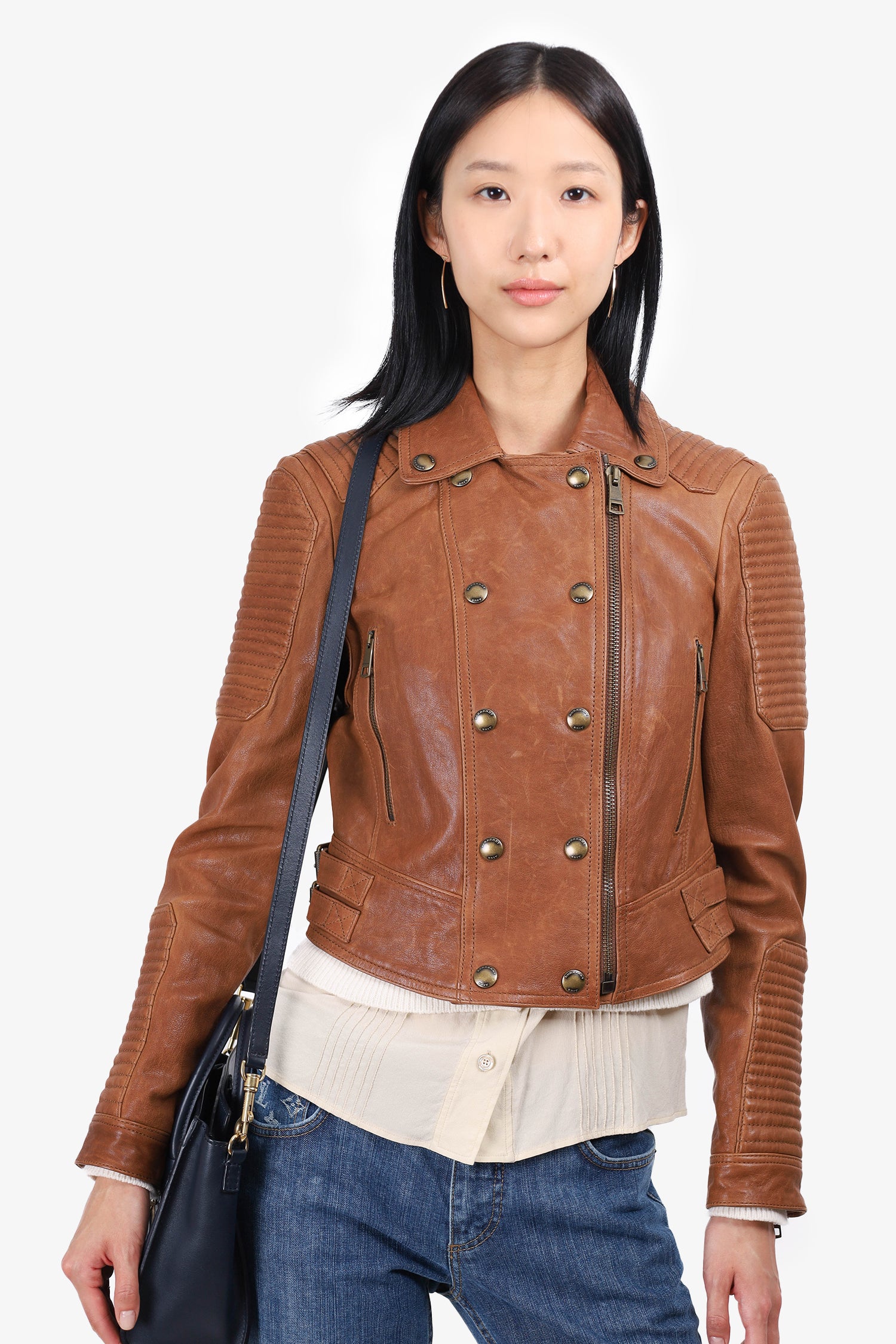 Refresh availabilityBurberry Brit Brown Leather Biker Jacket. Front zip and snap button closure. Front pockets with zip closure. Tonal stitching.