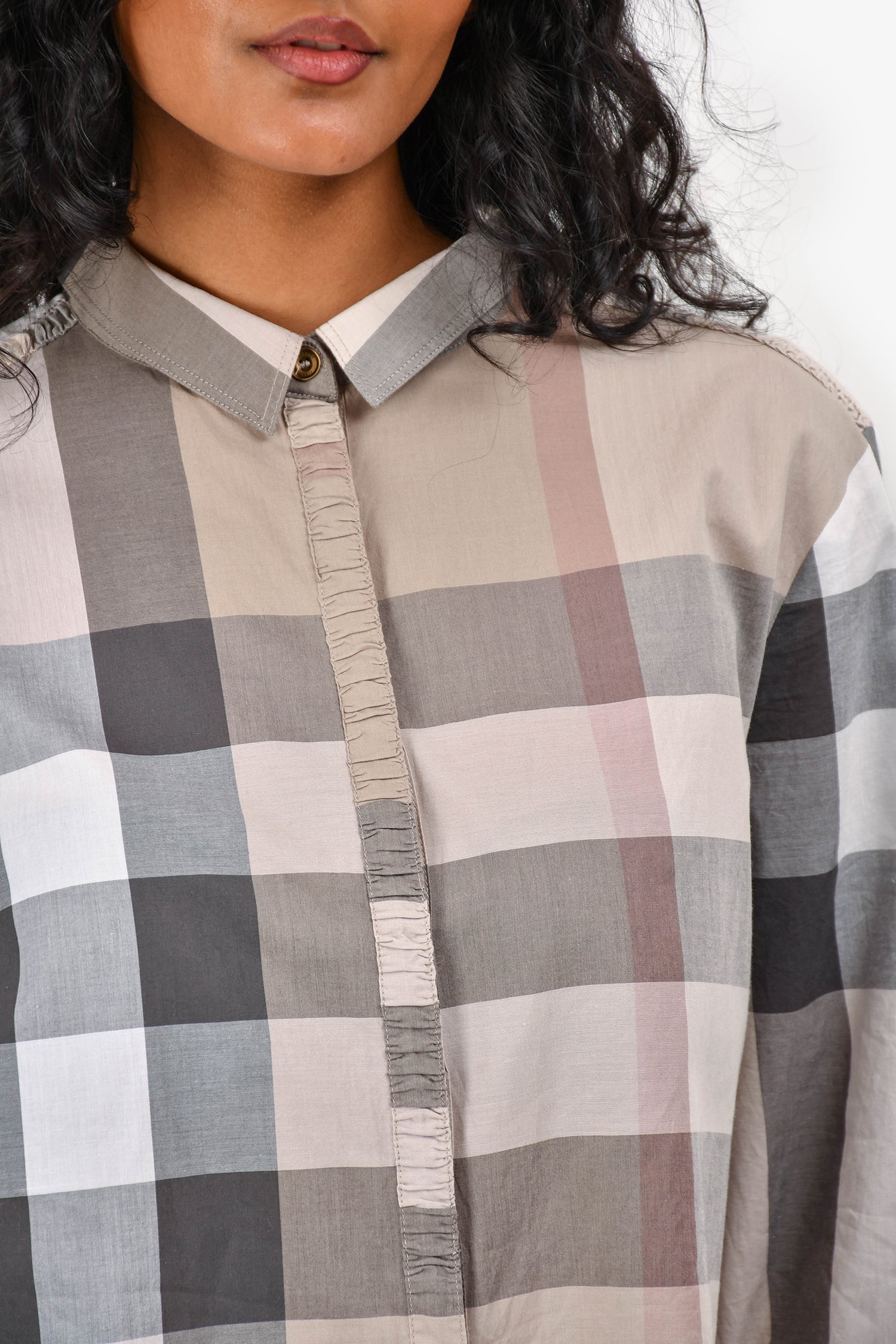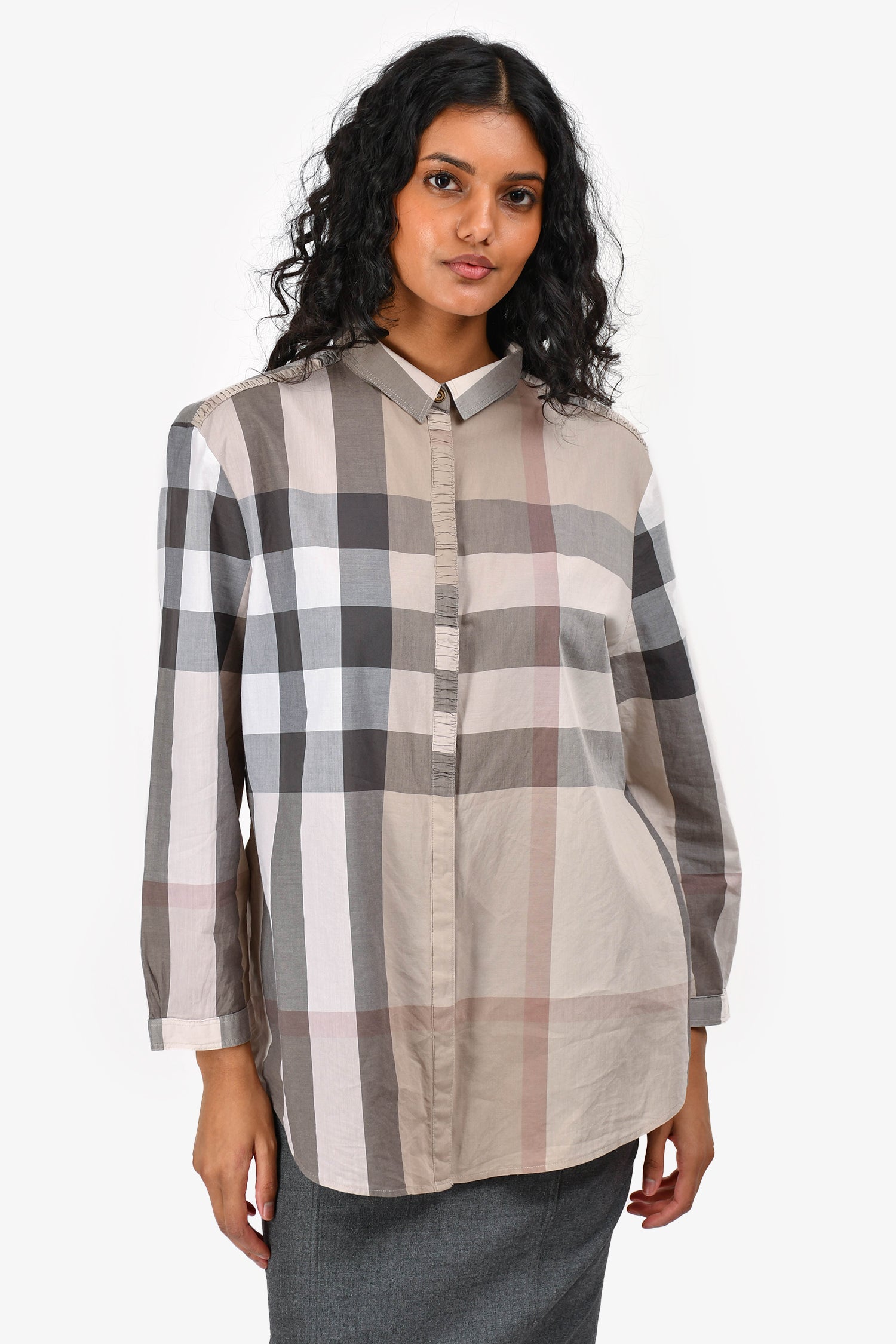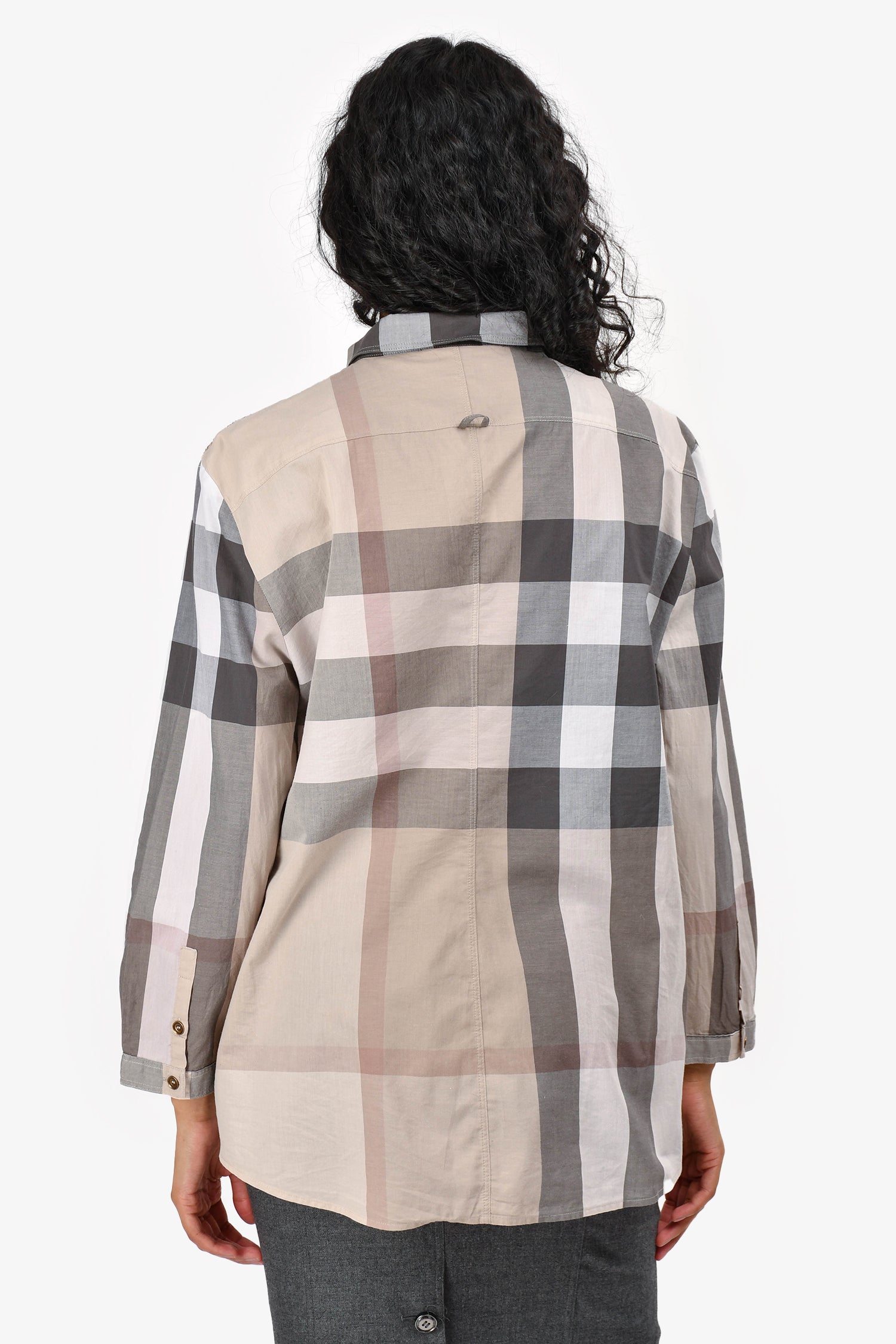 Refresh availabilityBurberry Brit Brown Novacheck Button Down Shirt. Front hidden button-up closure. Buttoned cuffs. Contrast stitching.