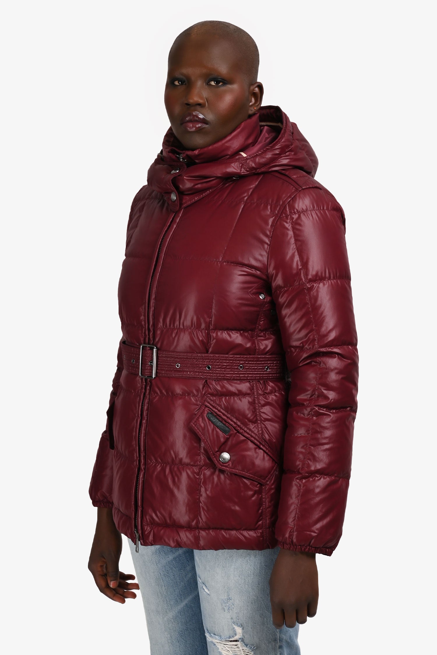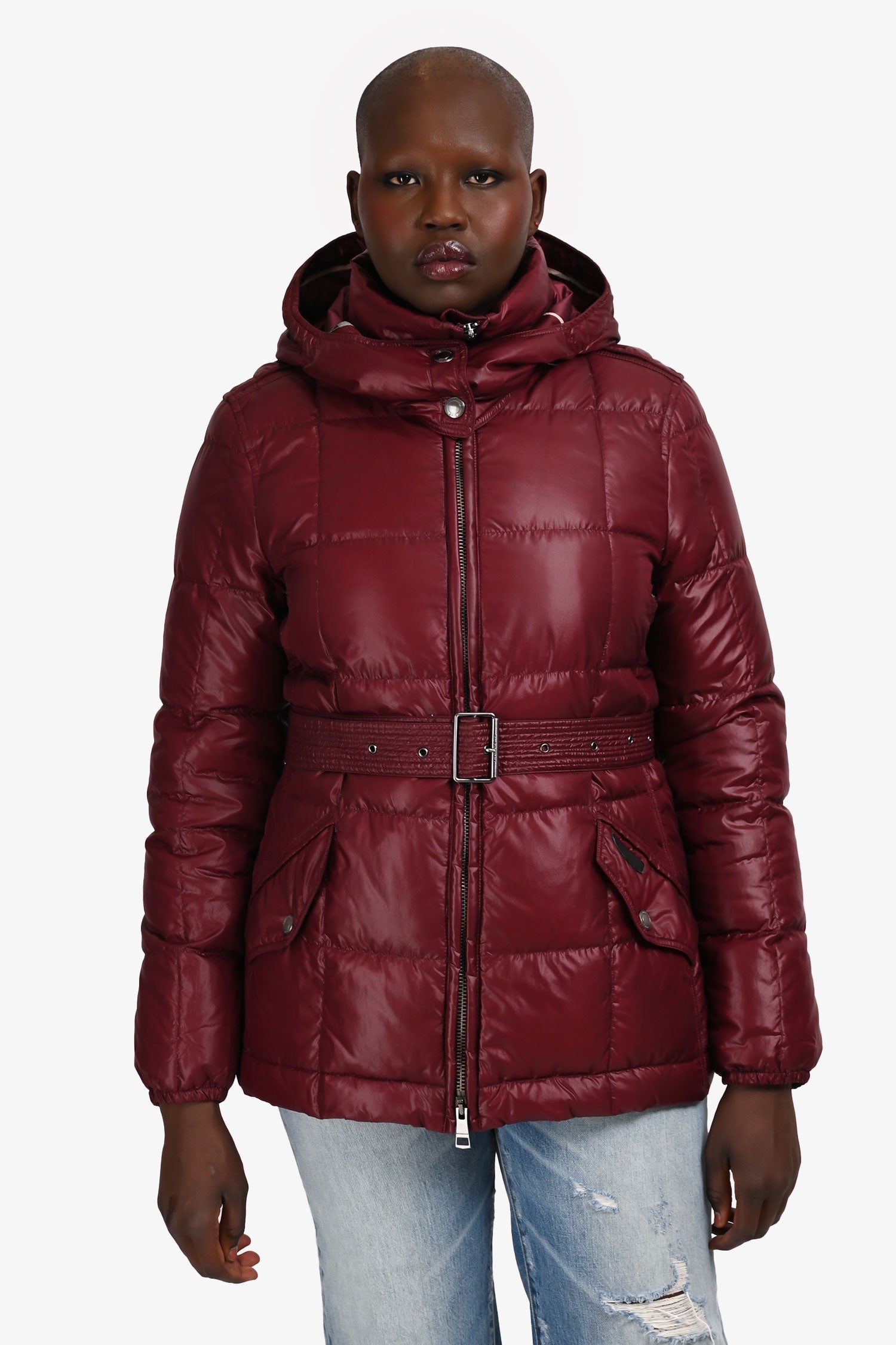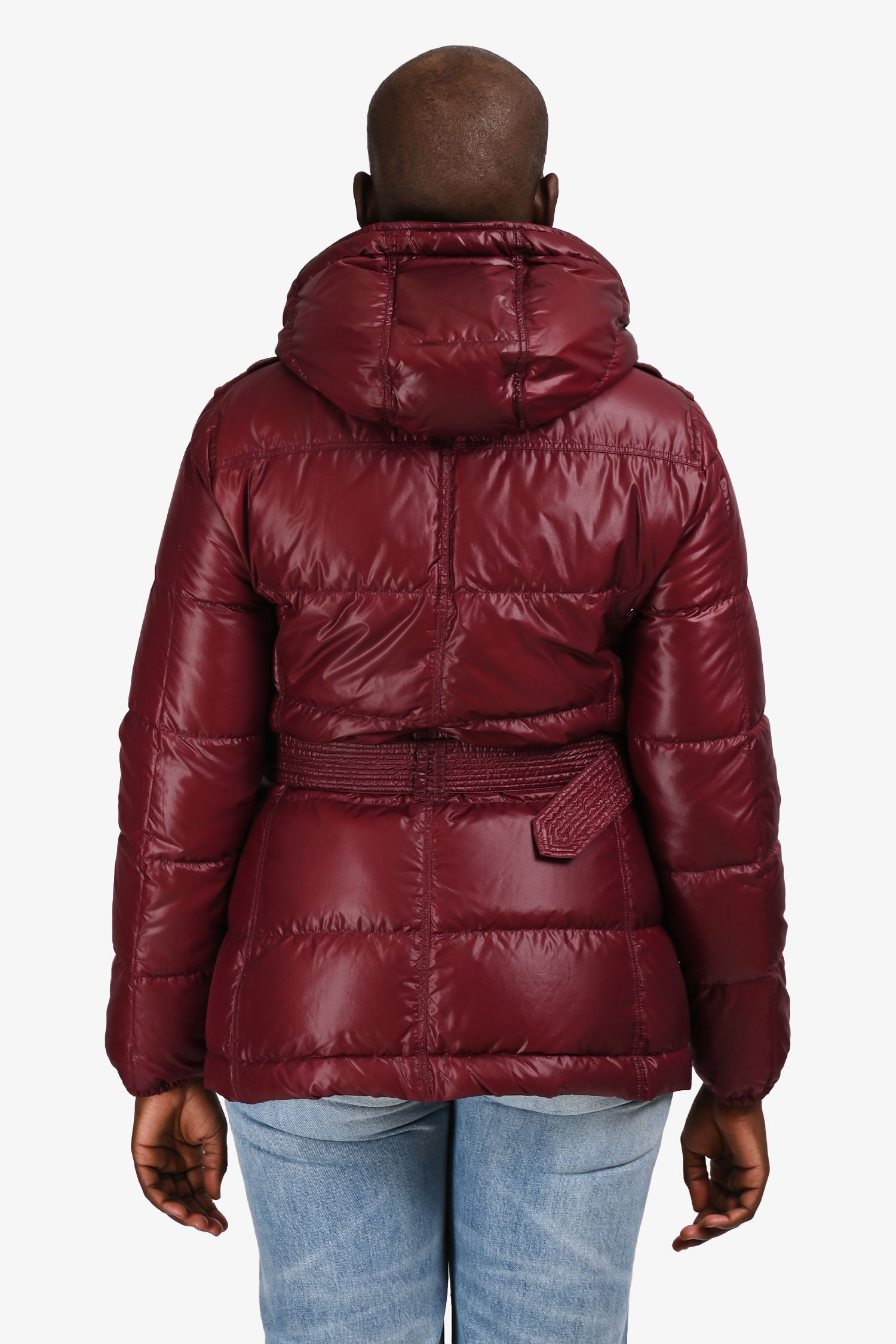 Refresh availabilityBurberry Brit Burgundy Belted Puffer Jacket. Pull-on. Hidden zipper in the front. Detachable hood. 2 exterior slip-in pockets with snap closure. Tonal stitching.