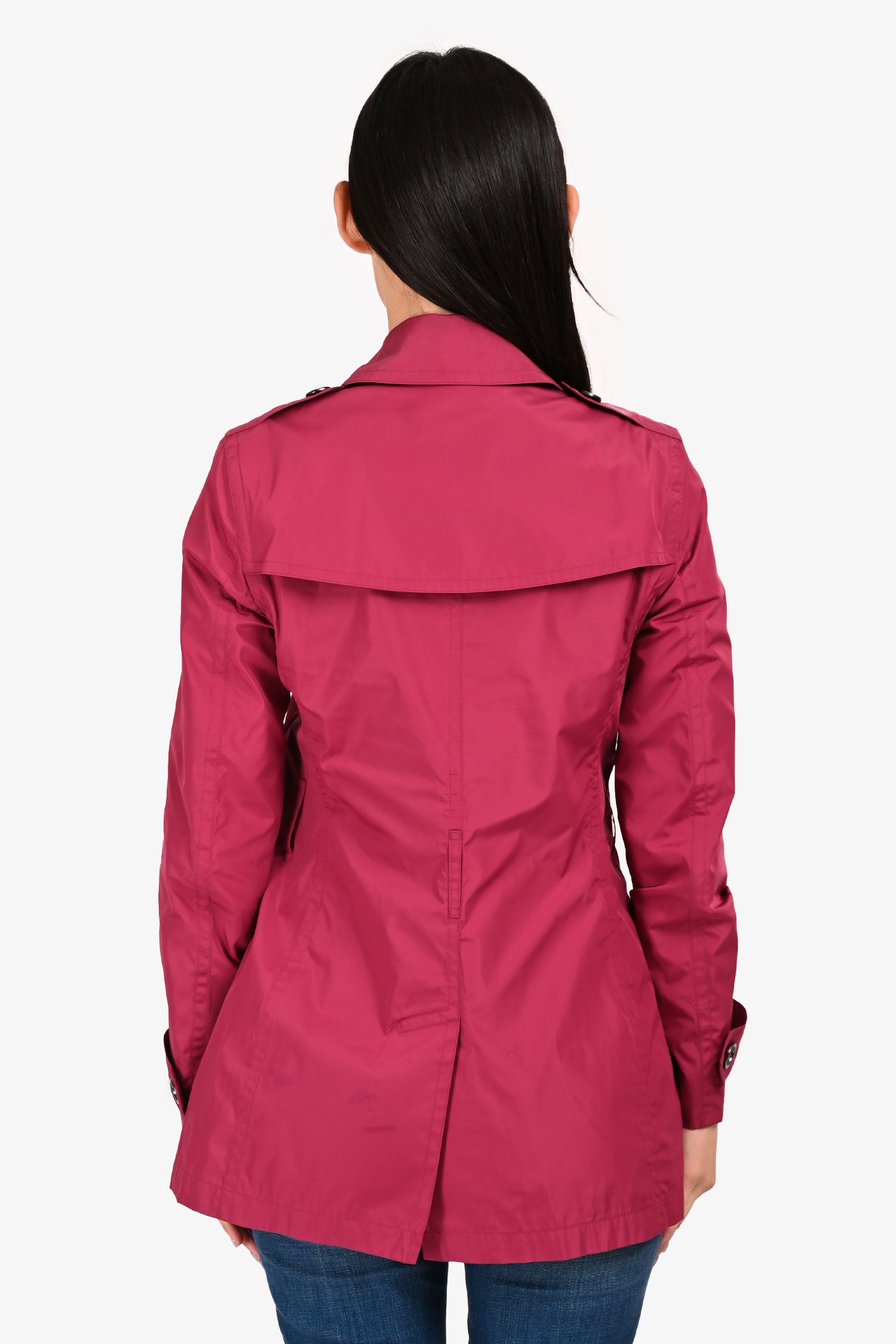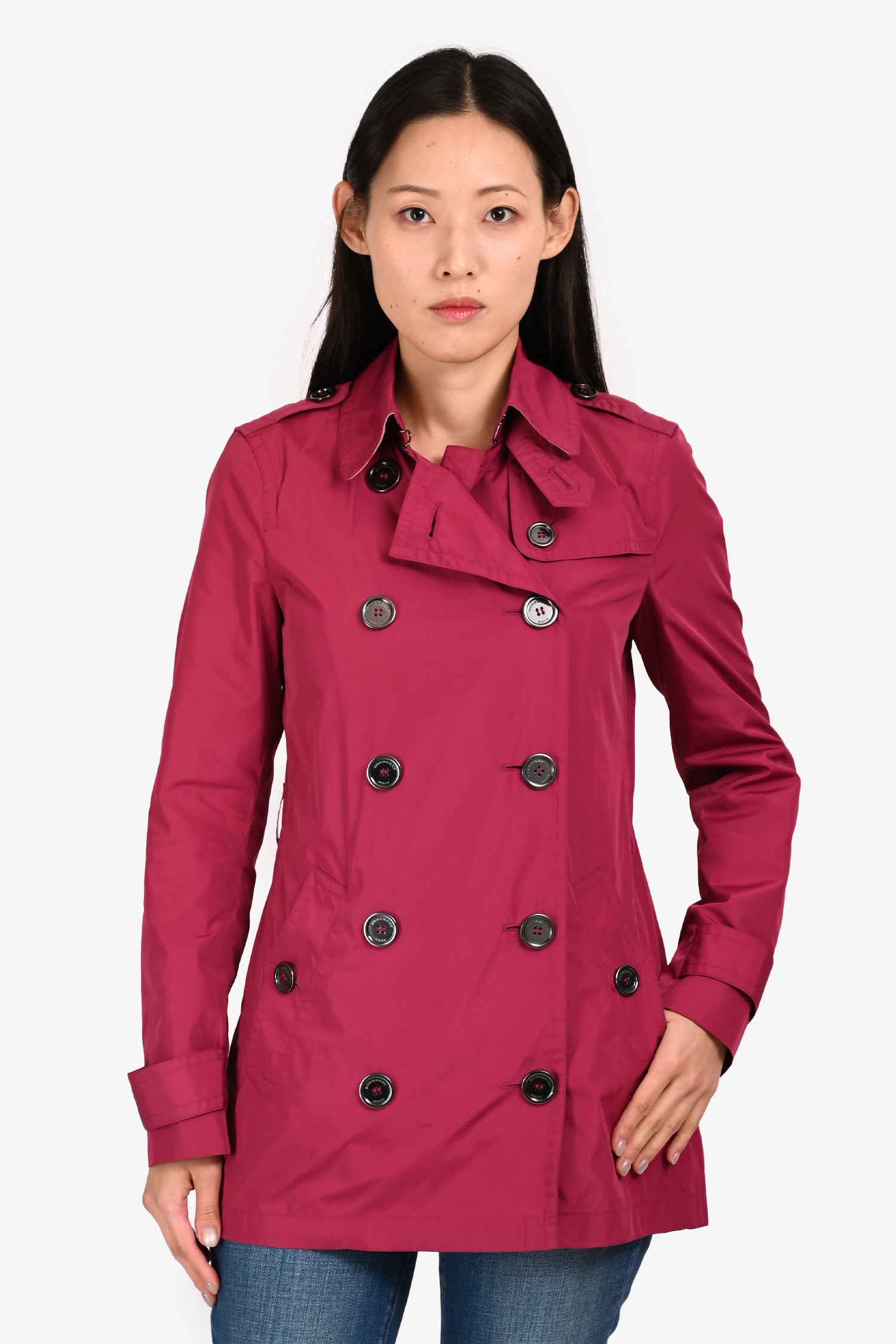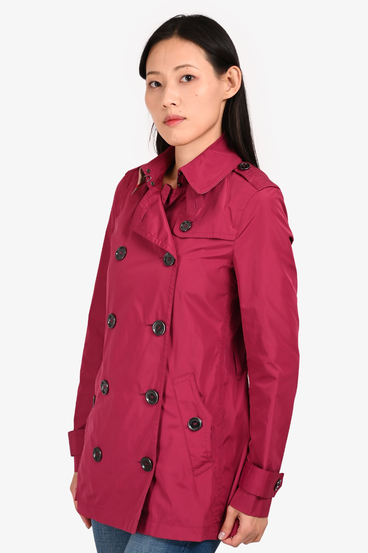 Refresh availabilityBurberry Brit Burgundy Double Breasted Short Trench Coat. Front button-up closure. Collared neckline with hook closure. Front pockets with button closure. Half-lined interior.