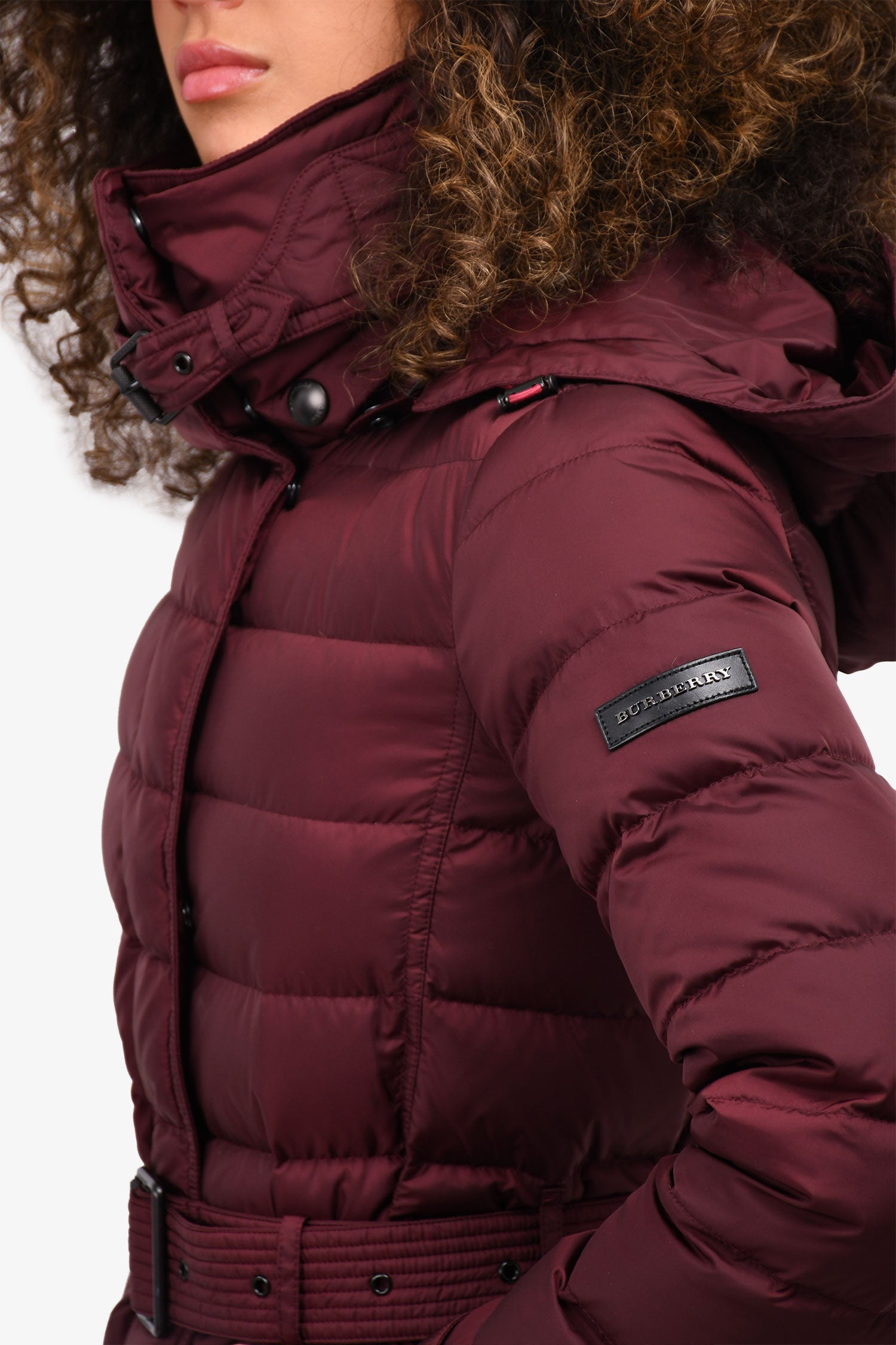 Refresh availabilityBurberry Brit Burgundy Puffer Down Jacket with Belt. Tonal stitching. Zipped closure. Front snap closures. Heritage 'Nova Check' lined interior.