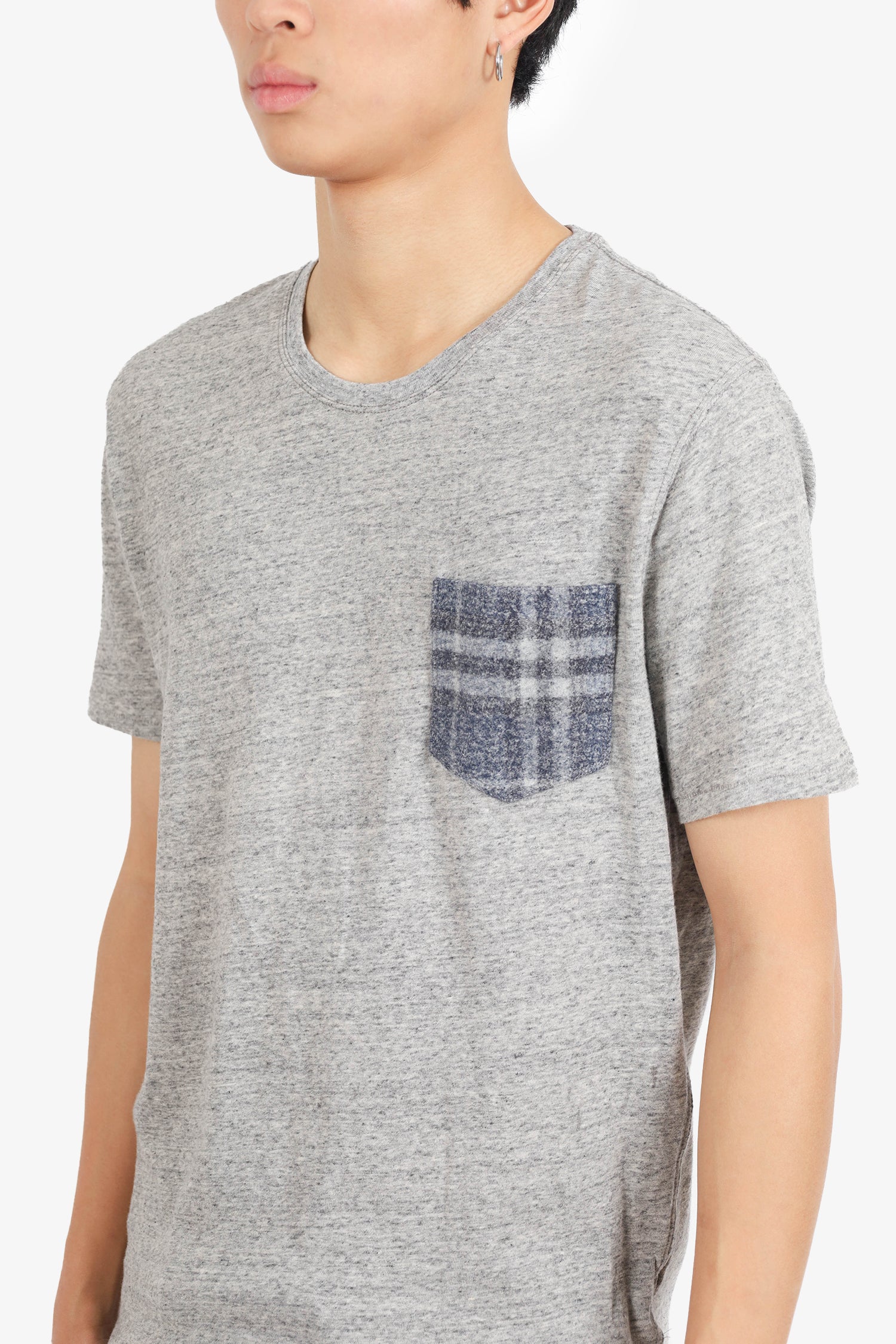 Refresh availabilityBurberry Brit Grey Nova Check Print pocket Detail T-Shirt. Pull on. Round neckline. Front slip pocket on left side. Tonal stitching.