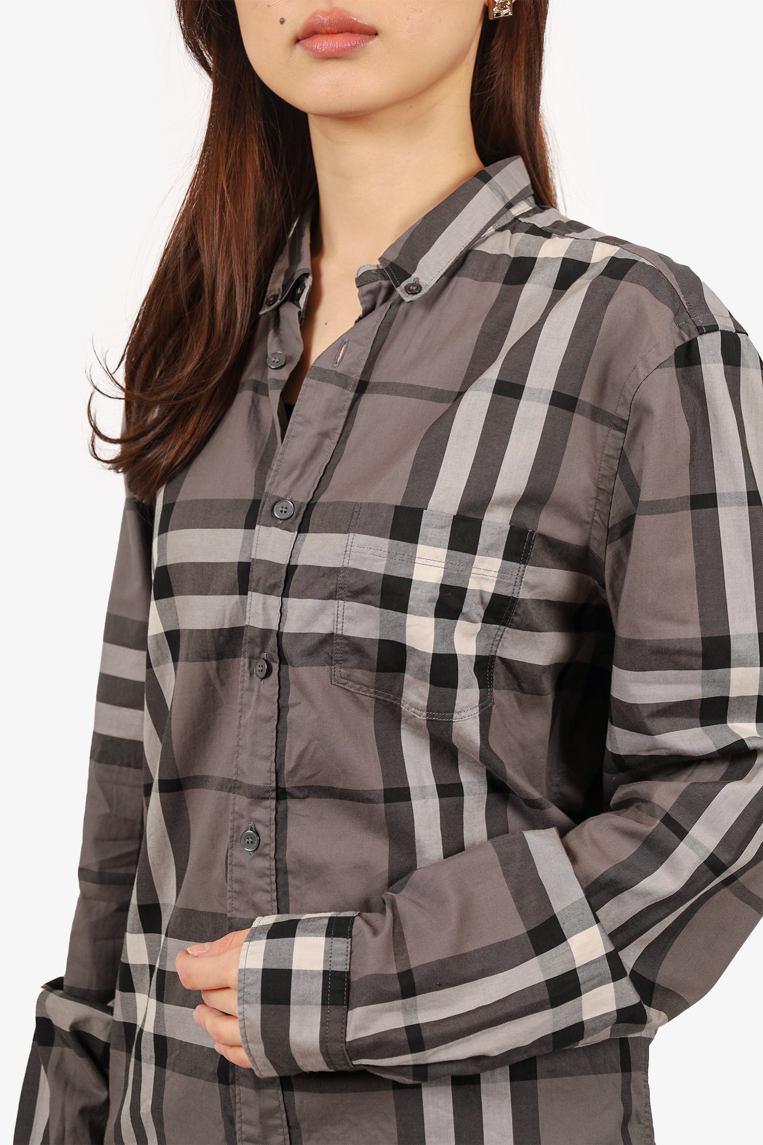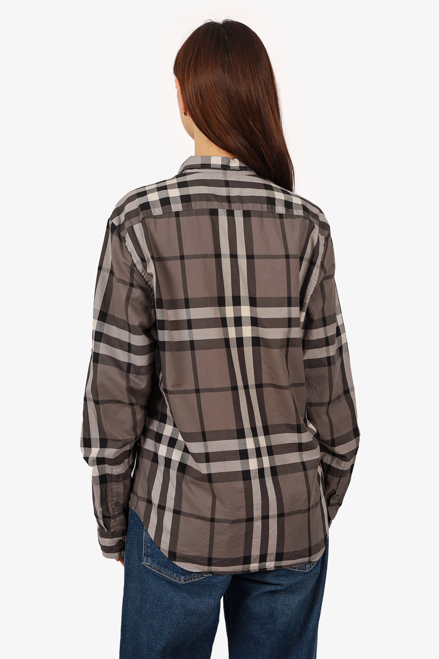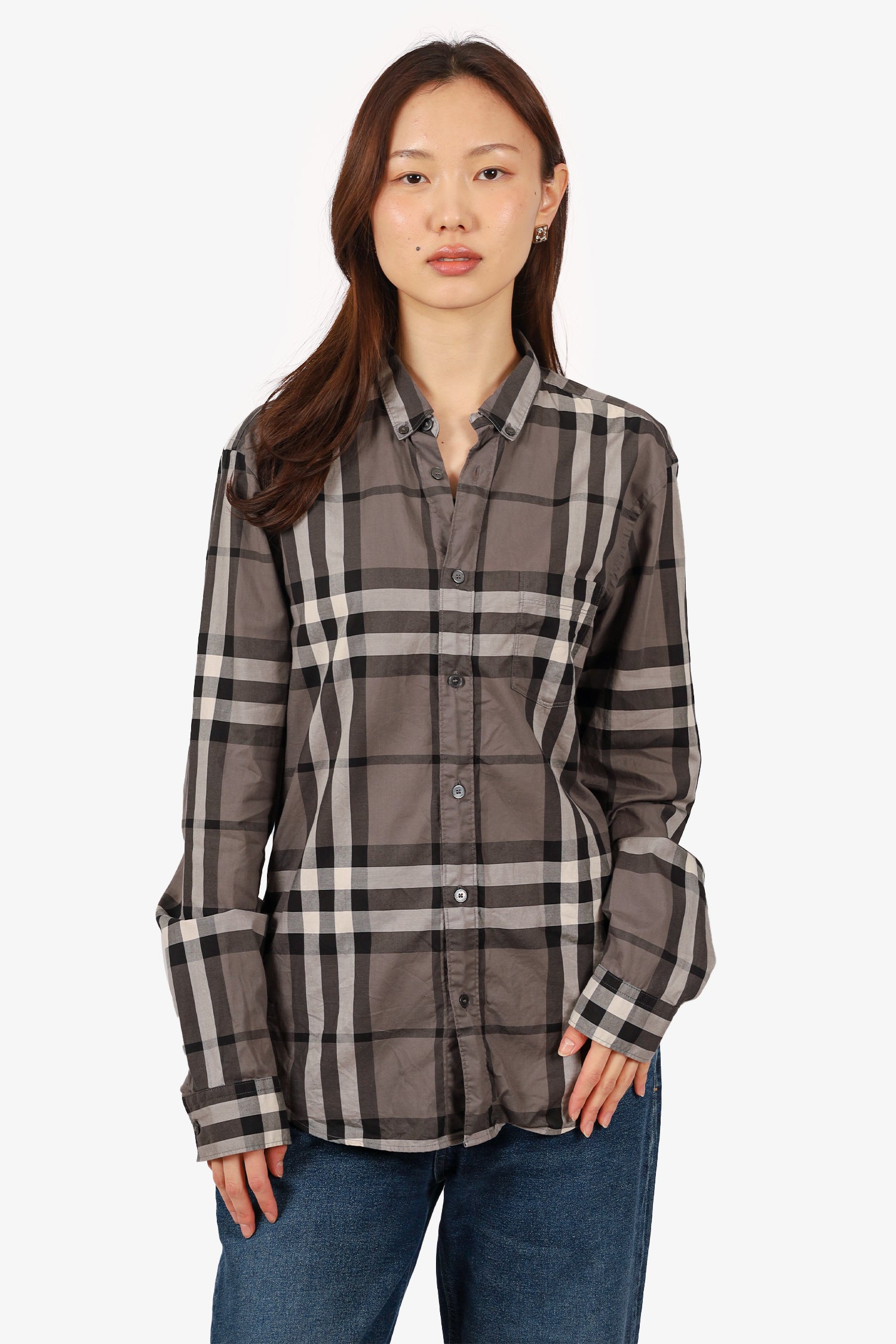 Refresh availabilityBurberry Brit Grey/White Checked Shirt. Front button up closure. Front slip pocket on left side of chest. Tonal stitching.