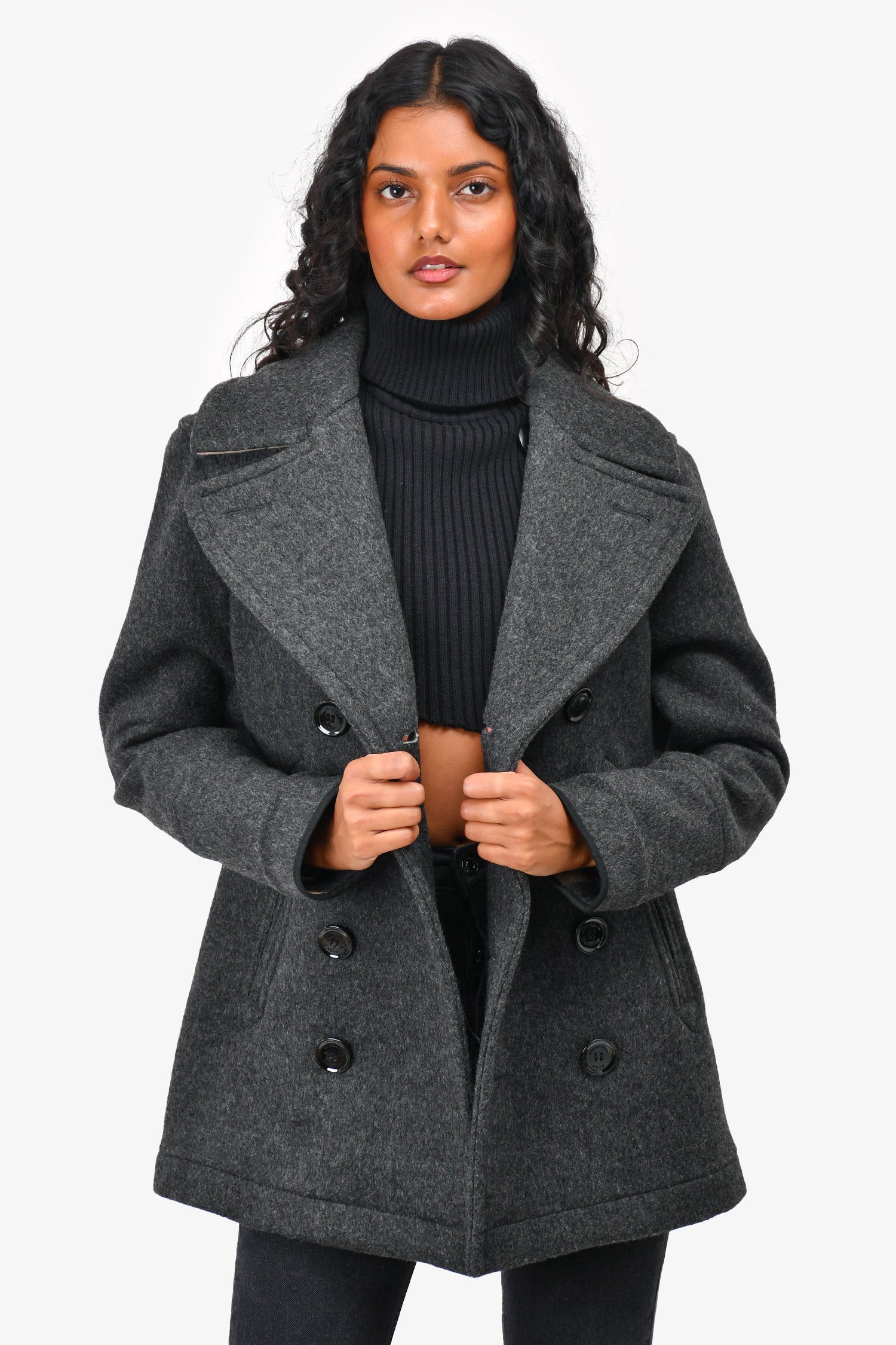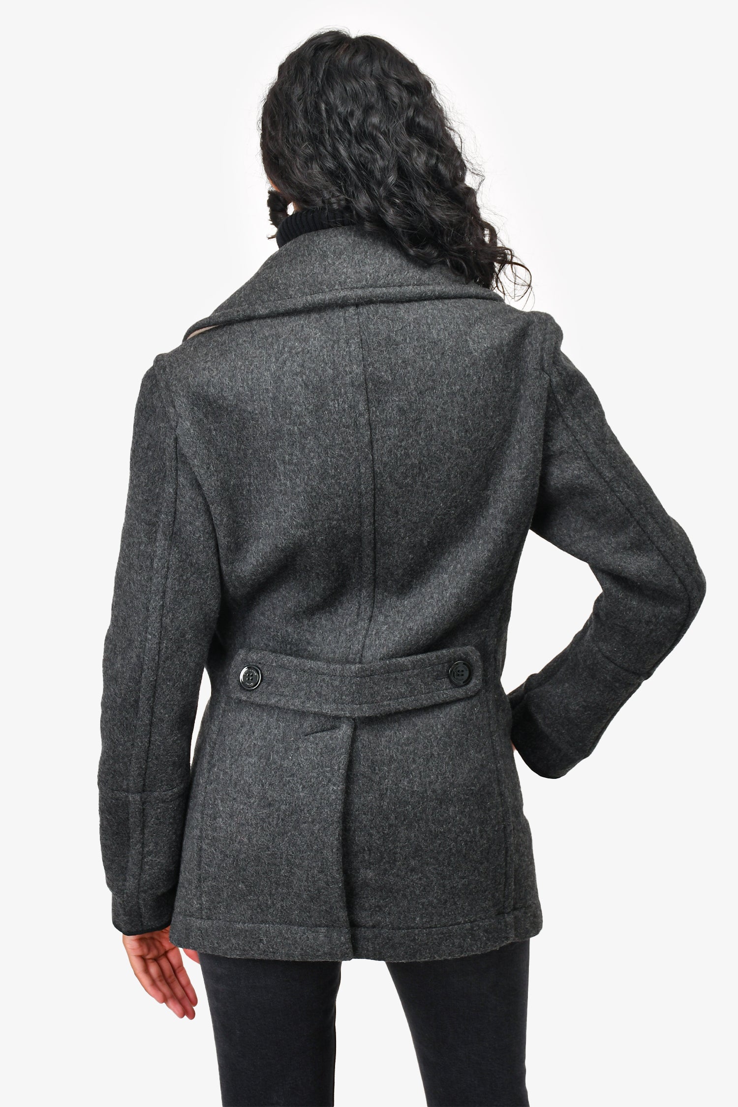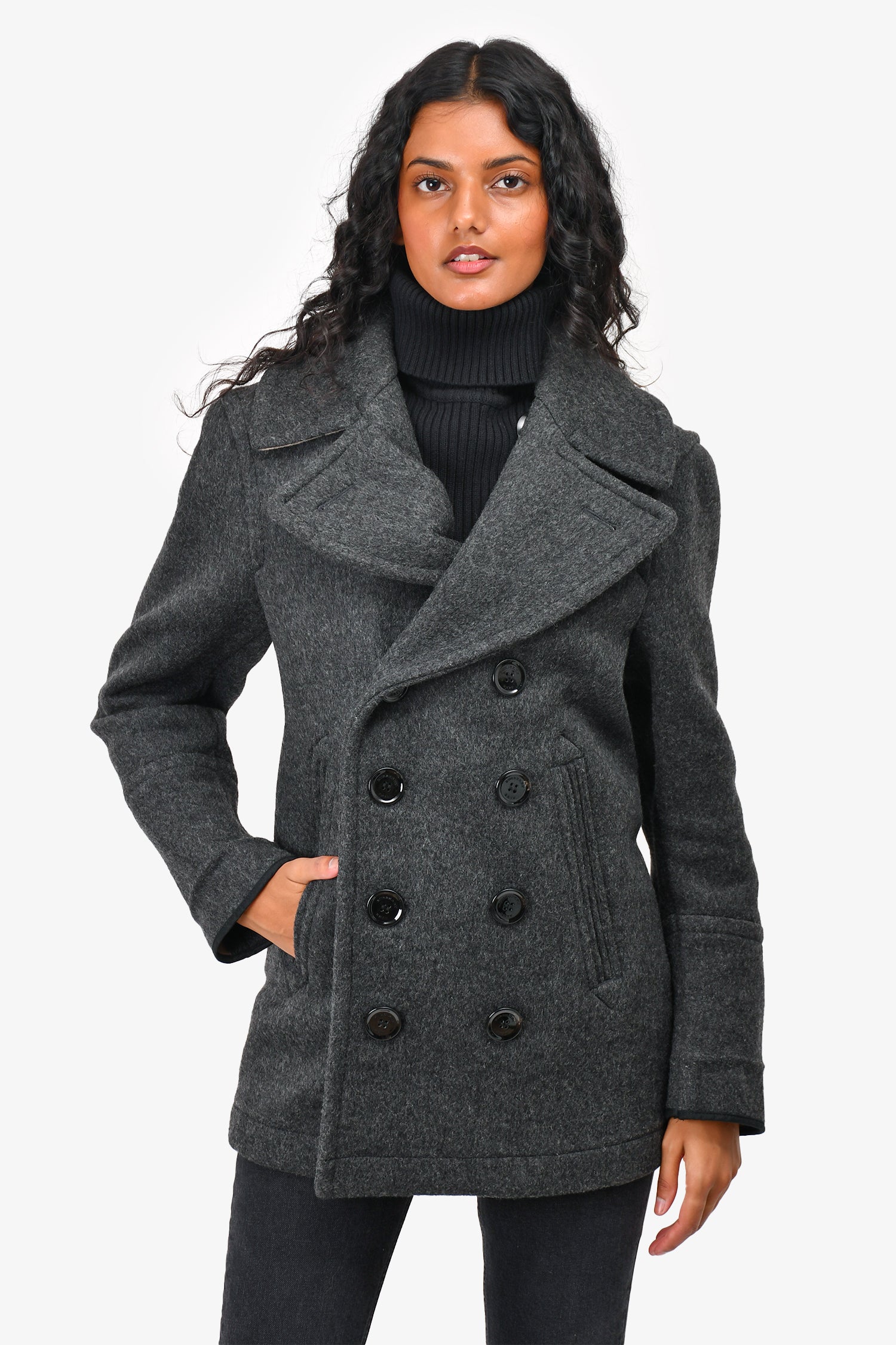 Refresh availabilityBurberry Brit Grey Wool Double Breasted Short Coat. Front button up closure. Side slip pocket. Interior checkered pattern. Tonal stitching.