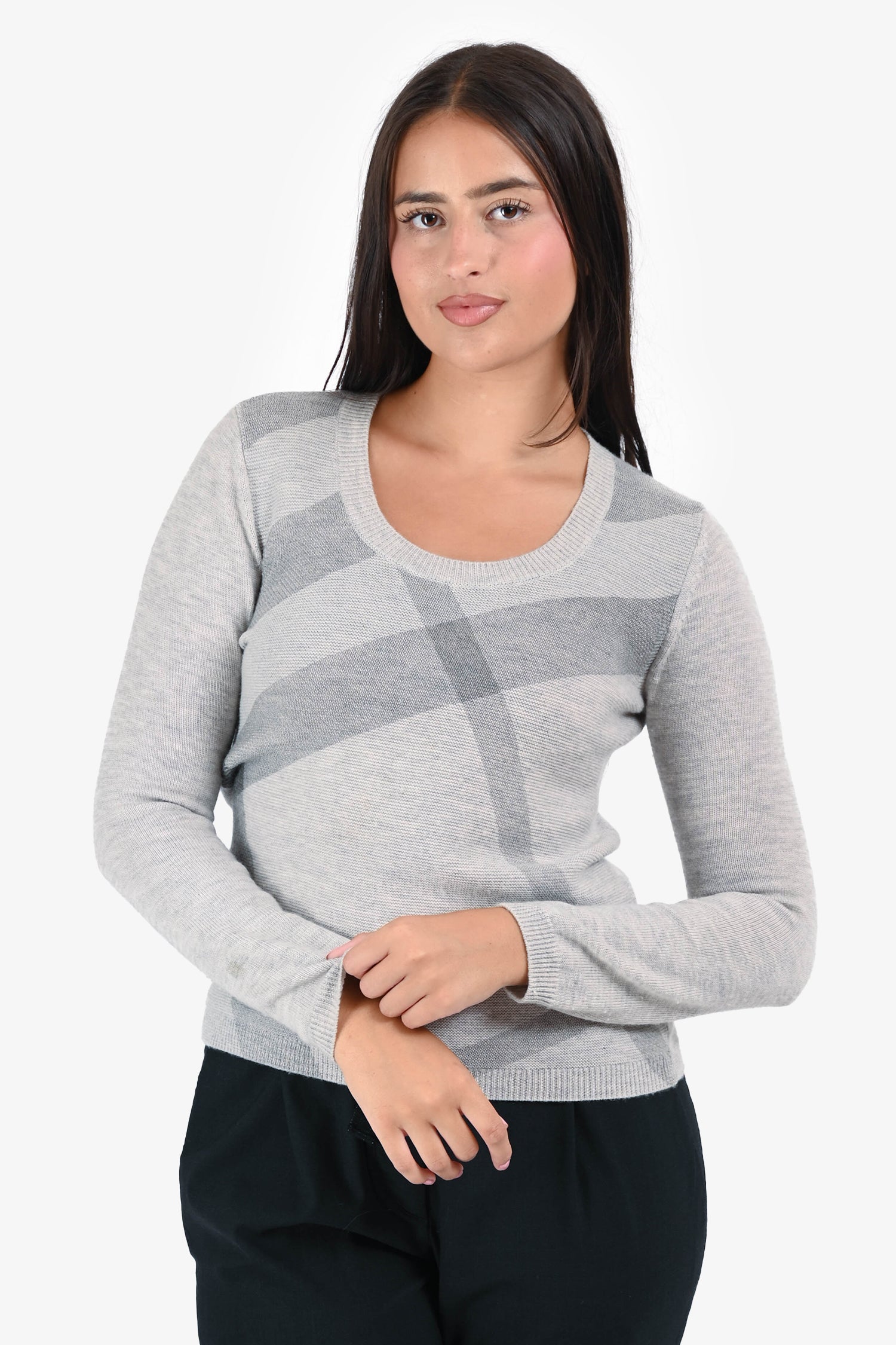 Refresh availabilityBurberry Brit Grey Wool Tartan Sweater. Crew neckline. Long sleeves. Ribbed cuffs and hem. Pull-on. Tonal stitching.