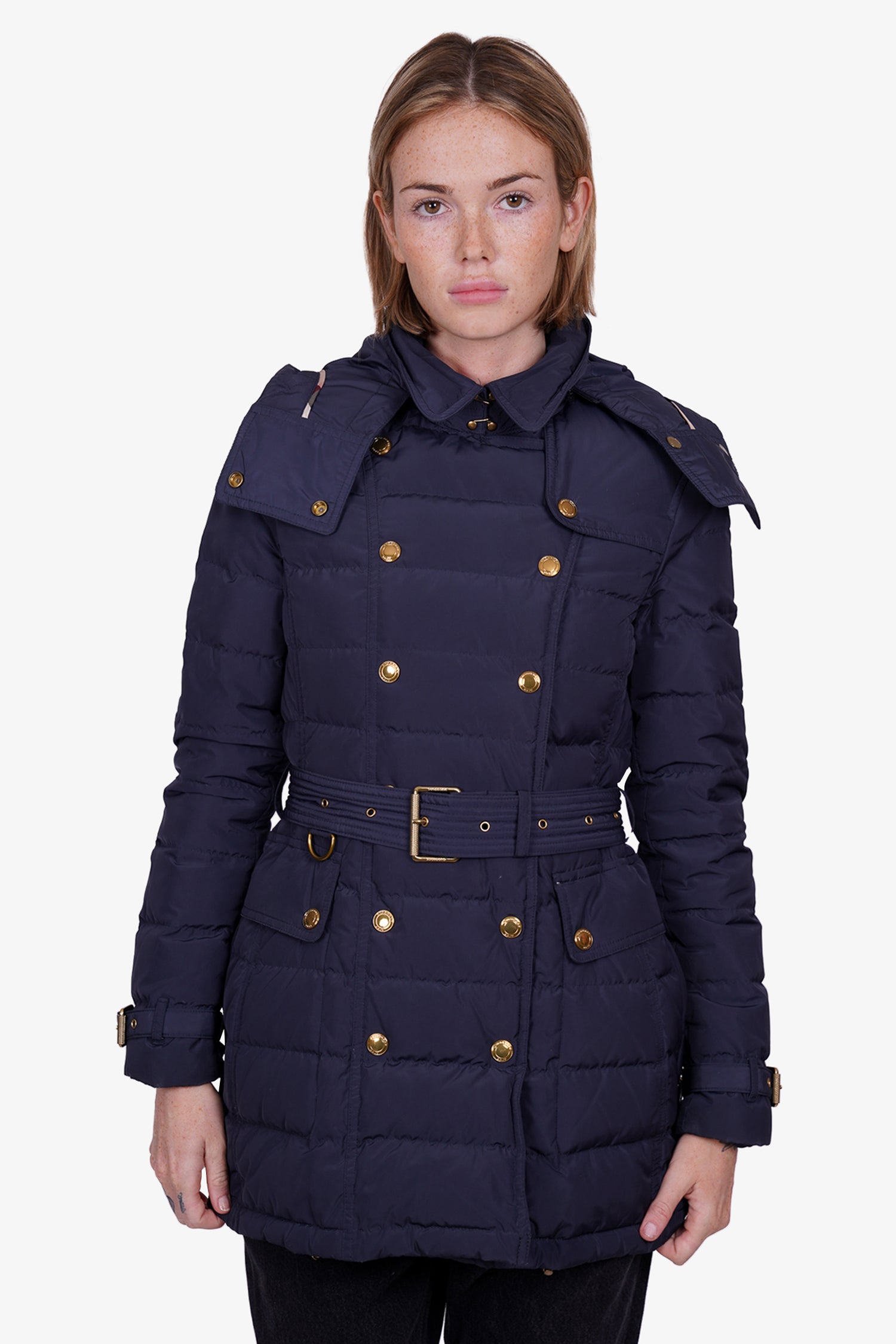 Refresh availabilityBurberry Brit Navy Blue Down Puffer Coat with Belt. Hooded neckline with Zip removable. Front zip and snap closure. Buckle detail on sleeves. Gold-toned hardware. Zip and flap side pockets. Tonal stitching.