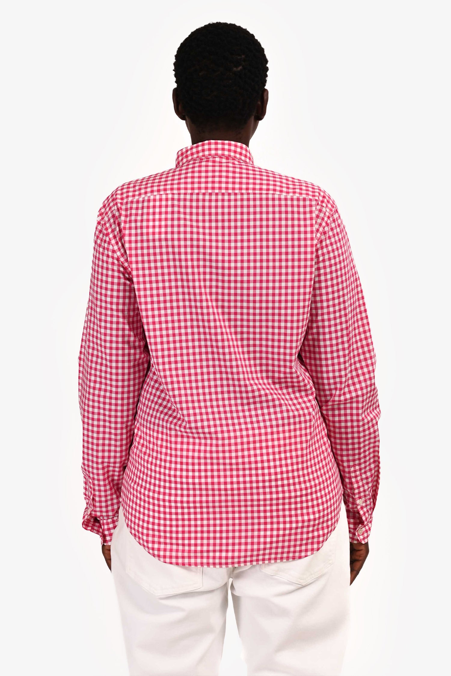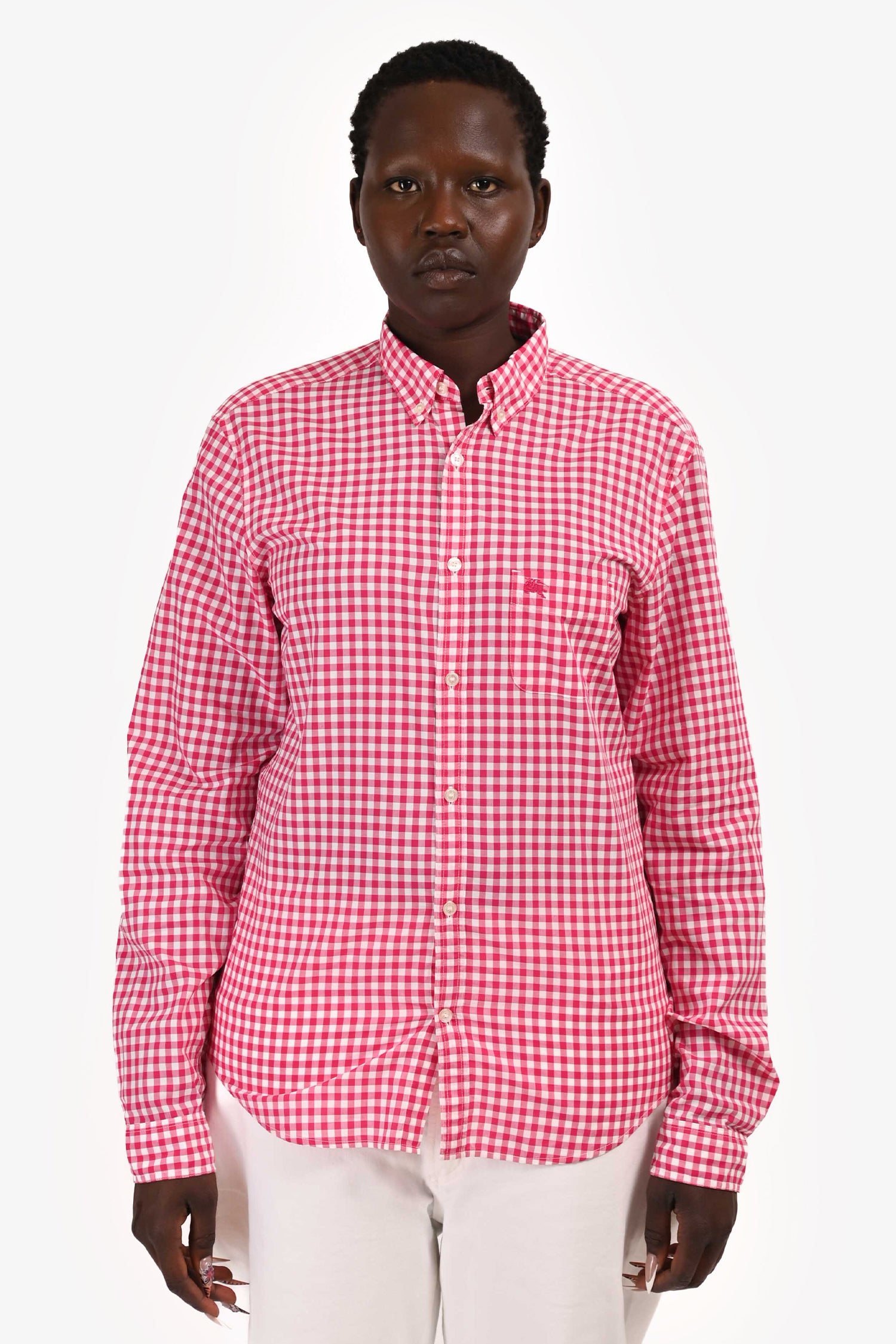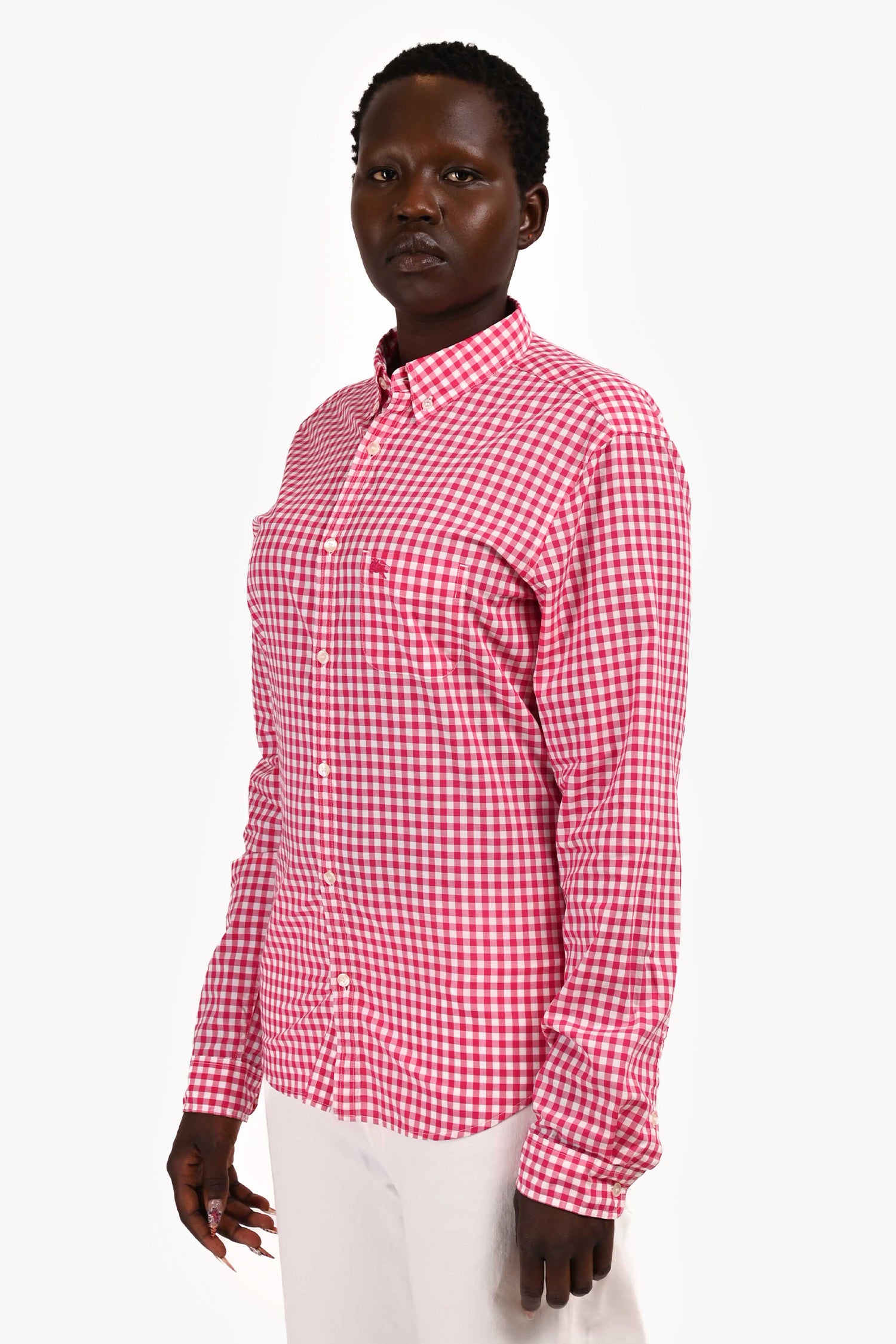 Refresh availabilityBurberry Brit Pink/White Gingham Check Button Up Shirt. Front button placket. Buttoned cuffs. Long sleeves. Tonal stitching.